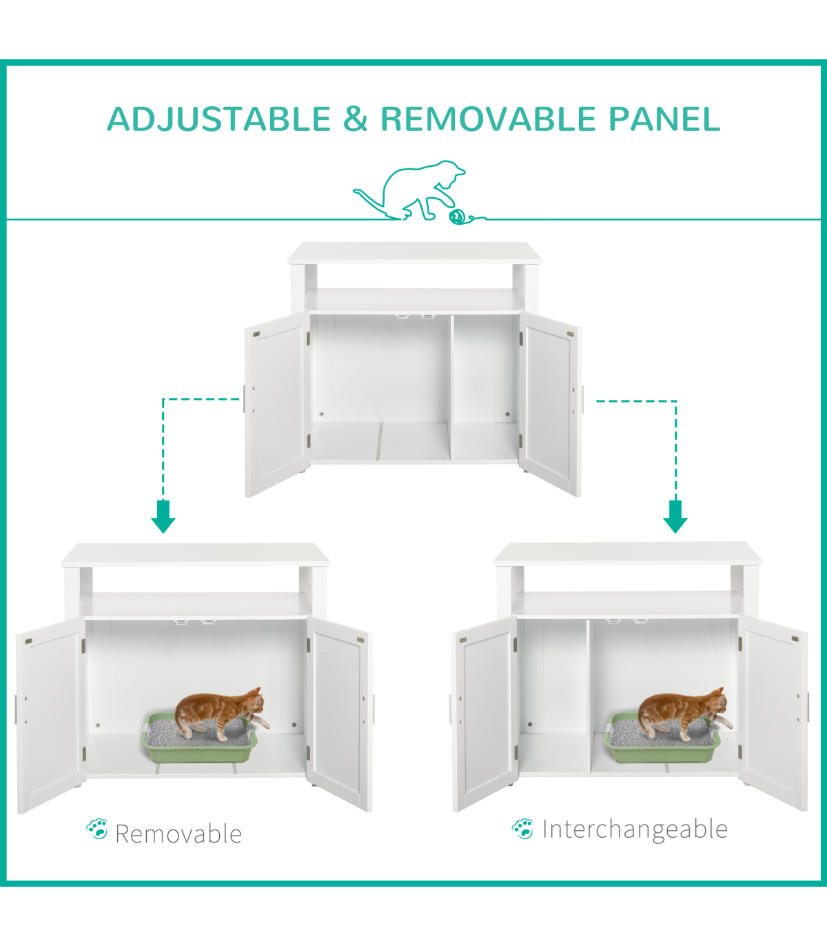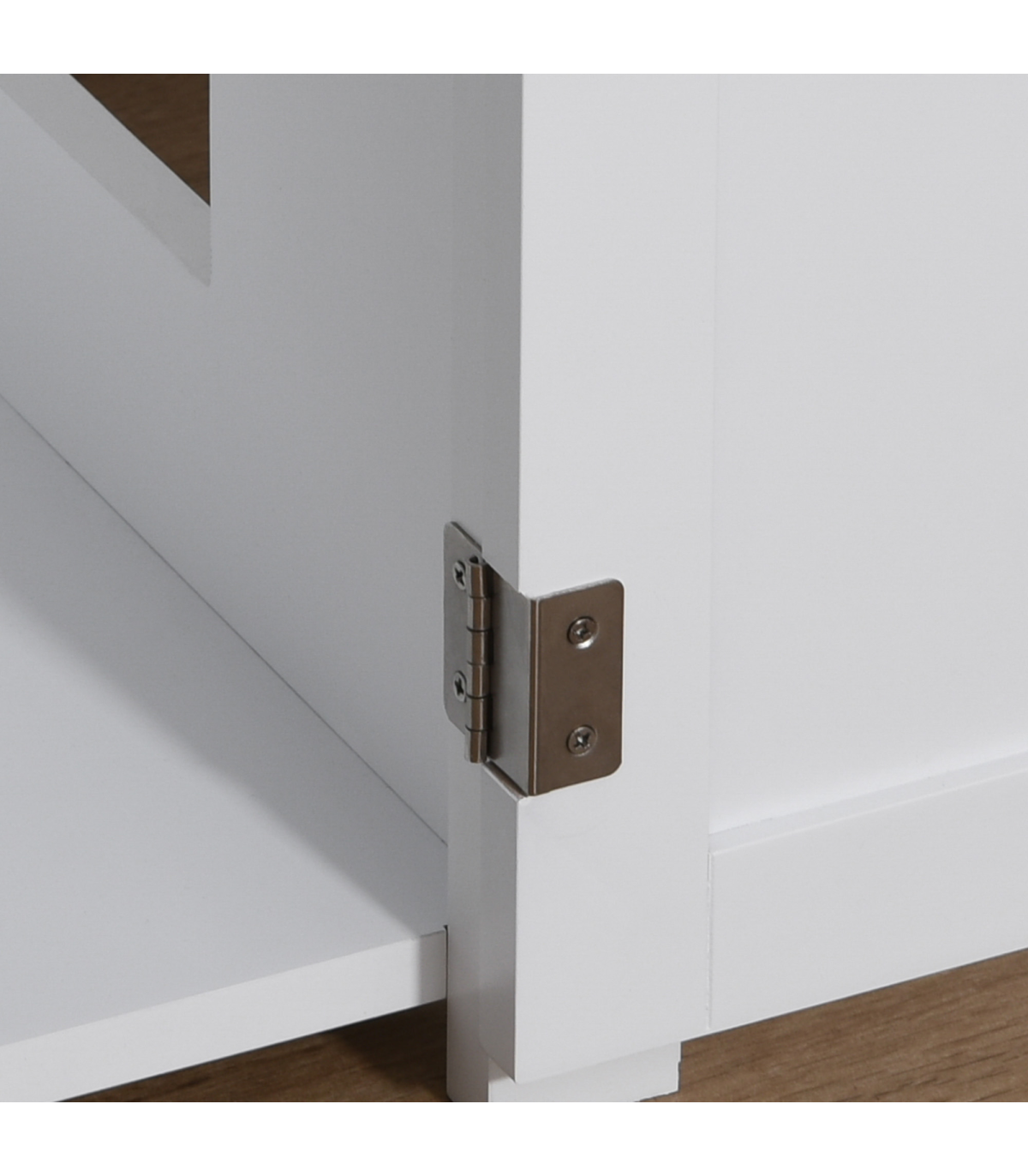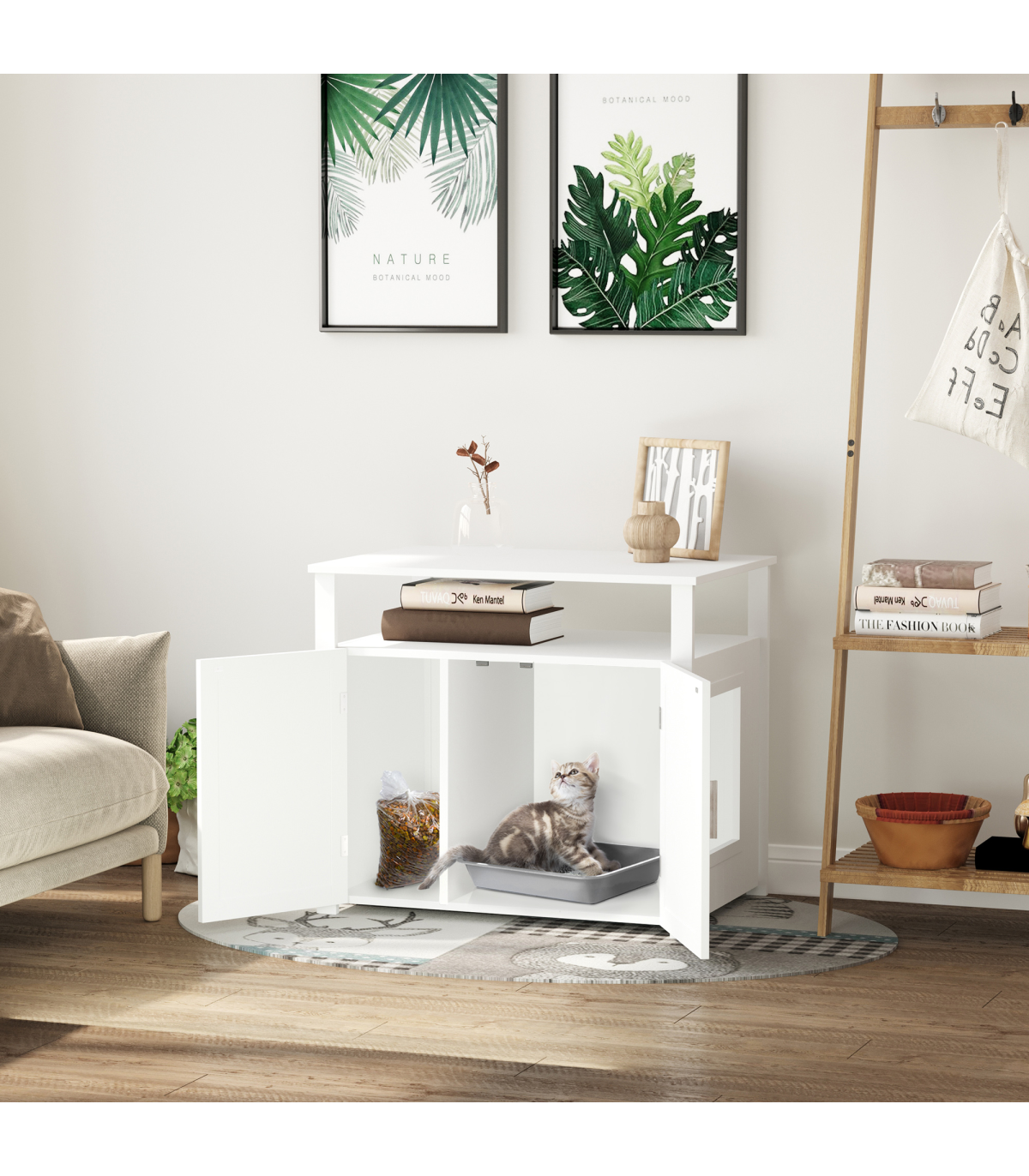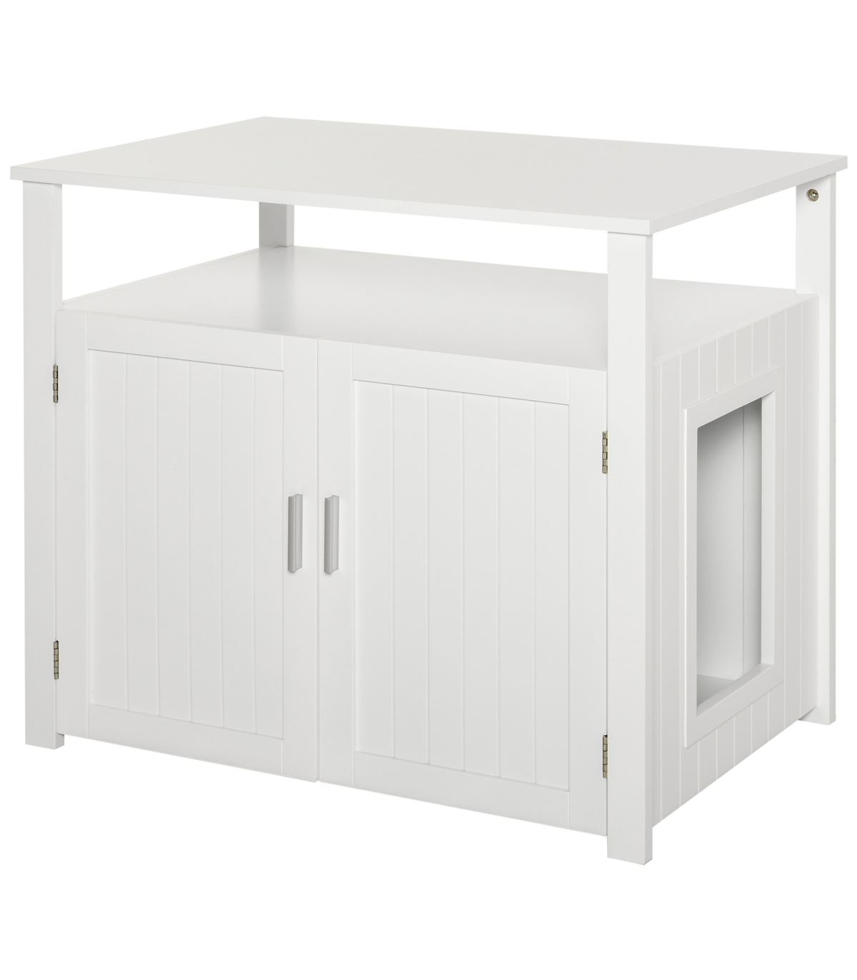 - Can be used as a cat furniture/litter house, with two shelves on top for handy storage - Large enough for most litter trays - Cut-out side entrance for kittens/cats to access inside easily. Front two doors for you to get inside easily - Inside dividing wall can be removed - MDF structure of this cat litter toilet is sturdy and durable, with smooth protective coating - Maximum load 15kg, assembly required