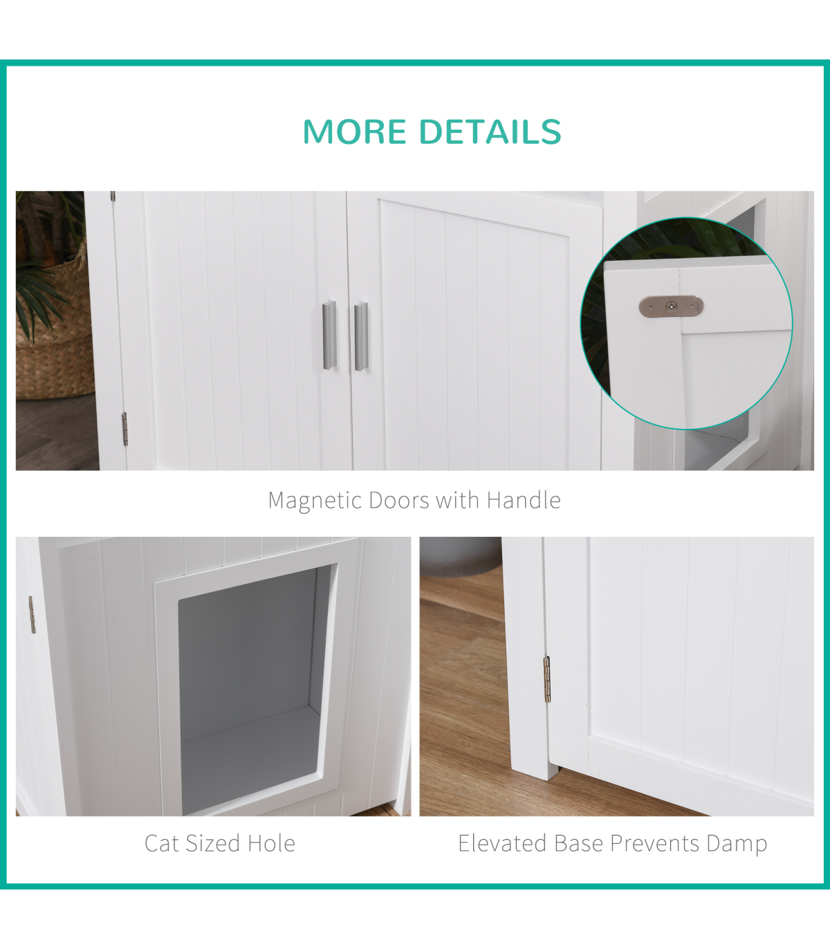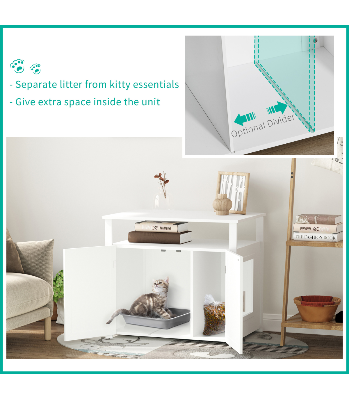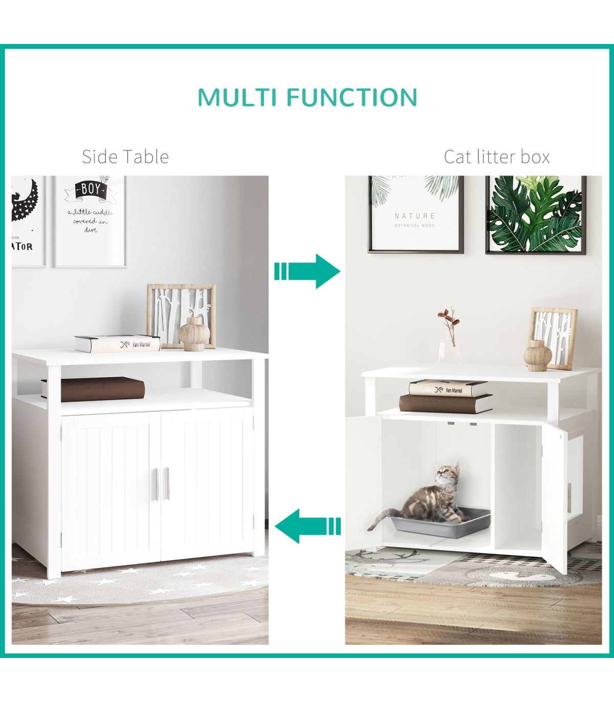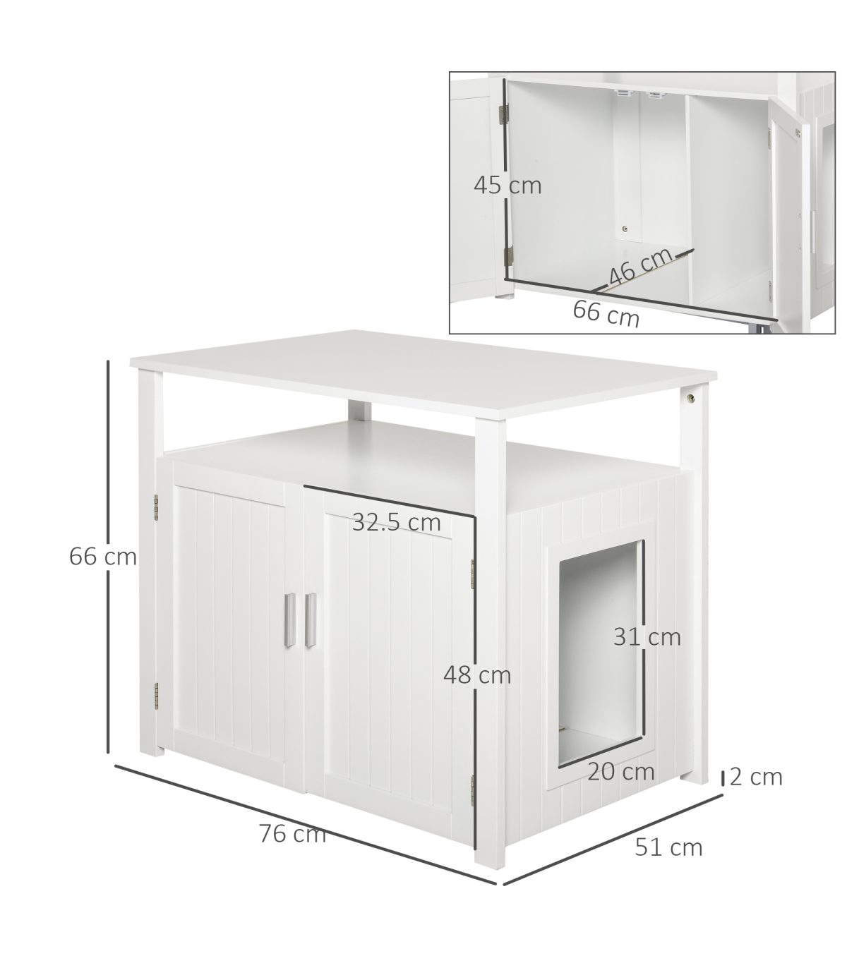 - Can be used as a cat furniture/litter house, with two shelves on top for handy storage - Large enough for most litter trays - Cut-out side entrance for kittens/cats to access inside easily. Front two doors for you to get inside easily - Inside dividing wall can be removed - MDF structure of this cat litter toilet is sturdy and durable, with smooth protective coating - Maximum load 15kg, assembly required