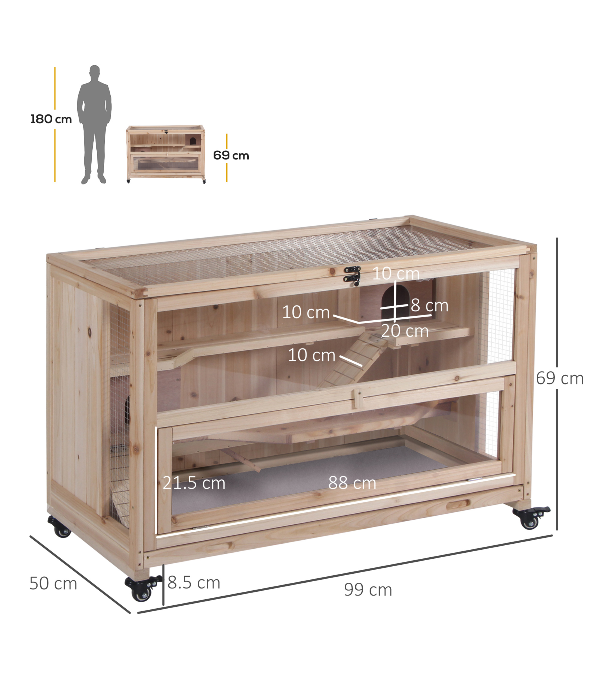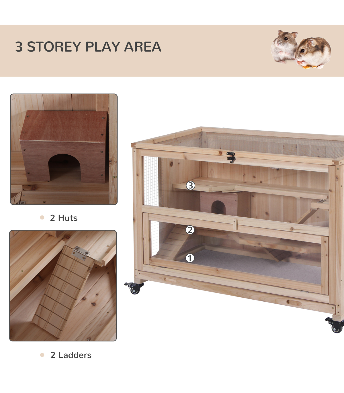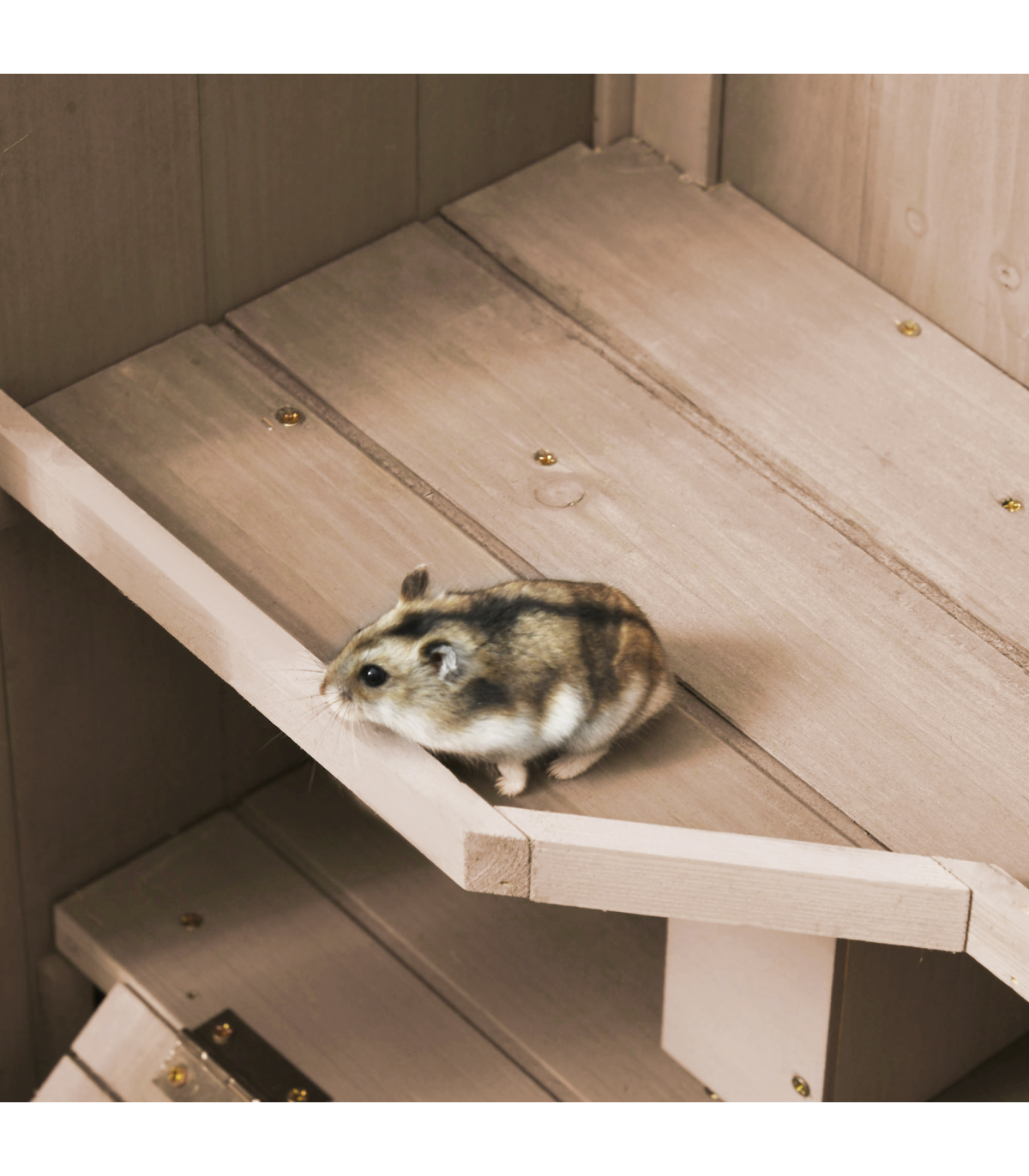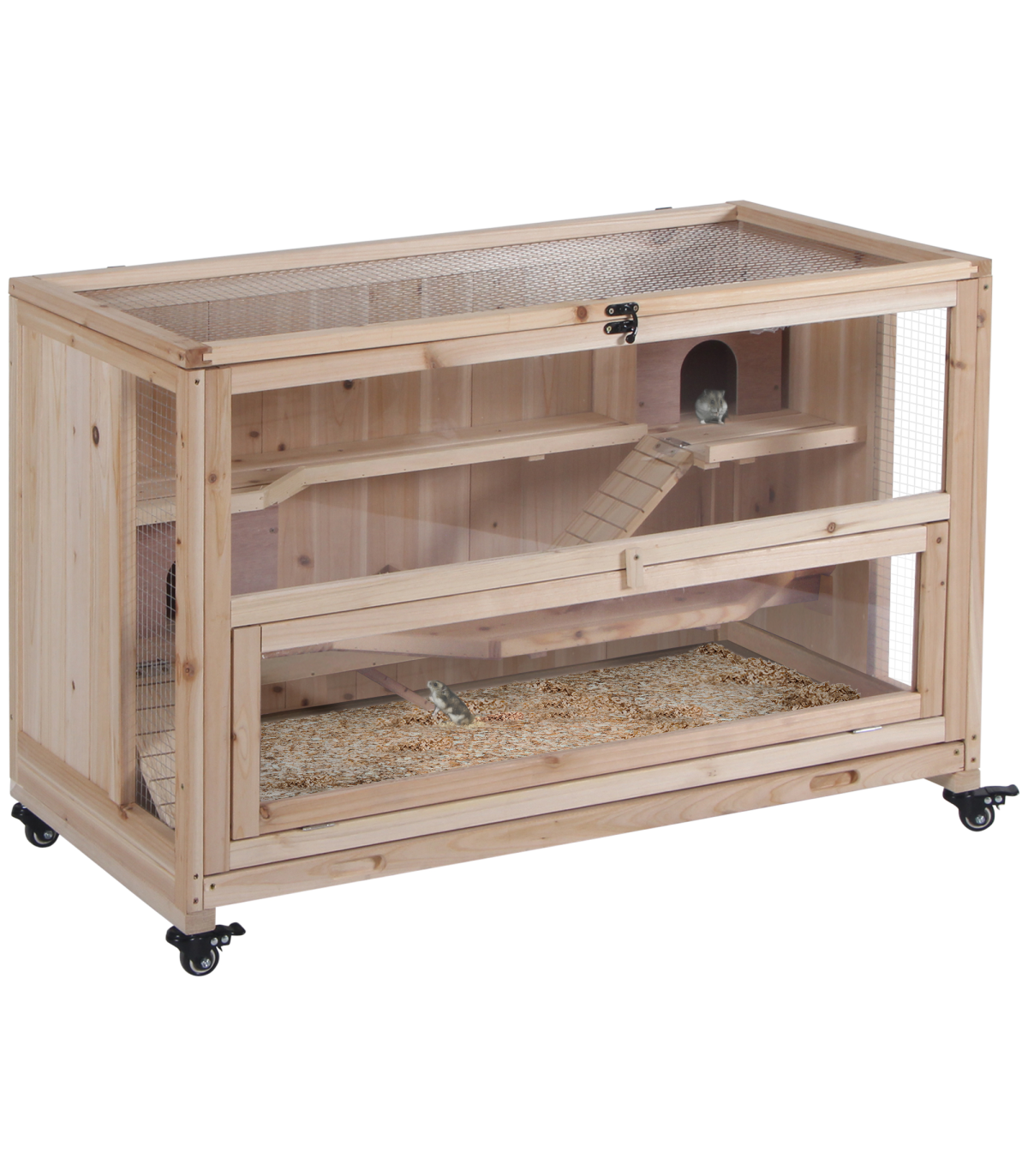 A spacious home where small pets can freely climb, play and roam. This three-level PawHut hamster cage has two huts, which they'll use to rest and sleep, whilst the ladders let them easily get around. There are two openings, one at the top and the other at the front, so cleaning is easy, especially with the pull-out tray underneath. You'll watch them through the glass window, as they settle into their new environment, which is made of sturdy fir wood - providing a long-term and homely habitat.