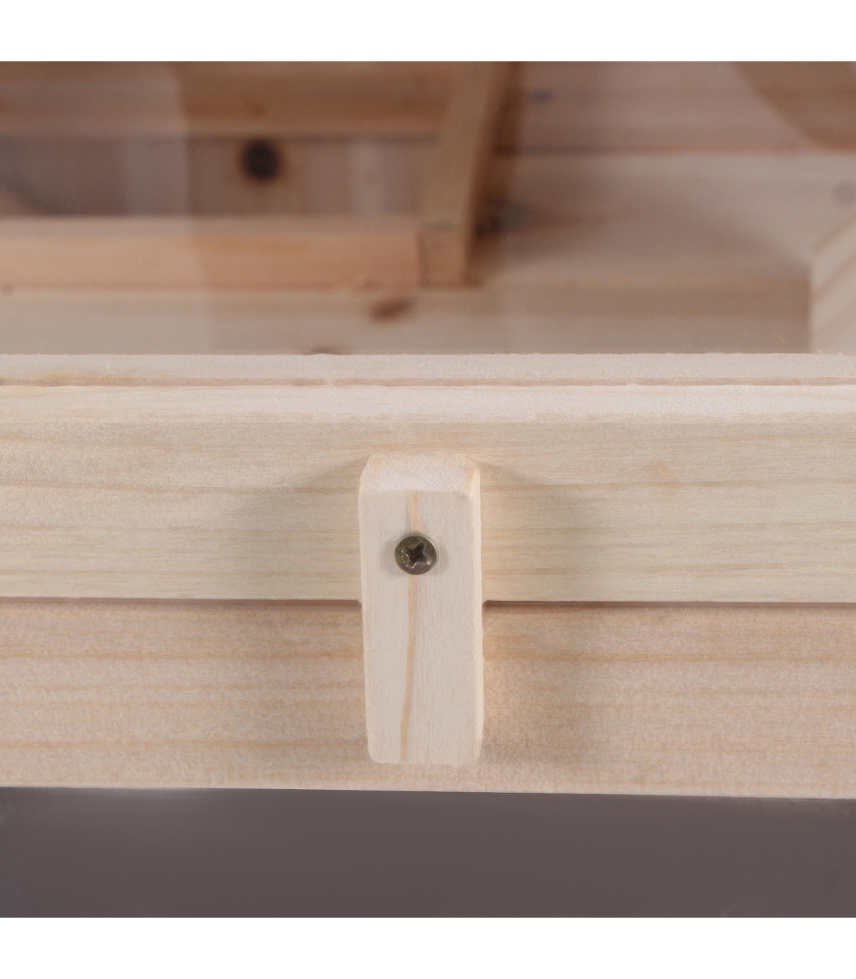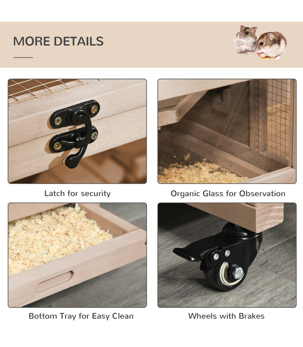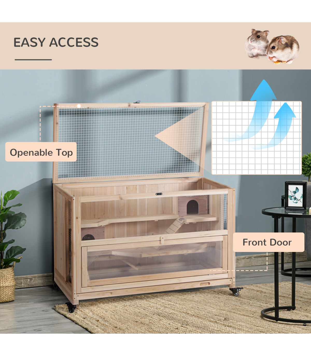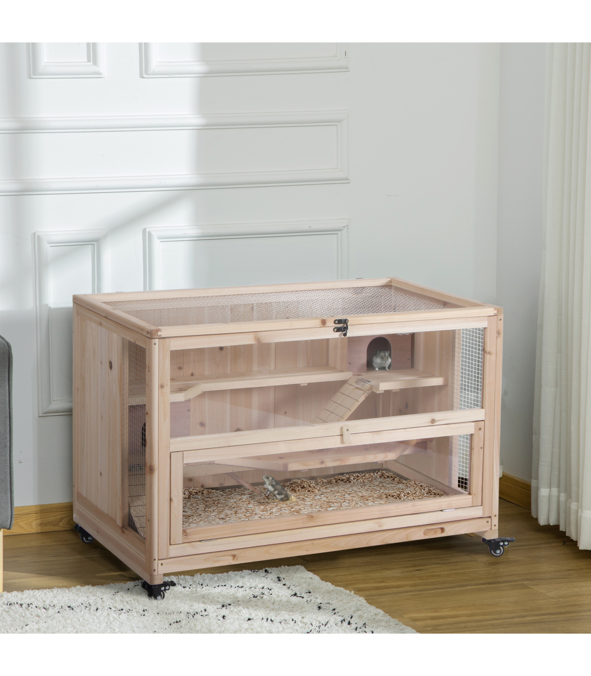 A spacious home where small pets can freely climb, play and roam. This three-level PawHut hamster cage has two huts, which they'll use to rest and sleep, whilst the ladders let them easily get around. There are two openings, one at the top and the other at the front, so cleaning is easy, especially with the pull-out tray underneath. You'll watch them through the glass window, as they settle into their new environment, which is made of sturdy fir wood - providing a long-term and homely habitat.