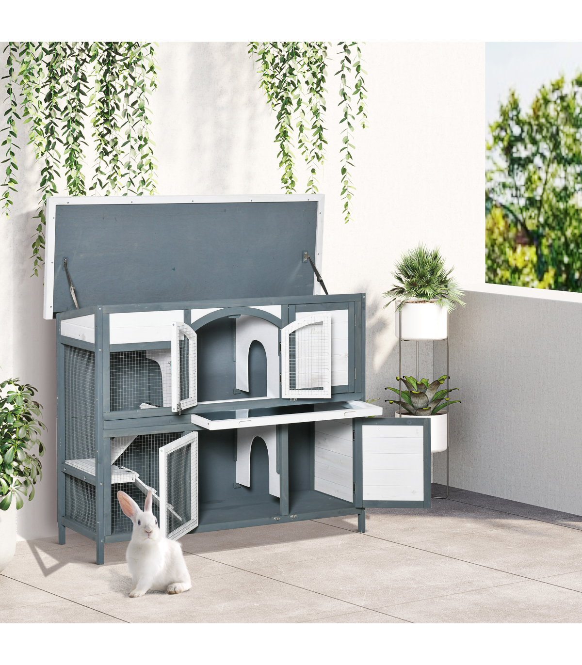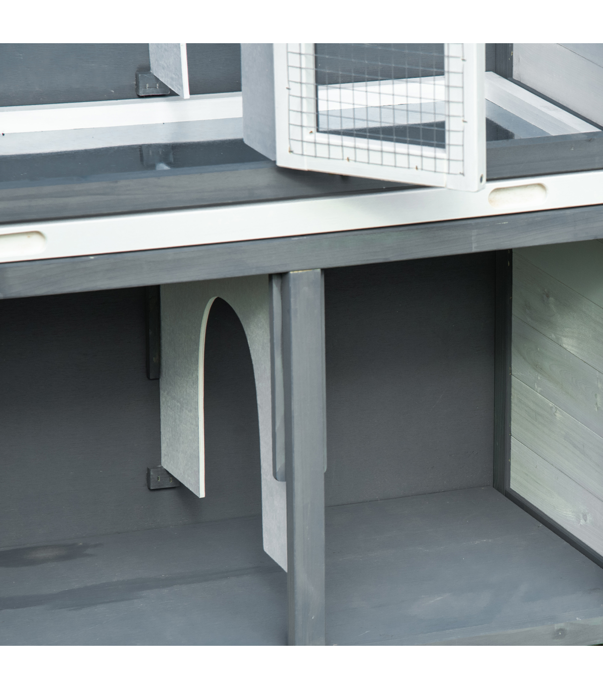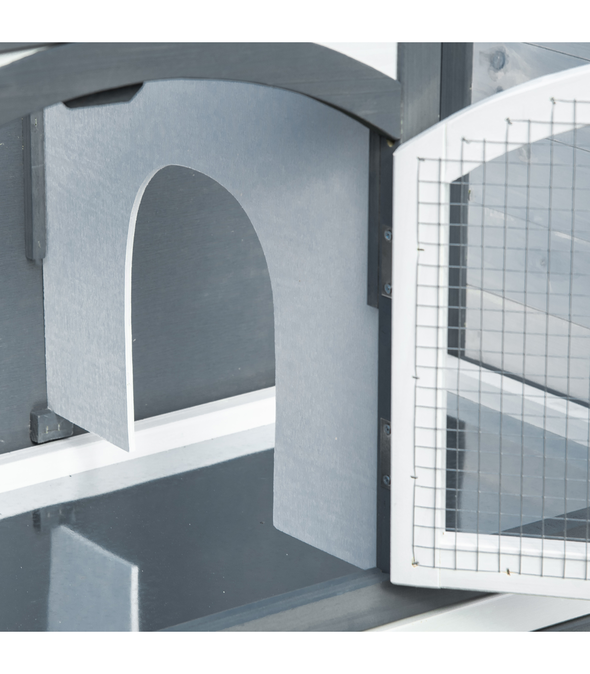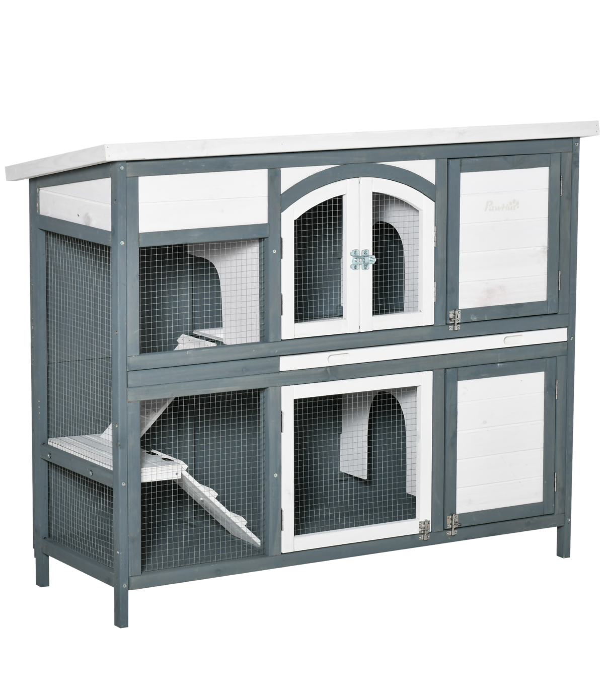- Solid Wooden frame and asphalt roof is Suitable for outdoors - steel wire fencing for ventilation - Two ramps so pets can access the different levels - Pull-out tray on the upper level for easy cleaning - multiple Lockable doors for easy access and security - Suitable for Two rabbits - Assembly required