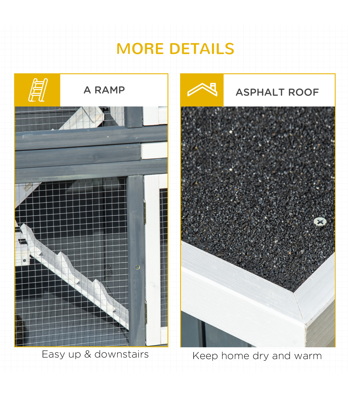 Pets have the freedom to roam in this spacious PawHut guinea pig house. With two tiers - connected by ramps, they'll easily get around, whilst the lockable doors ensure they don't escape. Its raised base prevents dampness in their area, which is well ventilated from the steel wire fence. The water-resistant paint and asphalt roof shelters pets from UV and rain - suitable for gardens. Clean the cage using the multiple doors, openable roof and pull-out tray, so they have a comfortable and tidy home.