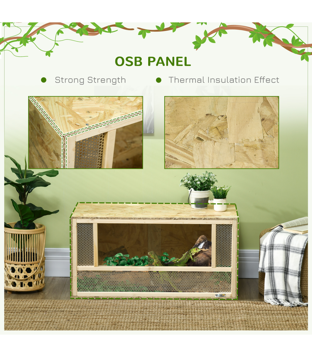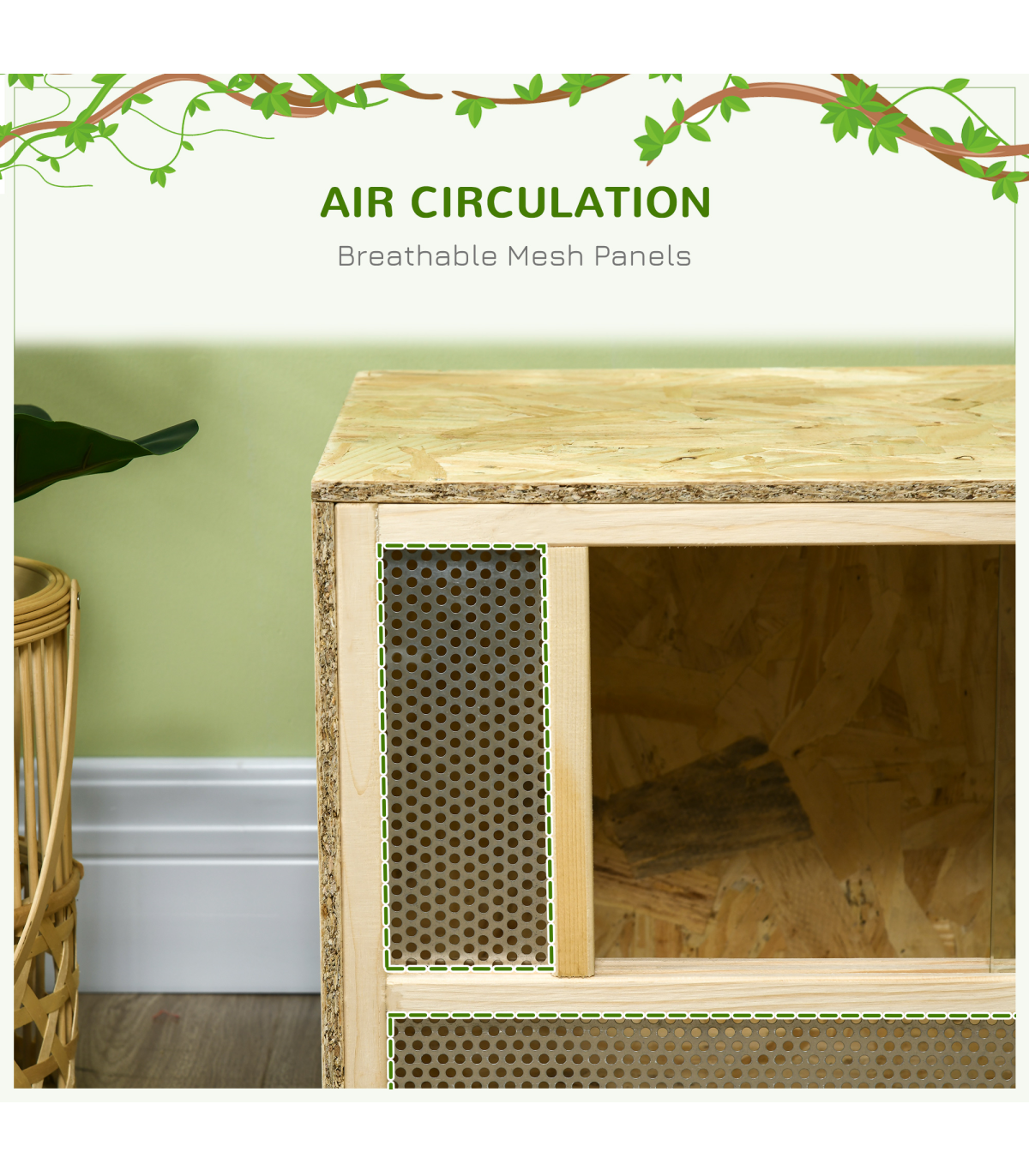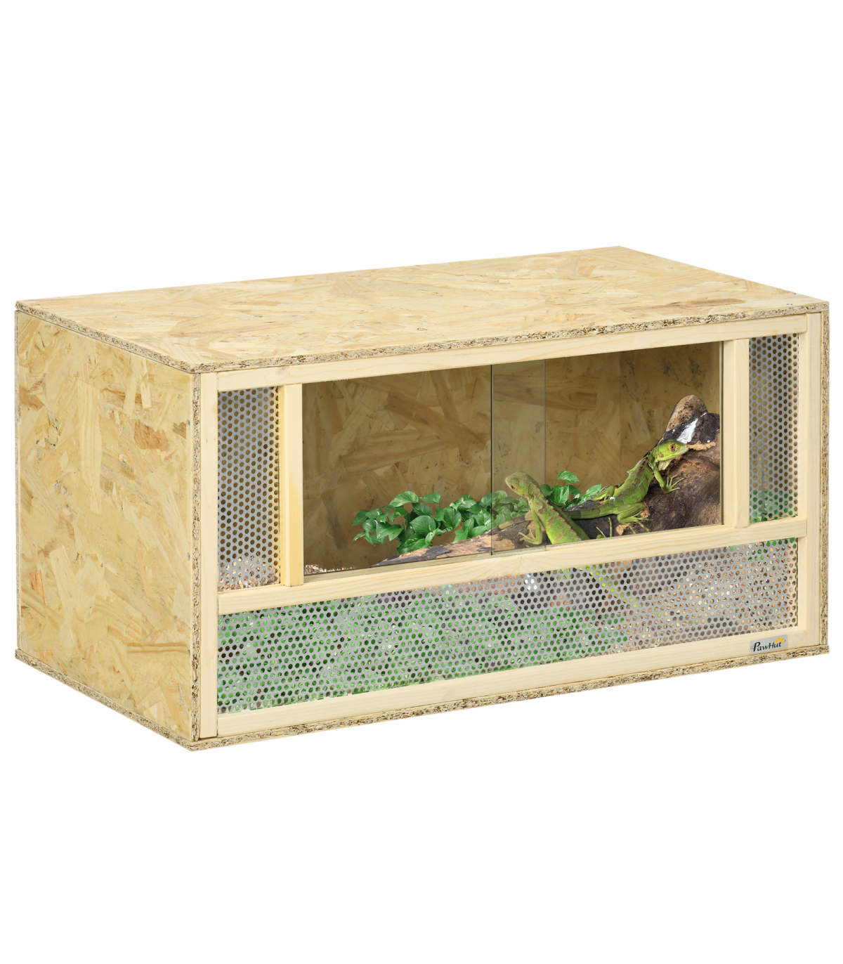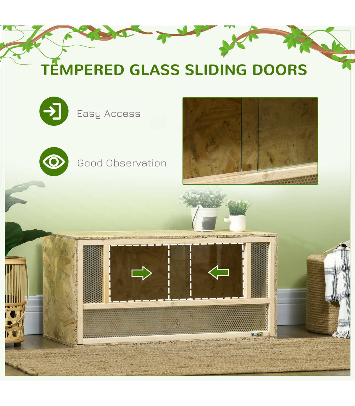 - "PawHut 80cm Reptile Terrarium Vivarium w/ Glass Sliding Doors, Breathable Mesh" - Breathable mesh panels: Keep the tortoise vivarium properly ventilated and cool. - Additional heat: Use a heating pad on the moisture-resistant bottom for more warmth. - Visible: Sliding doors made of tempered glass allows watching the pets in the reptile tank. - Sturdy material: Solid OSB panels provide thermal insulation to maintain the right temperature. - Untreated wood: Apply epoxy resin to protect the box from moisture. - Dimensions: 40H x 80L x 40Wcm. - Suitable for lizards, horned frogs, snakes, chameleons, and other reptiles. - Easy assembly required.