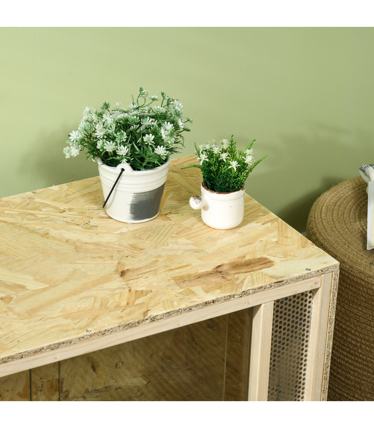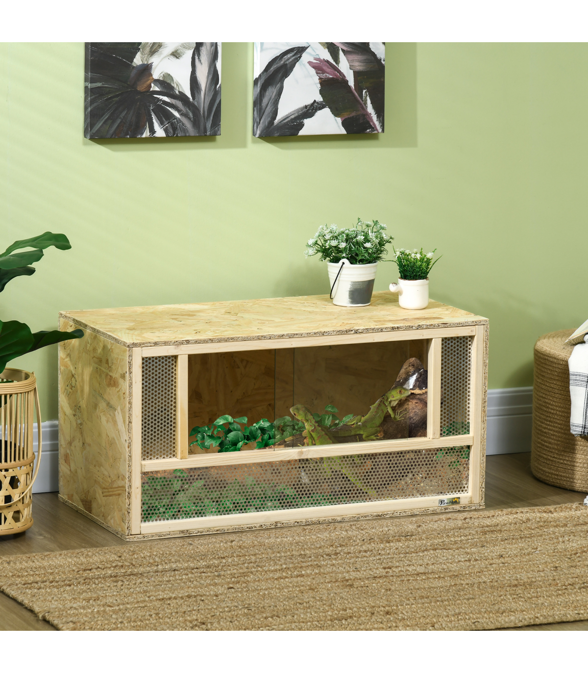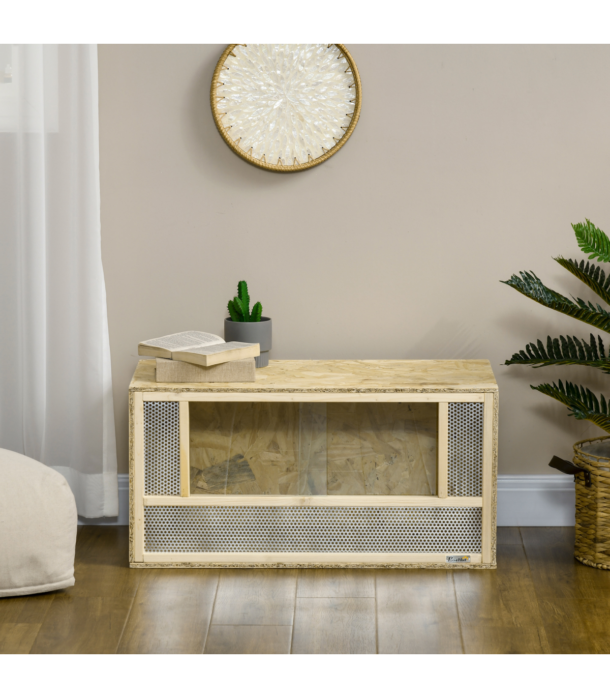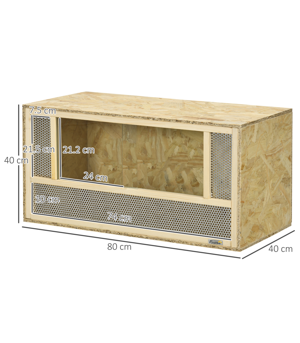 - "PawHut 80cm Reptile Terrarium Vivarium w/ Glass Sliding Doors, Breathable Mesh" - Breathable mesh panels: Keep the tortoise vivarium properly ventilated and cool. - Additional heat: Use a heating pad on the moisture-resistant bottom for more warmth. - Visible: Sliding doors made of tempered glass allows watching the pets in the reptile tank. - Sturdy material: Solid OSB panels provide thermal insulation to maintain the right temperature. - Untreated wood: Apply epoxy resin to protect the box from moisture. - Dimensions: 40H x 80L x 40Wcm. - Suitable for lizards, horned frogs, snakes, chameleons, and other reptiles. - Easy assembly required.