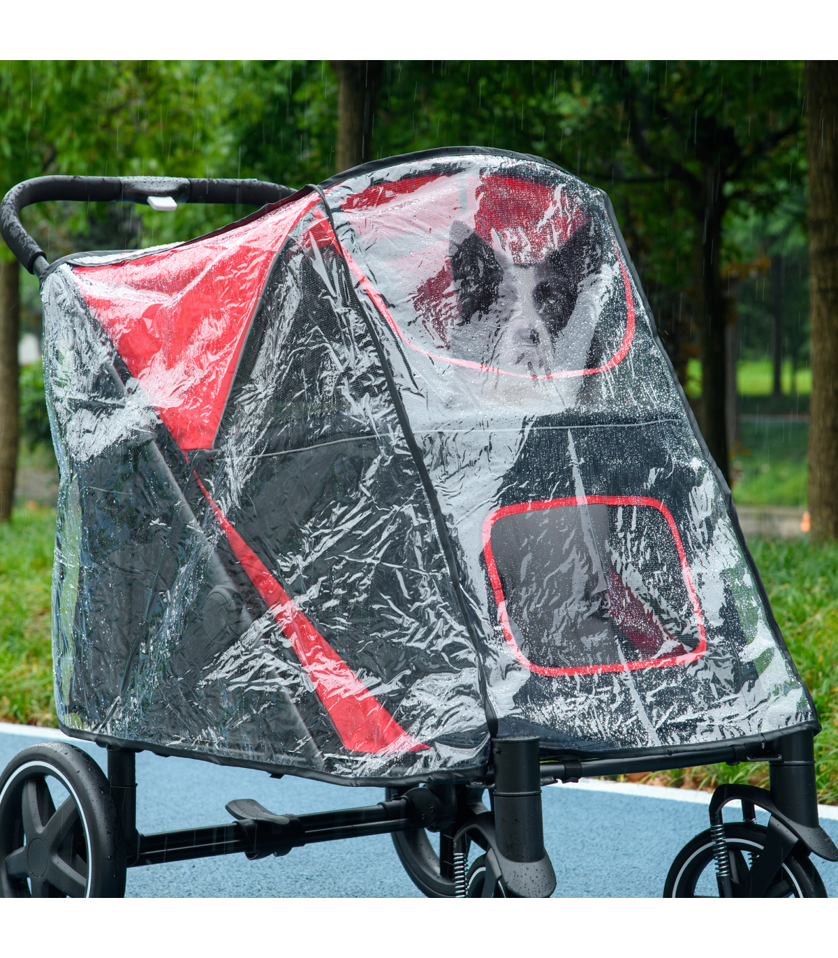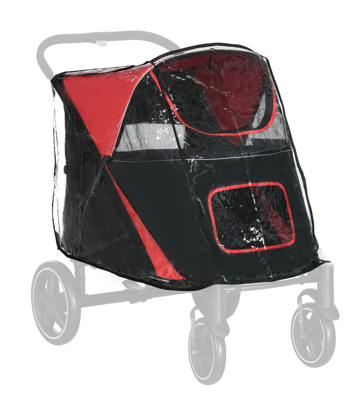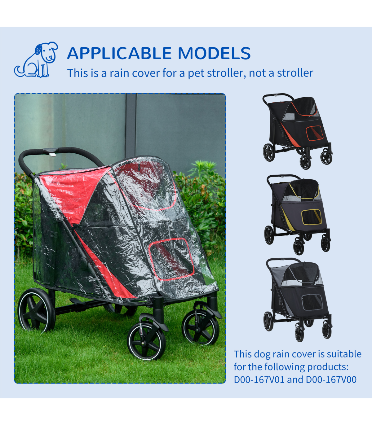- Colour: Transparent - Material: Plastic - Dimensions: Unfolded: 70/60H x 62/87L x 54Wcm - Suitable pet strollers for this cover: D00-167V01RD and D00-167V00CG - Item label: D00-181V00CR - NOTE: This is a rain cover for a pet stroller. The pet stroller is NOT included