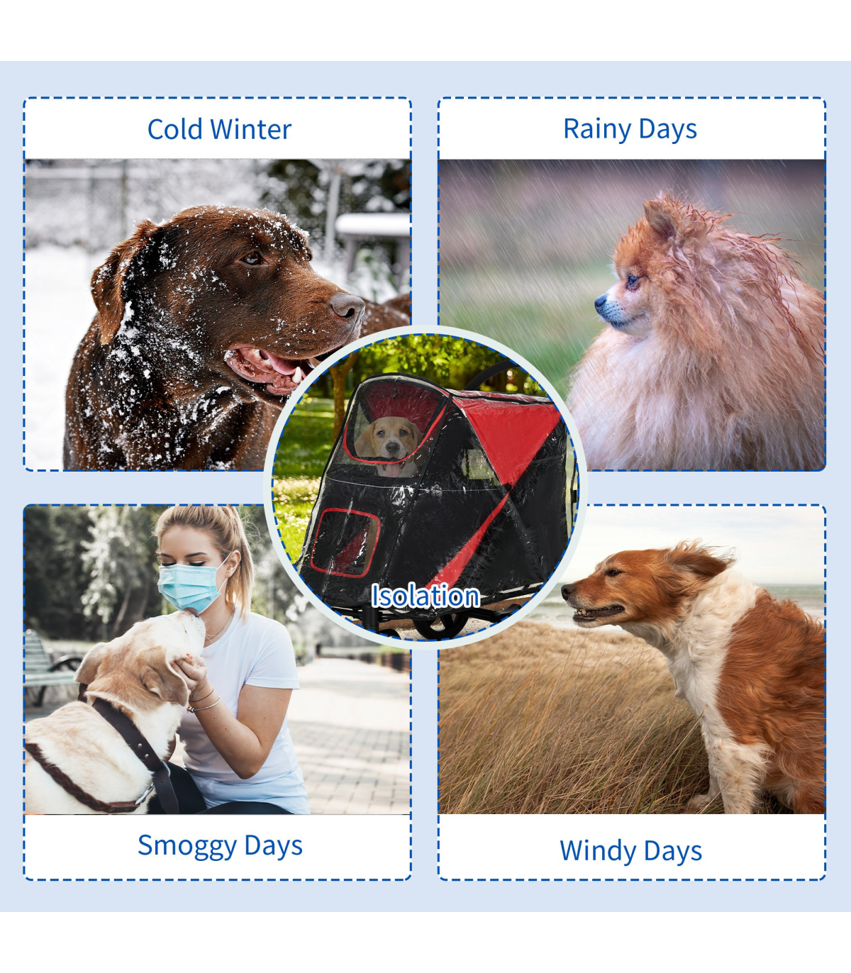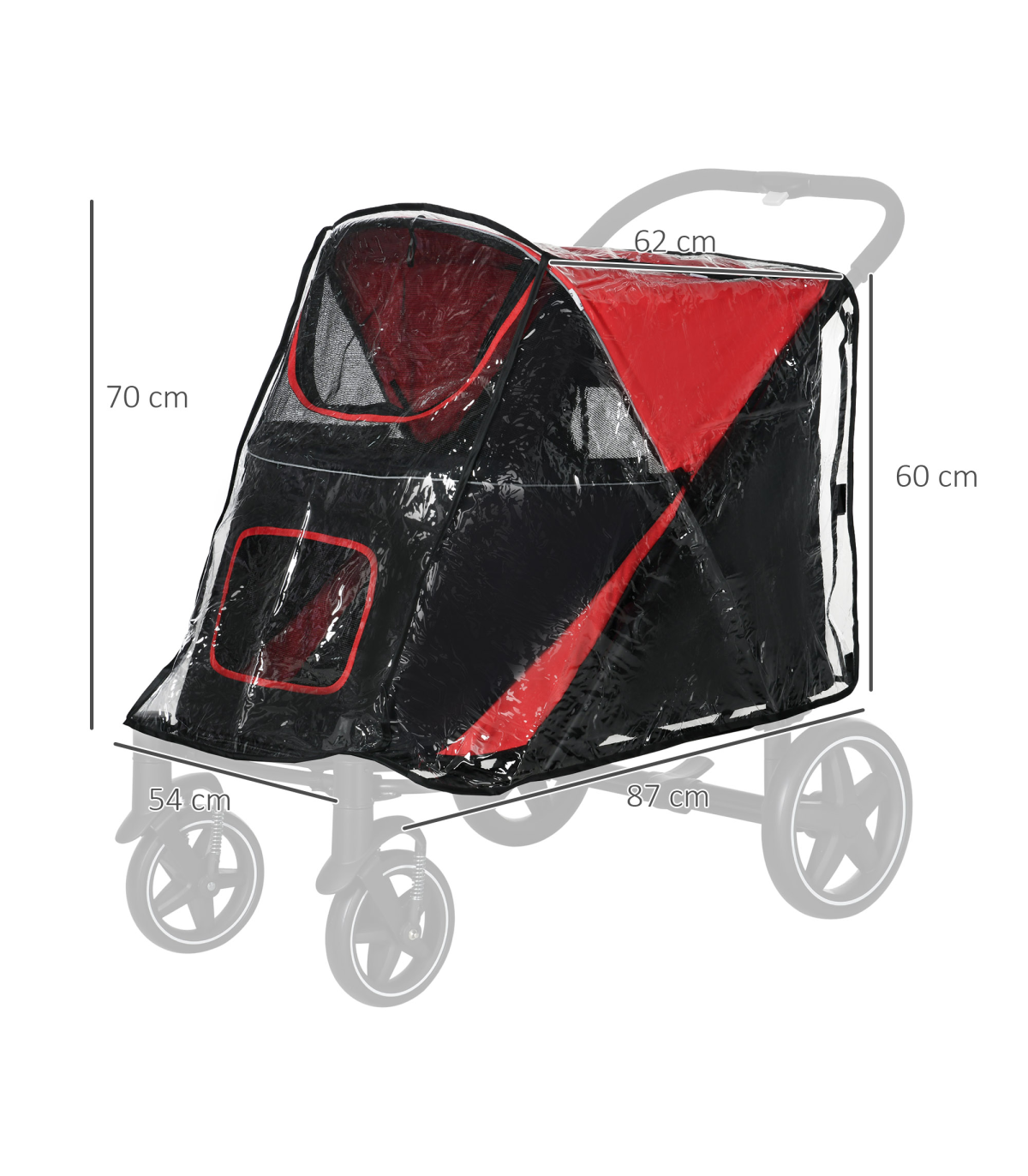 Dimensions: 70/60H x 62/87L x 54Wcm. This pet cover is suitable for the following products: D00-167V01RD/D00-167V00CG. NOTE: This is the rain cover only! The dog buggy is not included.