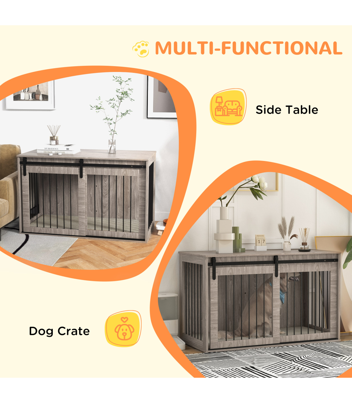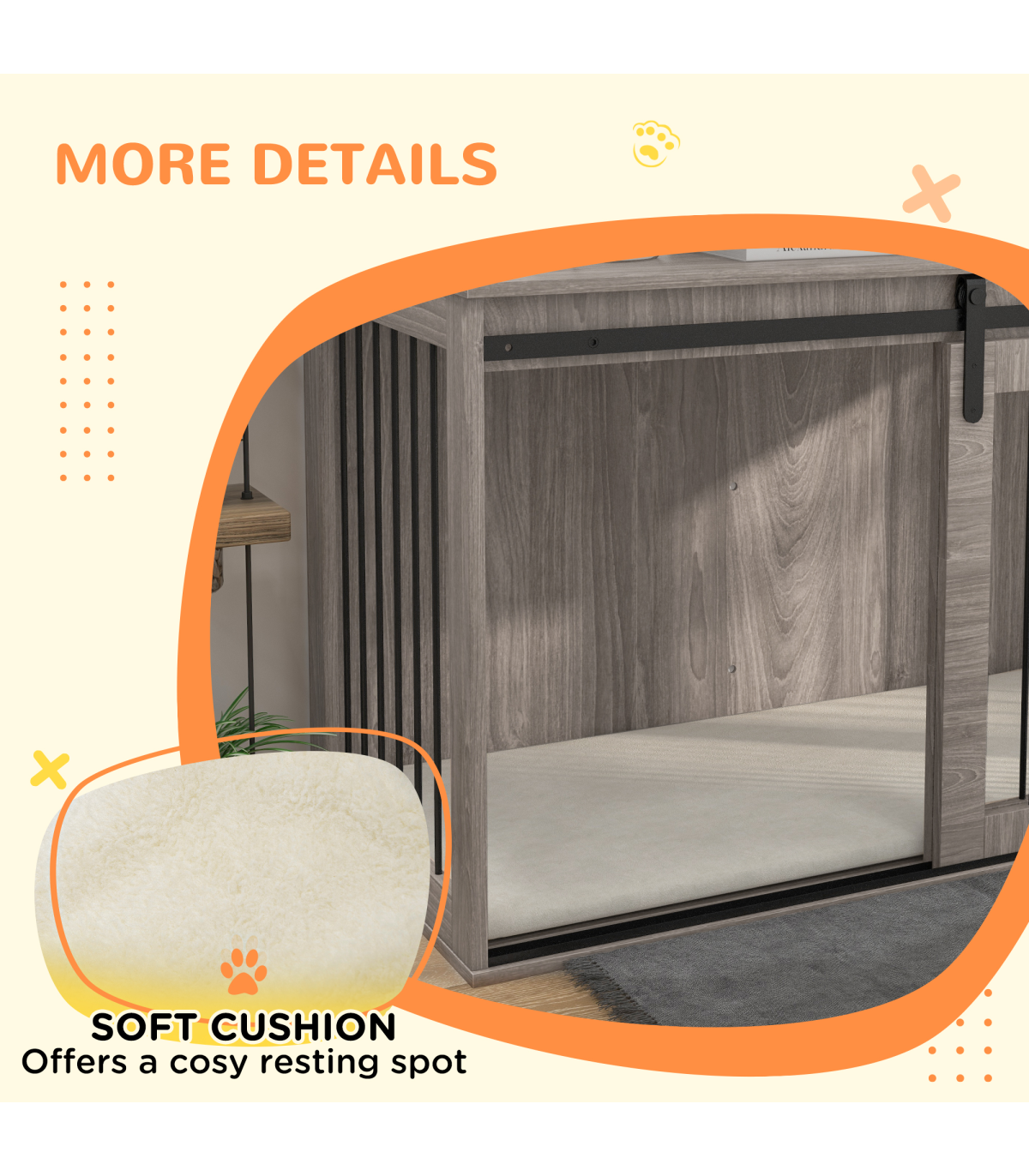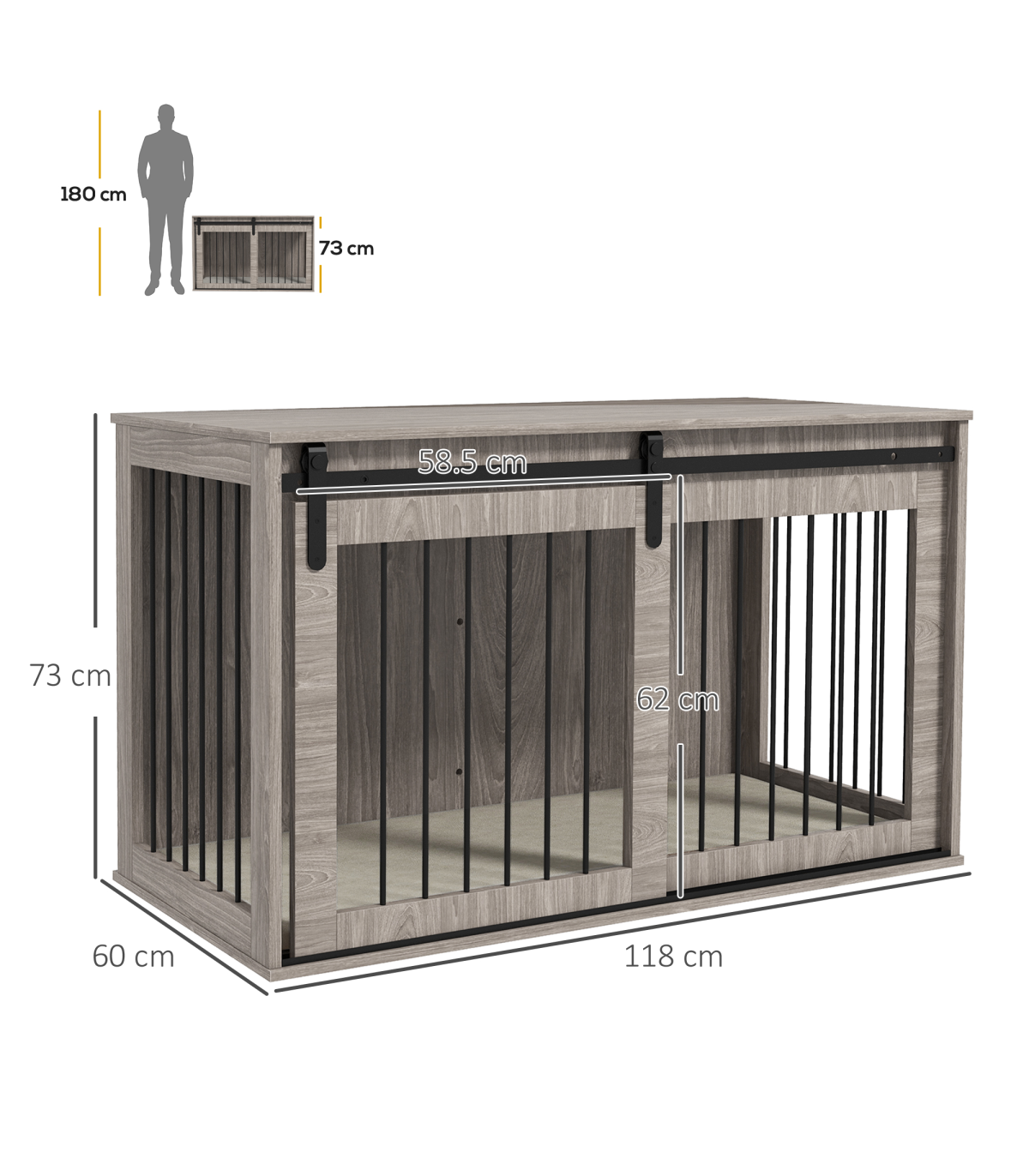 - Multifunctional: Use as a dog crate and a side table simultaneously - Ventilation on three sides, keeping their space cool and comfortable - Removable cushion for easy cleaning - Made from particle board and steel for stability - A sliding with latch, ensuring pets remain safely inside when needed - A barn door design, make it goes well with your home decor - Suitable for large dogs up to 40kg and body length up to 70cm - Assembly required - Colour: Brown and cream white - Material: Particle board, steel, plush (100% polyester) and spray cotton - Overall Dimensions: 73H x 118L x 60Wcm. Inside Space: 70H x 114L x 54Wcm. Door: 62H x 58.5Wcm. Cushion: 3D x 114L x 54Wcm. Bar Spacing: 4.1cm - Maximum Weight Capacity: Top: 20kg. Inside: 60kg - Qualification: BS5852 - Item Label: D02-169V75WN