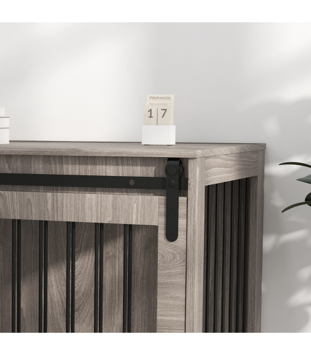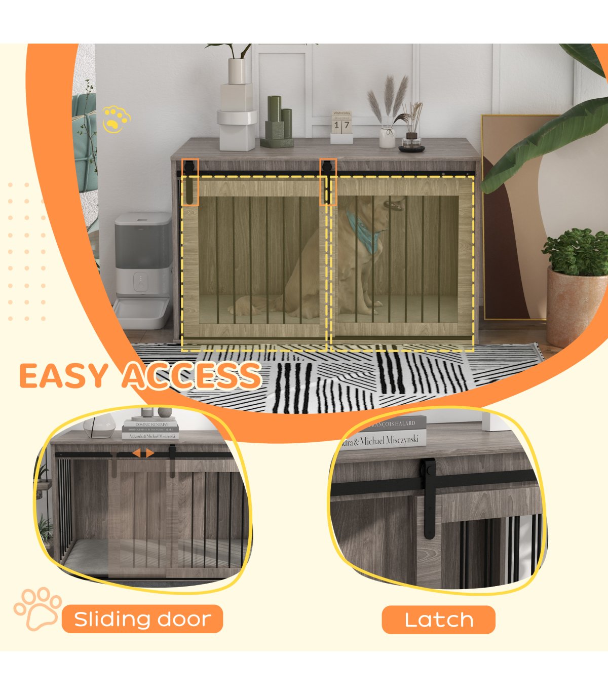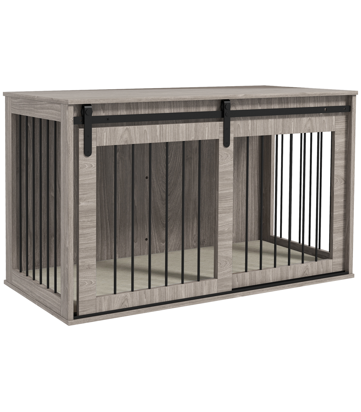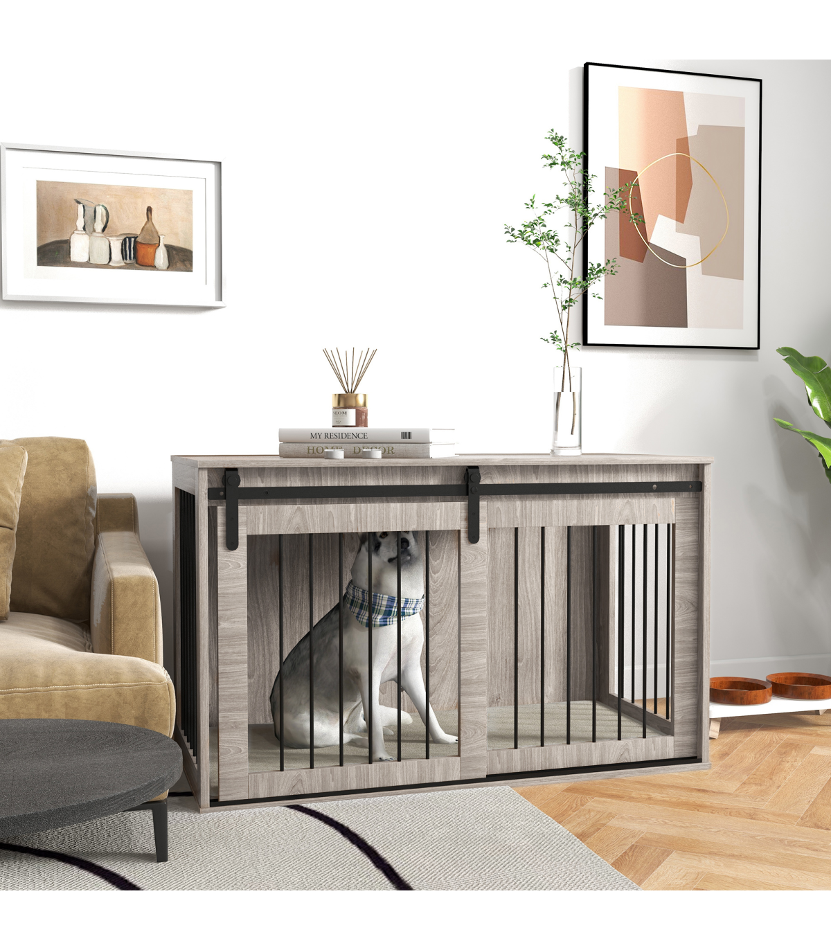 - Multifunctional: Use as a dog crate and a side table simultaneously - Ventilation on three sides, keeping their space cool and comfortable - Removable cushion for easy cleaning - Made from particle board and steel for stability - A sliding with latch, ensuring pets remain safely inside when needed - A barn door design, make it goes well with your home decor - Suitable for large dogs up to 40kg and body length up to 70cm - Assembly required - Colour: Brown and cream white - Material: Particle board, steel, plush (100% polyester) and spray cotton - Overall Dimensions: 73H x 118L x 60Wcm. Inside Space: 70H x 114L x 54Wcm. Door: 62H x 58.5Wcm. Cushion: 3D x 114L x 54Wcm. Bar Spacing: 4.1cm - Maximum Weight Capacity: Top: 20kg. Inside: 60kg - Qualification: BS5852 - Item Label: D02-169V75WN