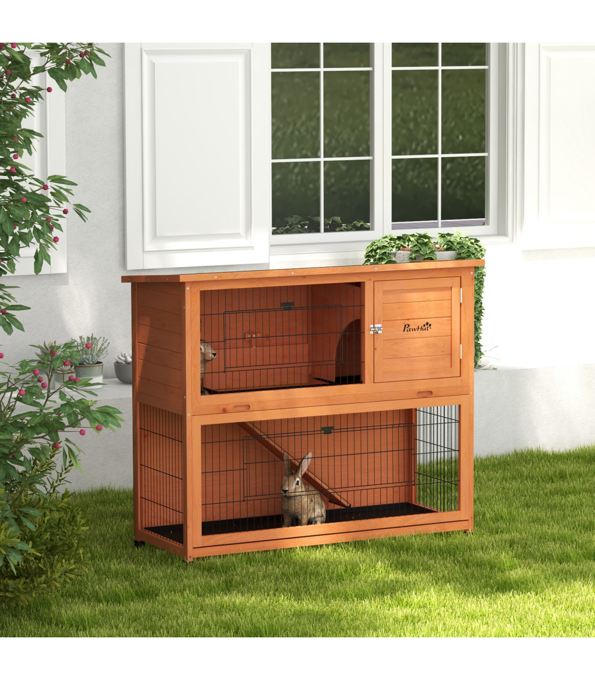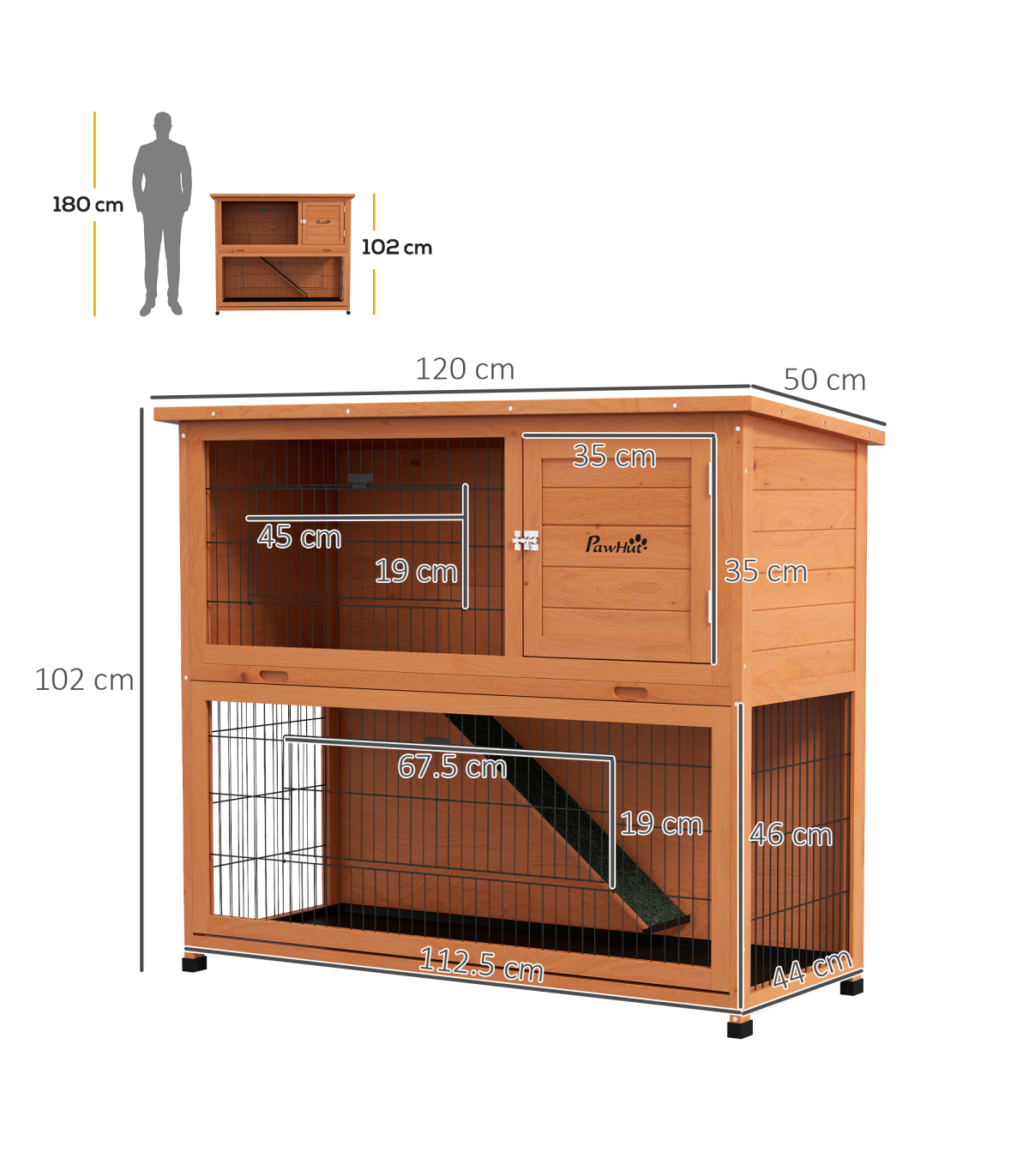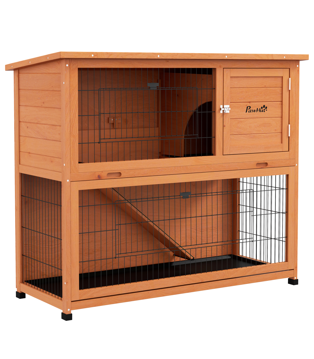 - "PawHut Wooden Rabbit Hutch Antiseptic Outdoor, for 1-2 Rabbits, Orange" - Description: - Water-resistant paint and asphalt roof protect against rainwater - Suitable for outdoors, it provides shade and shelter - Strong steel wire keeps their space ventilated, whilst protecting them from predators - Multiple entrances for easy access - Slide-out trays for easy cleaning - Suitable for 1-2 rabbits - Colour: Orange - Material: Fir wood (antiseptic wood), Steel wires - Overall dimensions: - 102H x 120L x 50Wcm - Main house: - Left: 46H x 65.5L x 44Wcm - Right: 46H x 42L x 44Wcm - Run box: 47H x 112.5L x 44Wcm - Main house door: 25H x 20Wcm - Upper wood door: 35H x 35Wcm - Upper steel wire door: 19H x 49Wcm - Lower steel wire door: 19H x 67.5Wcm - Ramp: 73L x 13.5Wcm - Tray: 107.5L x 41Wcm - Main house area: 0.168 sq. meters - Run box area: 0.44 sq. meters - Item Label: D51-410V02OG