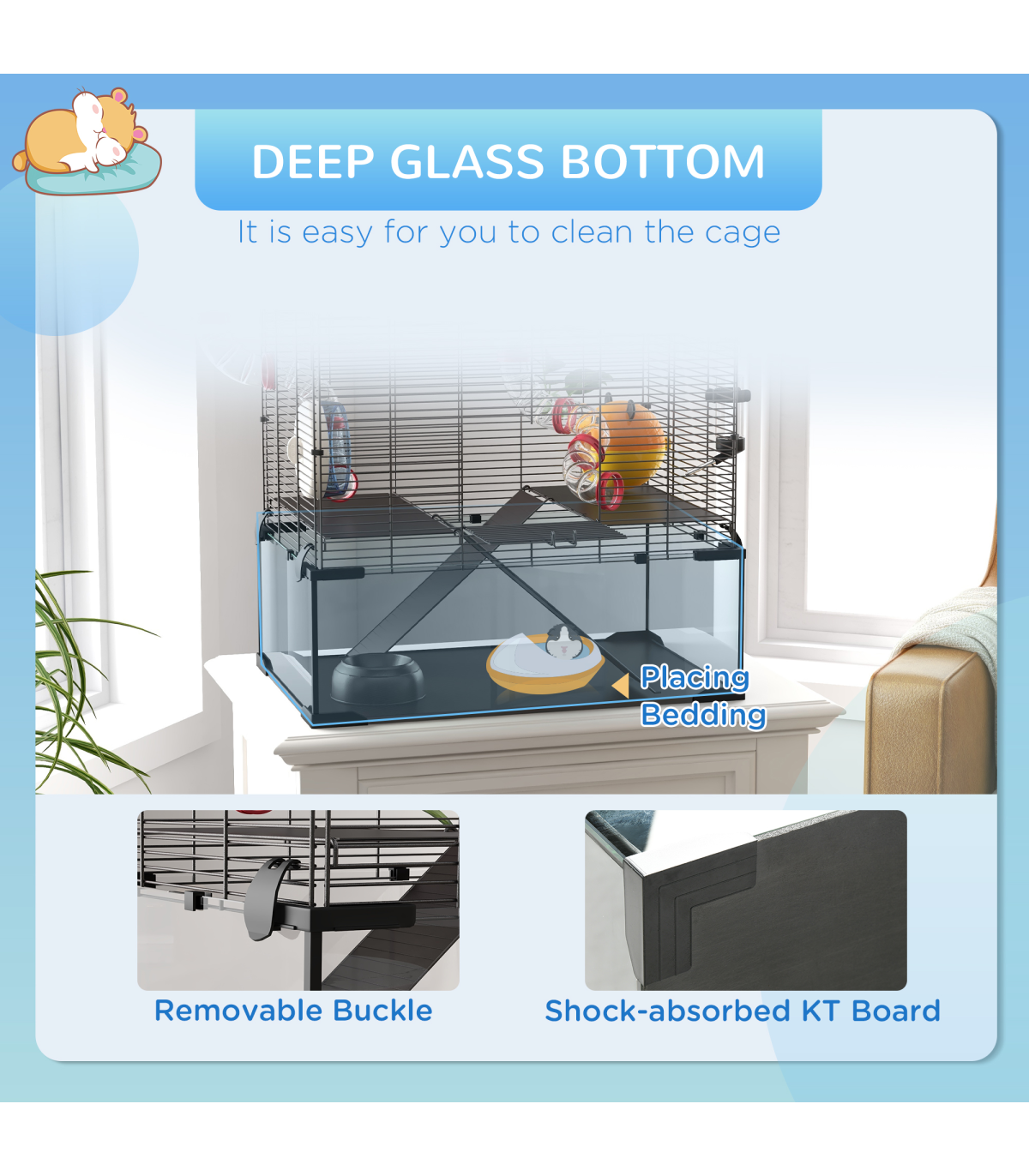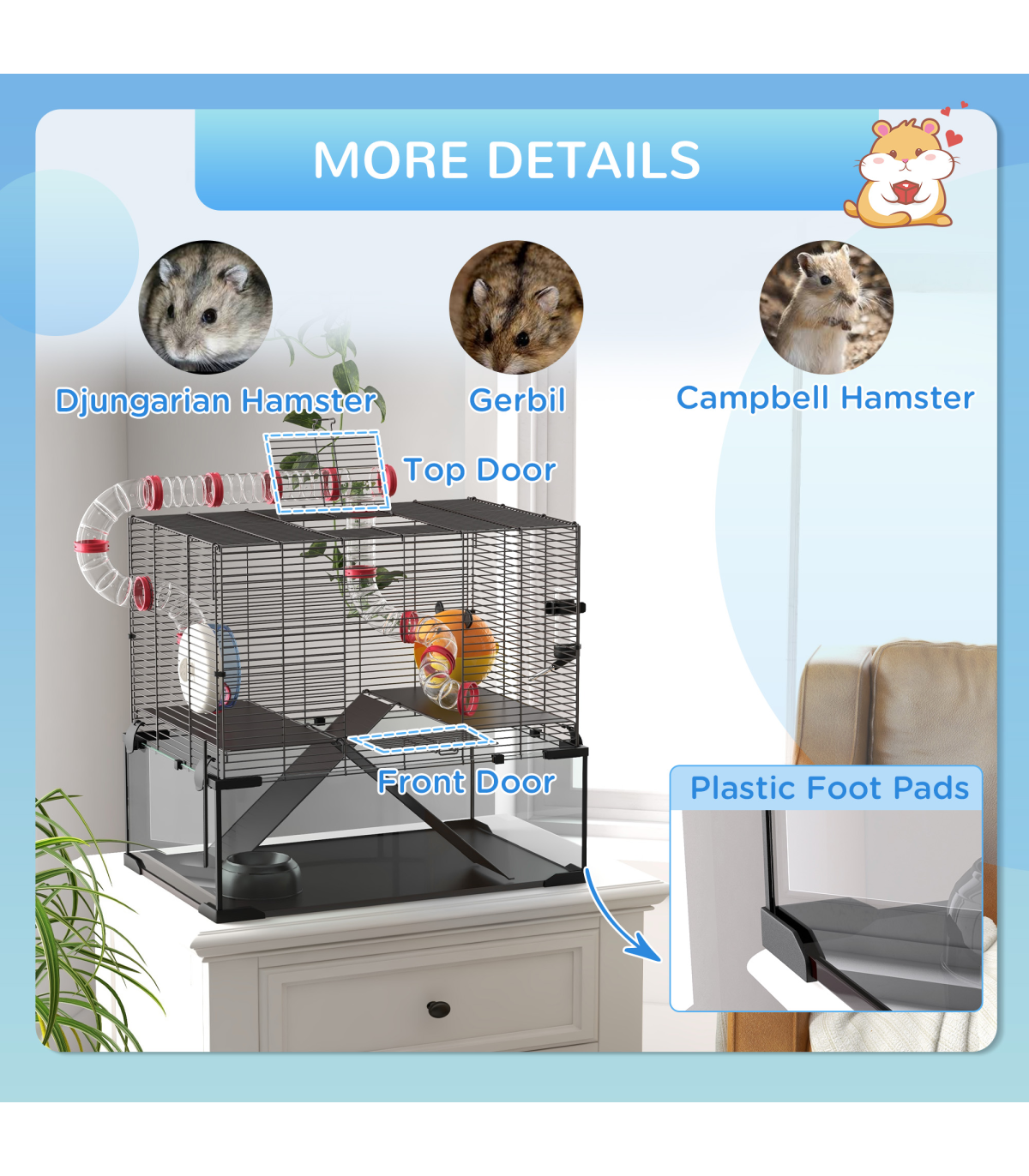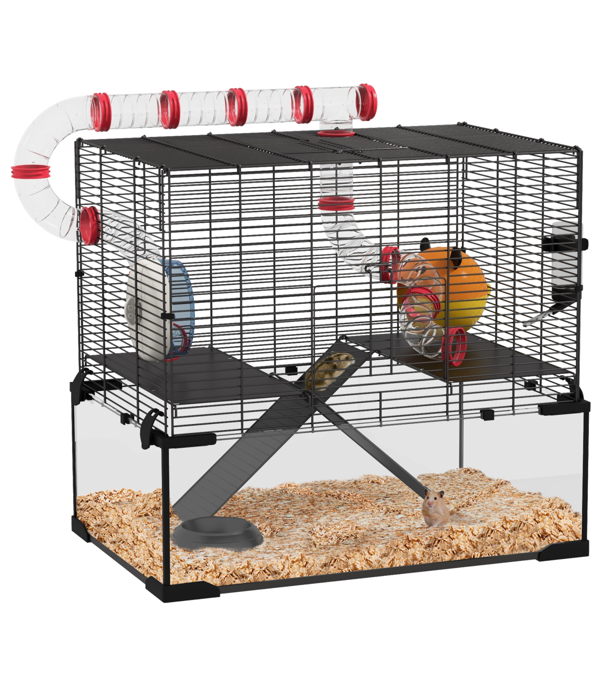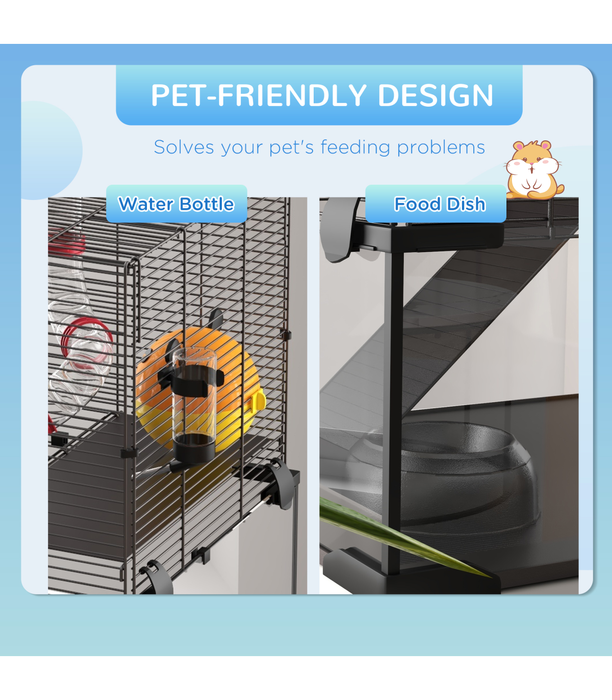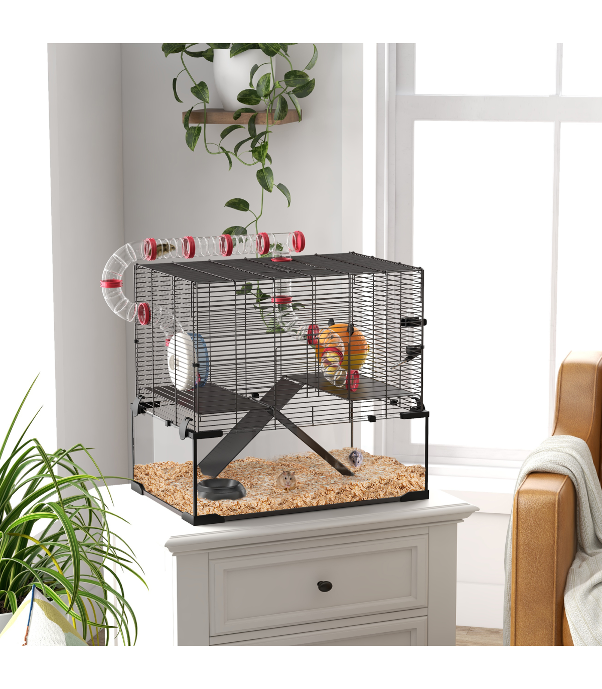 Upgrade your small pet's living space � choose this PawHut hamster cage. Consisting of multiple tiers, it includes tunnels and two ramps for them to get around, providing endless fun and adventure. There's an exercise wheel to keep them active, whilst the hut gives them a place to relax comfortably. Plus, the water bottle and food dish keep them fed and hydrated. Elevate your hamster's well-being with this wonderful habitat � and watch them thrive.