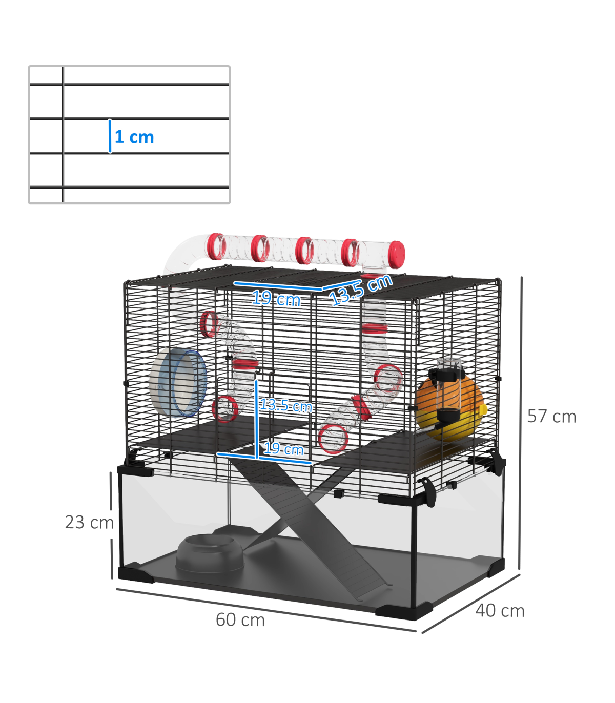 - "PawHut Hamster Cage w/ Tubes, Ramps, Platforms, Hut, 60 x 40 x 57cm" - Description: - A tubing system with multiple separate straight or curved pipes - A running wheel and two ramps for exercise - With two platforms and a hut for relaxing, there's a food dish and a water bottle to keep pets fed and hydrated - Top and front doors for easy access - Bottom KT board is shock absorbent, promoting stability - 1cm steel wire doesn't pinch pets - Suitable for dwarf hamsters and gerbils - Assembly required - Colour: Black and transparent - Material: Steel and tempered glass - Overall dimensions: 57H x 60L x 40cm - Glass base: 23H x 60L x 40Wcm - Main cage: 35H x 58.5L x 38.5Wcm - Door: 13.5H x 19Wcm - Layer: 39L x 18.5Wcm - Ramp: 38L x 12.5Wcm - Exercise wheel: 6.5H x 16.5cm - Hut: 12H x 12L x 10Wcm - Food dish: 4.5H x 13cm - Tube diameter: 5.5cm - Wire spacing: 1cm - Water bottle: 100ml - Item label: D51-417V00BK
