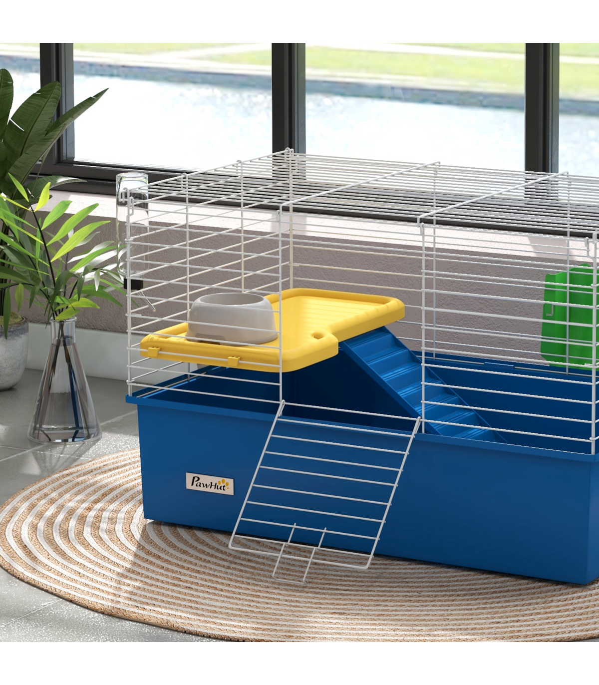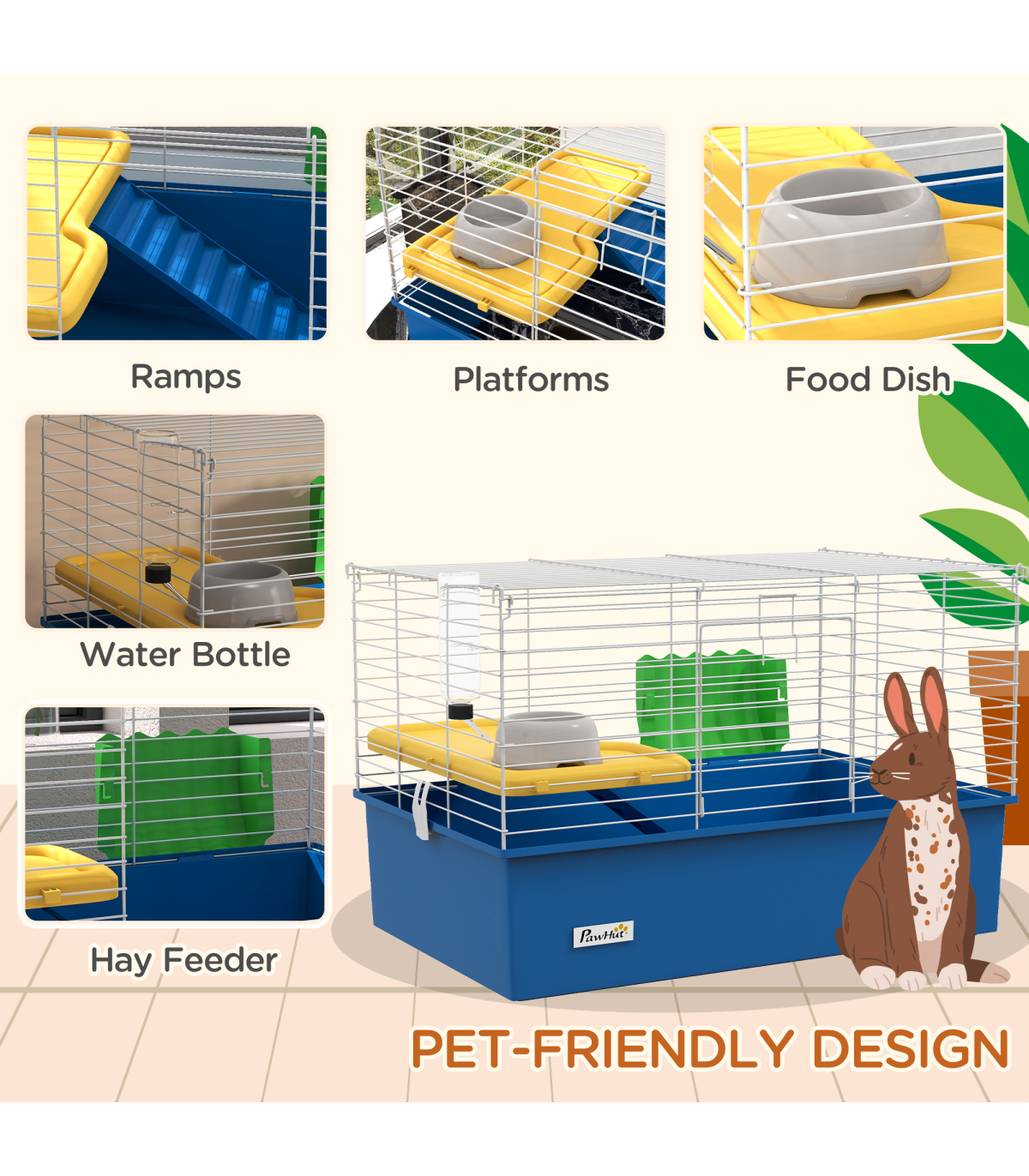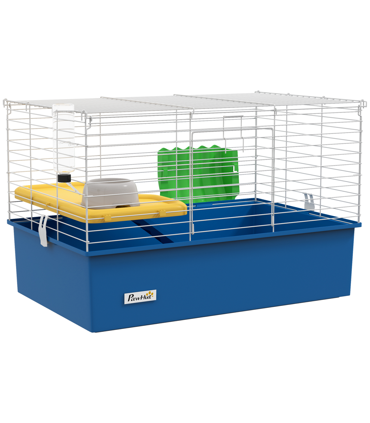 Watch pets thrive in this PawHut cage – a wonderful home for small animals. A colourful safe haven, it's made with a cosy living area, protected by metal wire caging, keeping them safely inside and allowing air to flow through. Inside features a small platform with a food bowl, a water bottle, a ramp and a hay feeder, providing everything they need. Plus, there's a deep base, which collects dirt and debris, keeping their space clean and comfortable. Give your pets the home they truly deserve.