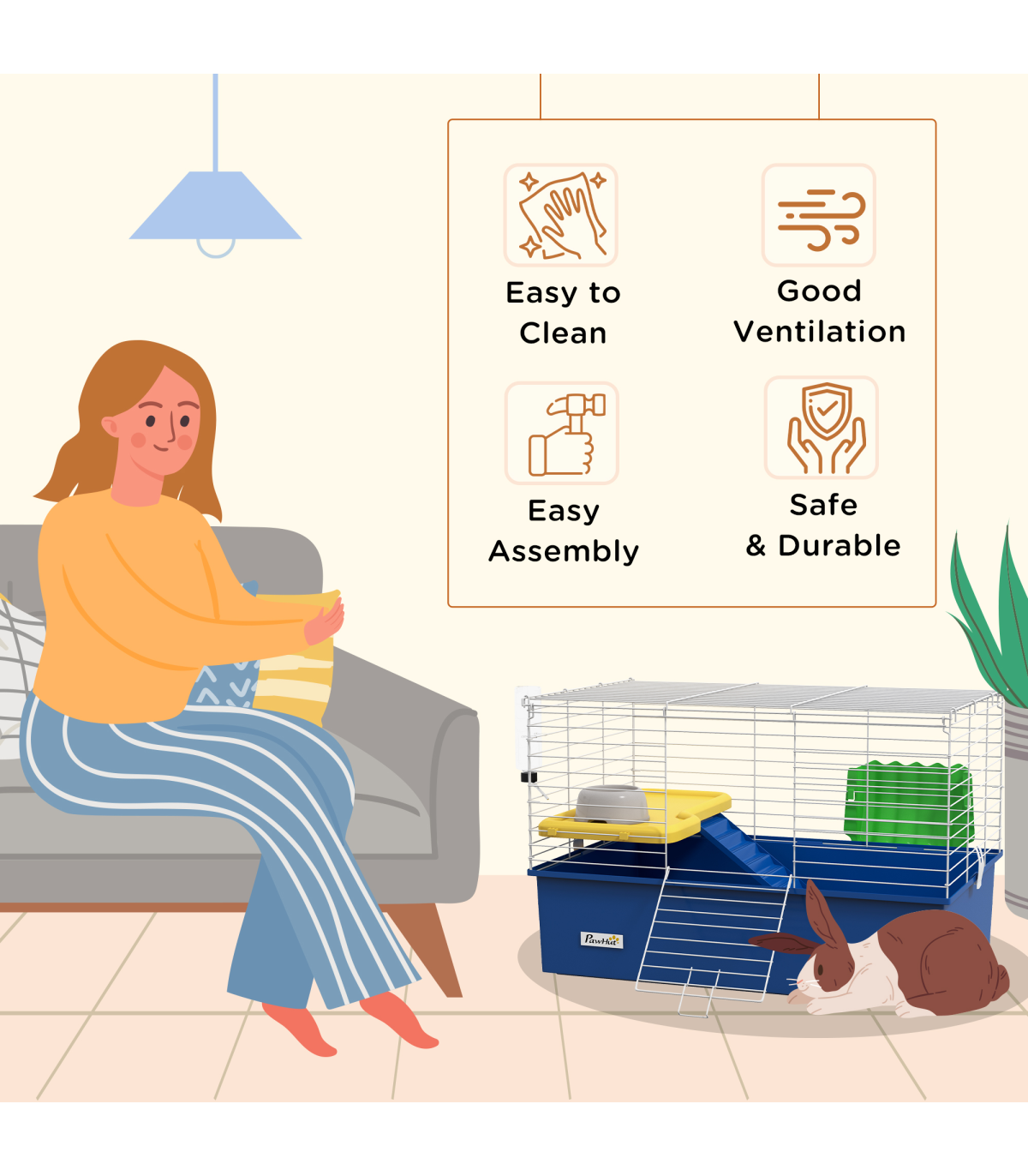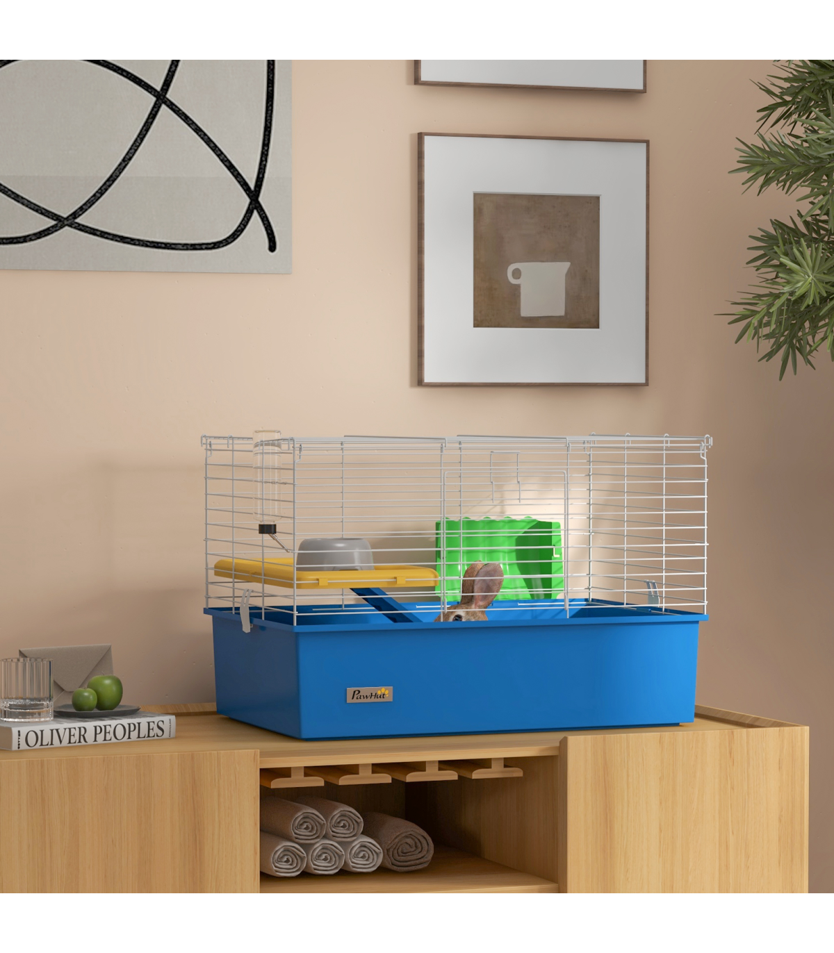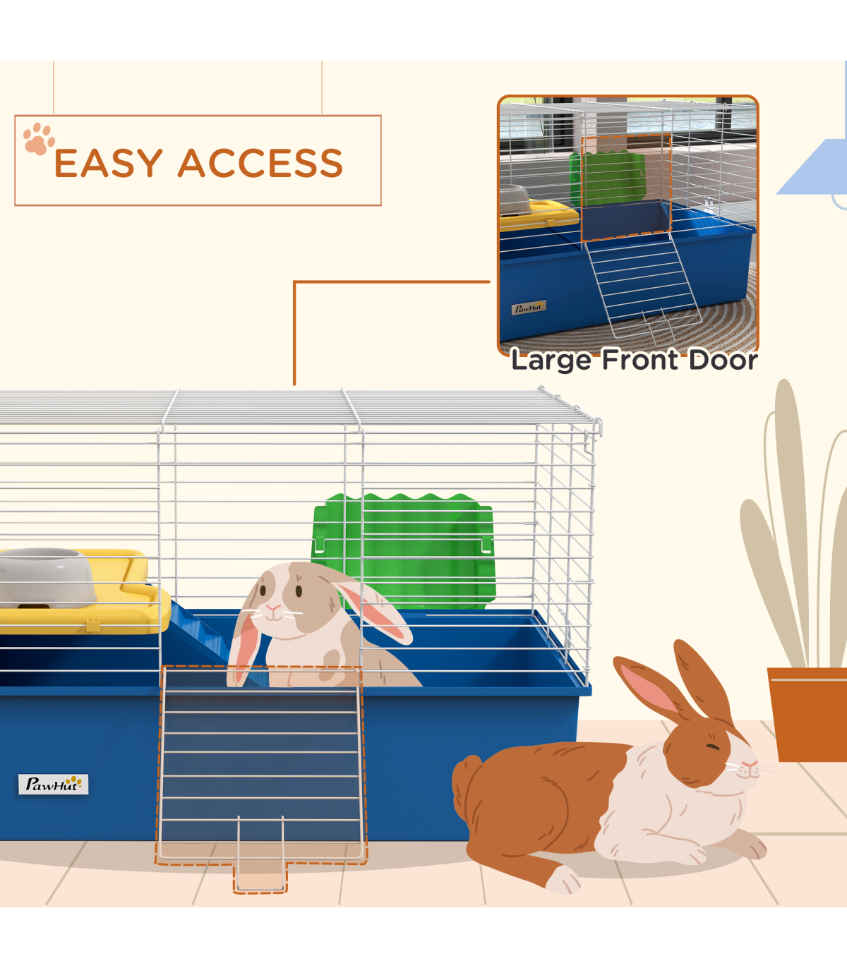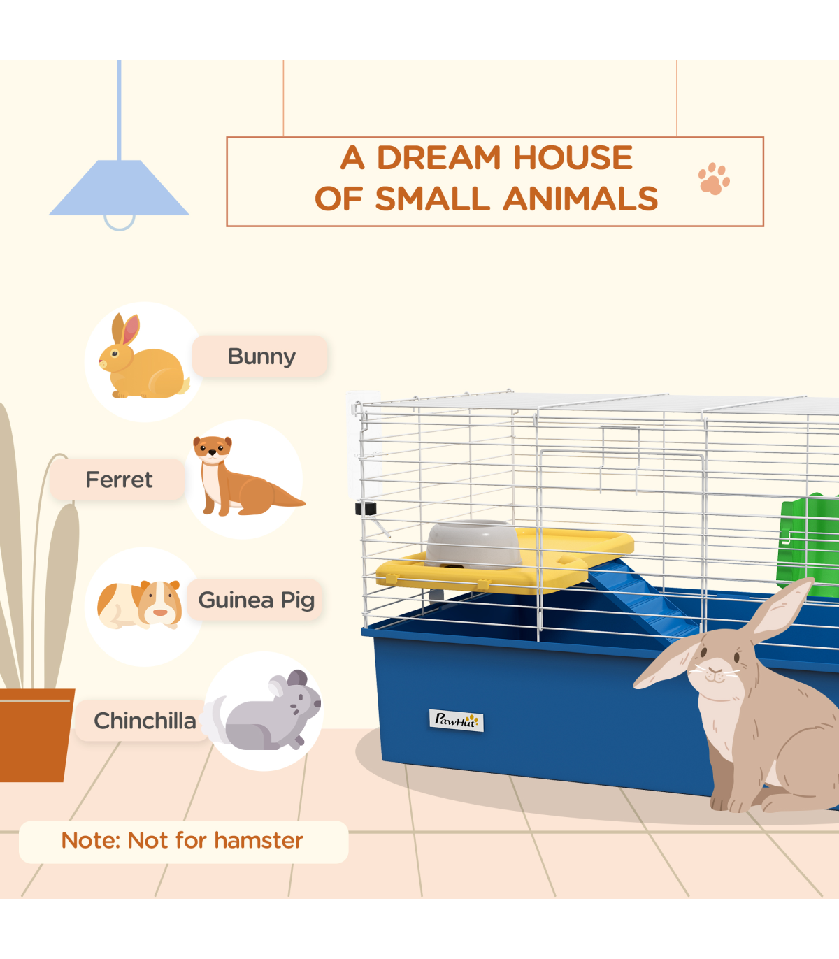 Watch pets thrive in this PawHut cage – a wonderful home for small animals. A colourful safe haven, it's made with a cosy living area, protected by metal wire caging, keeping them safely inside and allowing air to flow through. Inside features a small platform with a food bowl, a water bottle, a ramp and a hay feeder, providing everything they need. Plus, there's a deep base, which collects dirt and debris, keeping their space clean and comfortable. Give your pets the home they truly deserve.