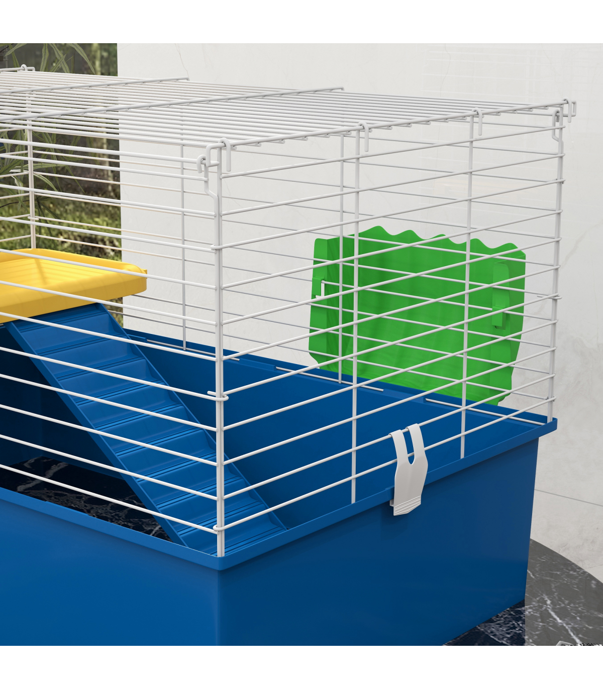 ● Suitable for small rabbits, minks, chinchillas, guinea pigs and other small pets ● Large front door for easy access, cleaning and maintenance ● Deep base to contain litter and other debris ● Features a platform with a ramp, a hay feeder, a water bottle and a food dish ● Safe outer metal caging, with spaced bars for fresh air flow ● Note: Not suitable for hamsters and rats ● Assembly required ● Colour: Blue, White ● Material: Metal and PP ● Dimensions: 47H x 71L x 46Wcm ● Front door: 21.5H x 24Wcm ● Plastic tray: 18.5H x 71L x 46Wcm ● Platform: 43L x 25Wcm ● Ramp: 37.5L x 12Wcm ● Hay feeder: 13H x 20L x 6Wcm ● Water bottle: 5.5H x Ф11cm ● Net weight: 4kg ● Item Label: D51-157V01BU