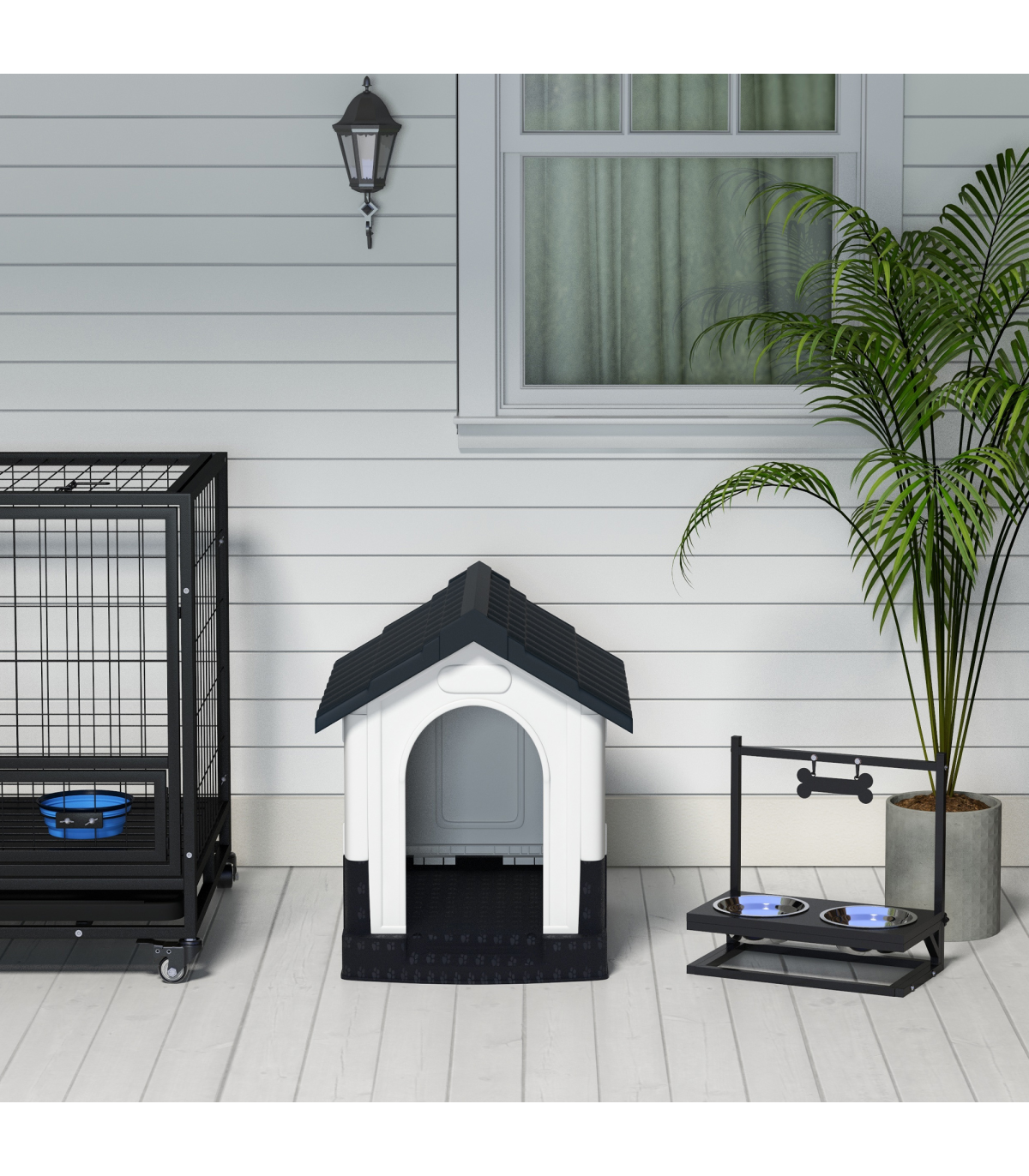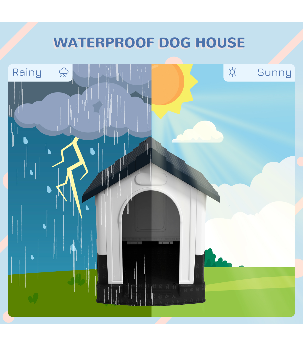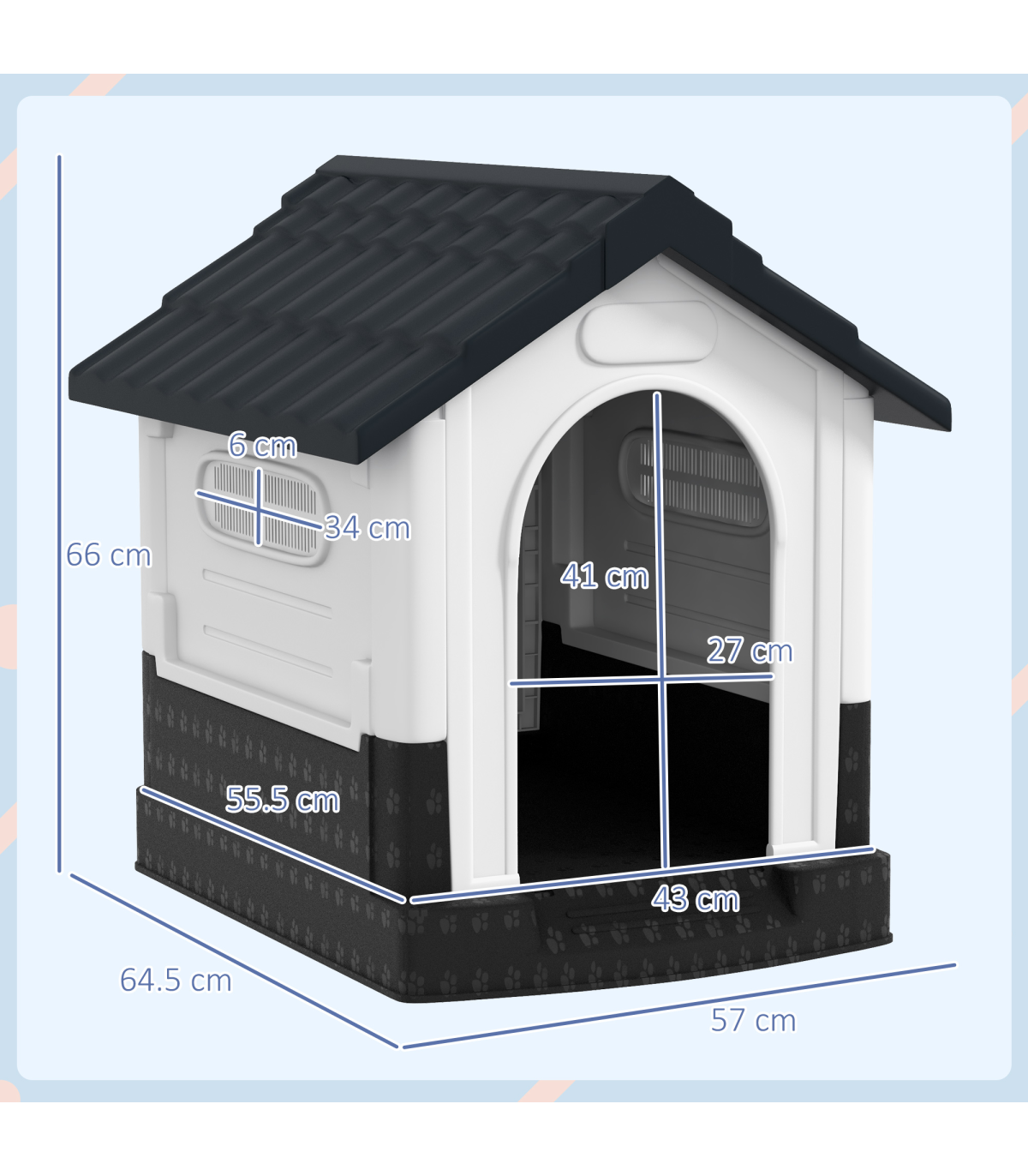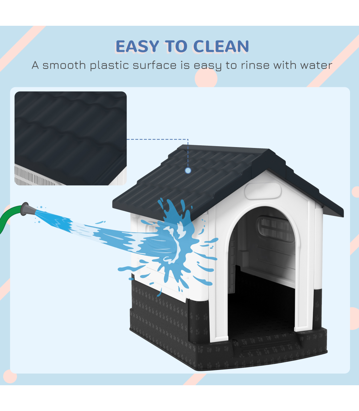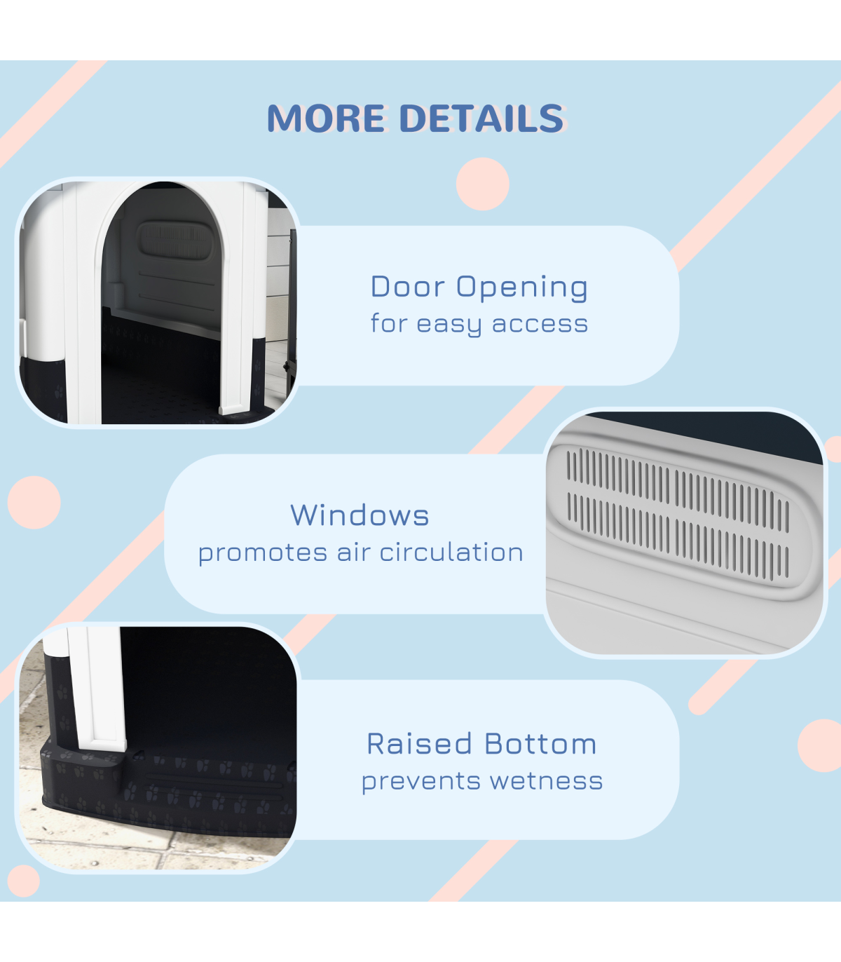 Treat your pet to the ultimate relaxing spot with this PawHut plastic dog kennel. Suitable for outdoors, its slanted roof shelters them from rainwater – it also provides a cool shade during the hotter months. It is 6.5cm off the ground, stopping dampness and moisture from seeping through, so they stay dry, warm and cosy. Three windows and a large door for air to flow through, keeping their space fresh and ventilated. Quick and easy to set up, pets will have an outdoor haven to love and enjoy.
