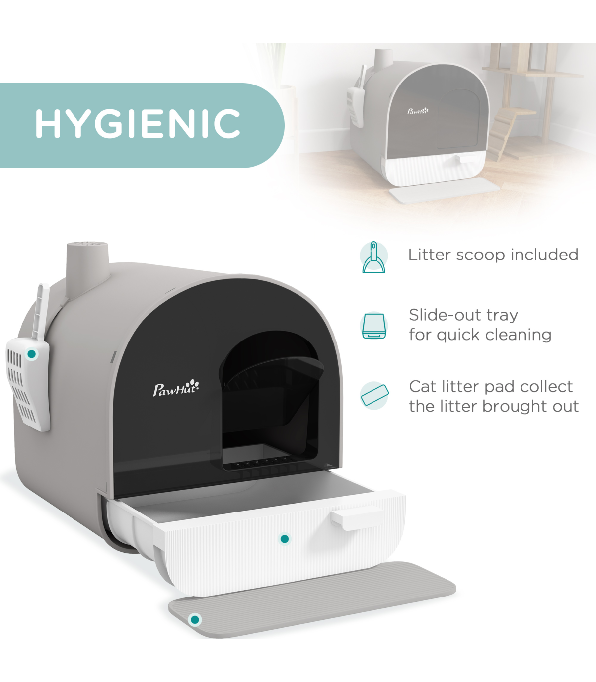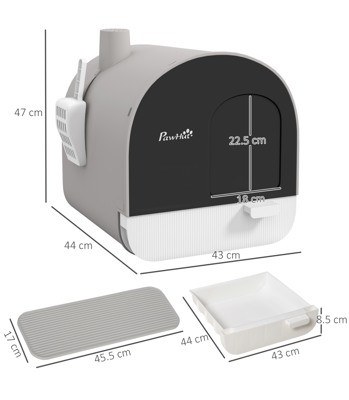 ● Dimensions: 47H x 43L x 44Wcm. Inside: 8.5H x 38L x 34Wcm. Flap door: 18L x 22.5Wcm. Cat litter pad: 45.5L x 17Wcm