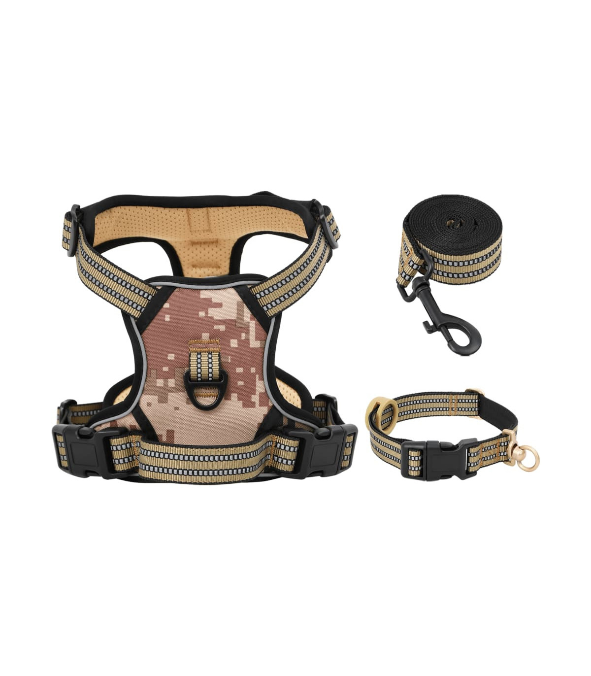 1 x Dog harness1 x Dog lead with 360° rotating safety hook1 x Dog collar