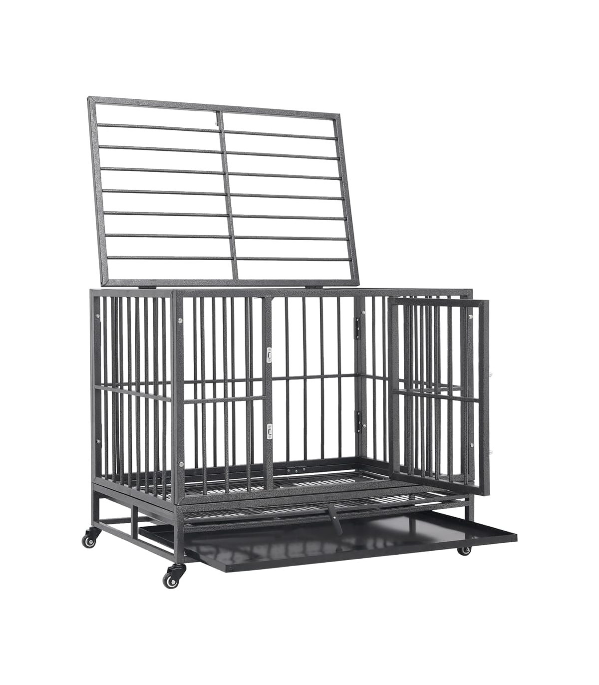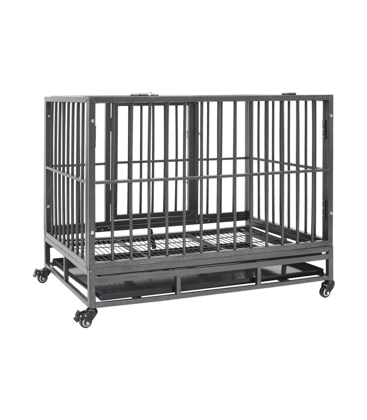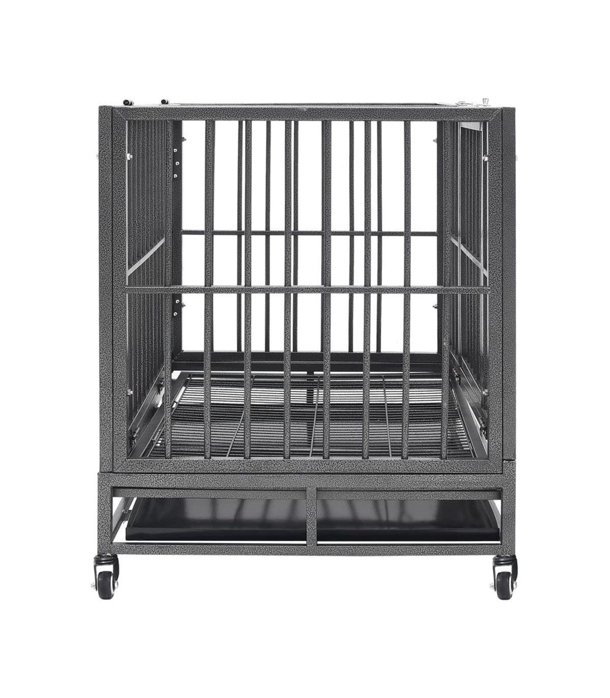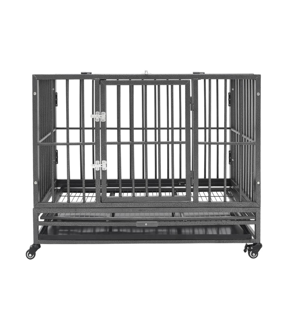 Keep your furry friends in a safe and comfortable enclosed space with this dog cage! This pet cage is equipped with four wheels for easy movement. Two of the wheels are lockable to avoid accidental move. This puppy enclosure features a door with two security latches for easy access. You can easily clean up the cage with its detachable tray. Additionally, the sturdy steel frame provides optimal ventilation and visibility, which offers your dog a comfortable and reliable environment.