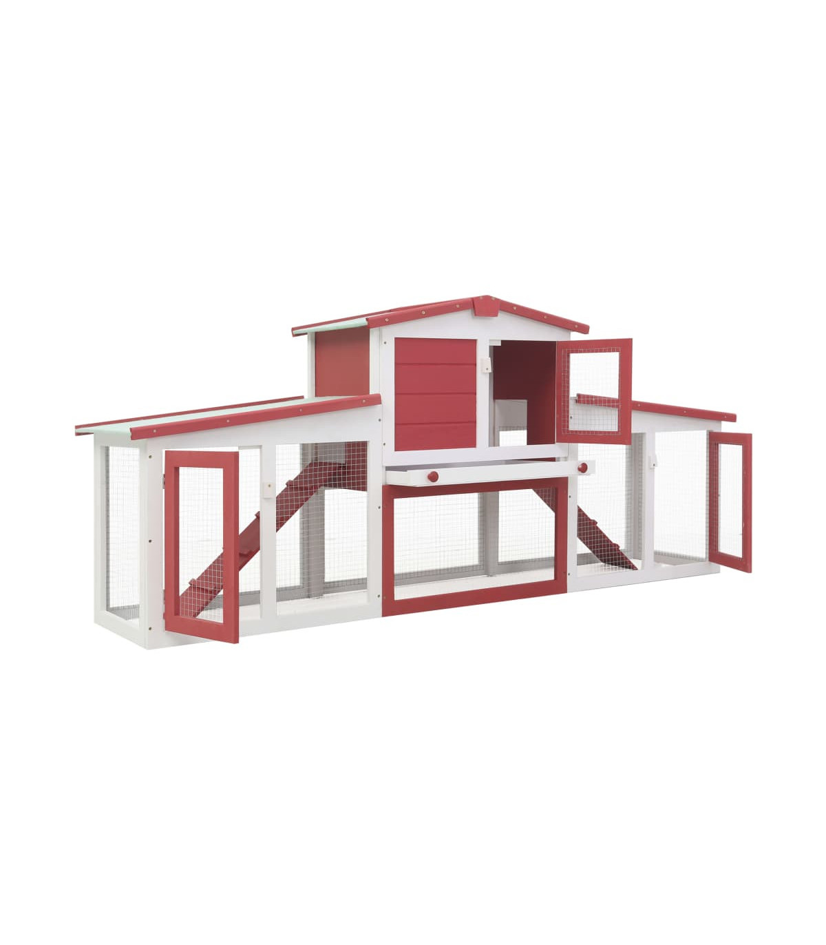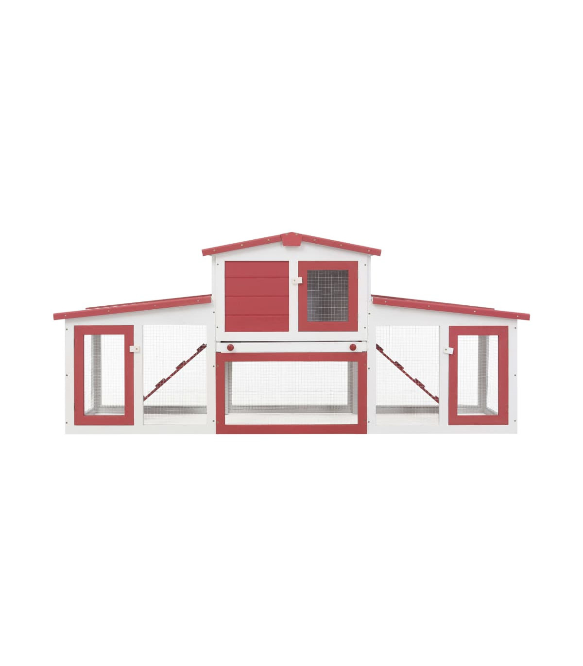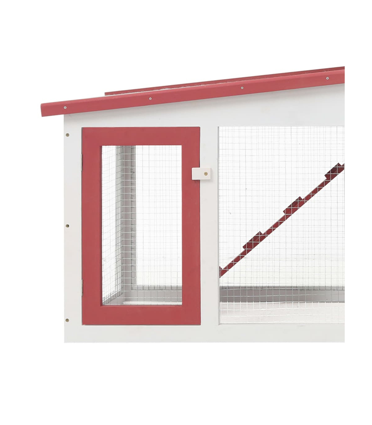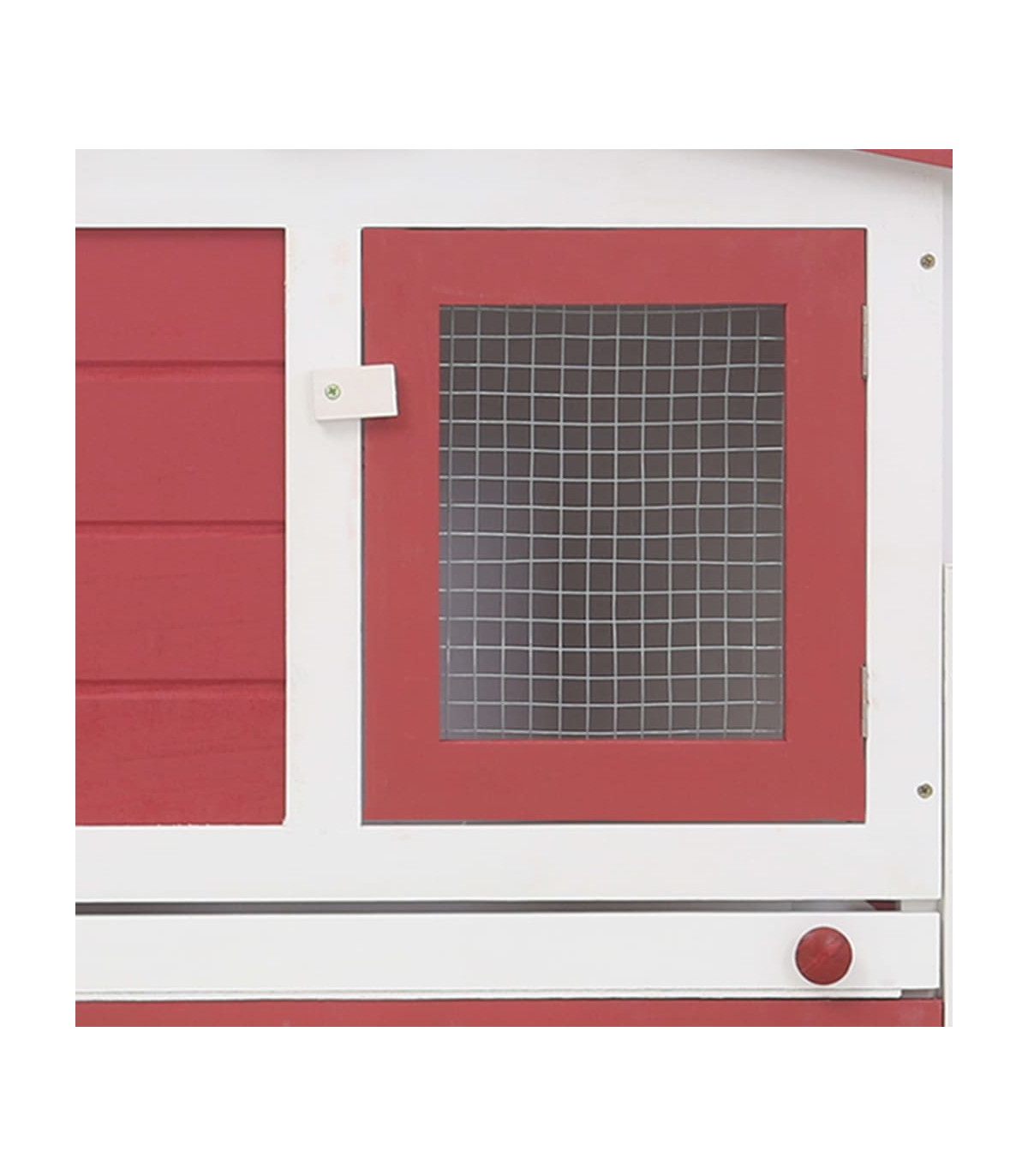 This quality hutch of 2 layers provides a large cozy place for keeping small animals, especially the cute rabbits. It features multiple uses: playing, exercising, training, or simply keeping your pets safely. This rabbit hutch provides your pets with plenty of exercise space while the tight iron wire mesh helps prevent mischievous behaviors and unexpected accidents. Meanwhile, the construction of iron wire grid ensures your monitoring of the pets and enables your pets to keep an eye on the surroundings and get enough fresh air. The rabbit hutch is built with high-quality wood frame, making it a strong and safe enclosure that lasts for years. Its green roof keeps rain away while the cozy cubby makes the perfect sleeping area. Two easy-climb ladders lead from the lower ground level to the upper floor. The pull-out tray makes cleaning easy. And the doors close easily and lock with slide-bolt latches. This spacious wooden rabbit cage is perfect for small pets. Important note: We recommend you placing the rabbit cage under shelter. Accordingly, it will last a longer life.