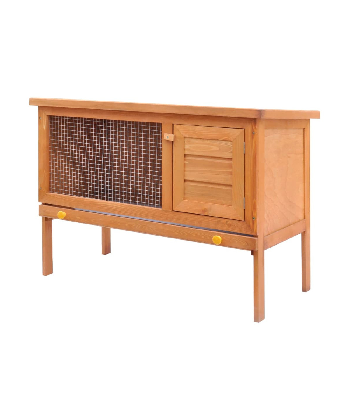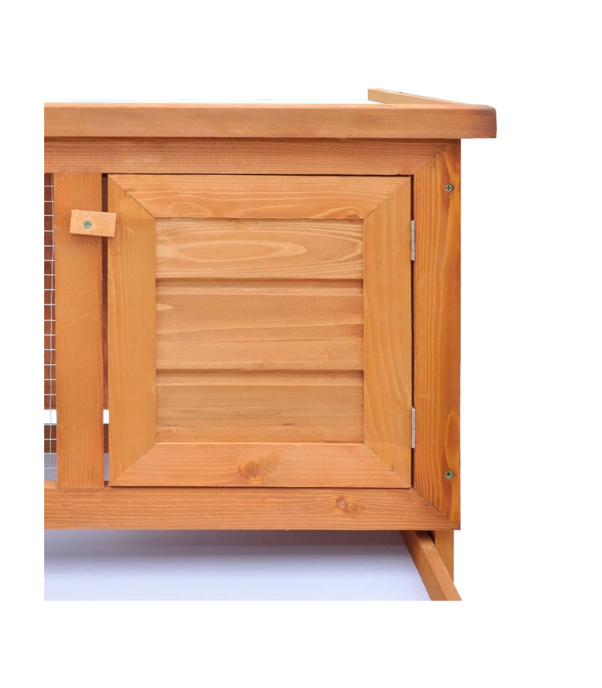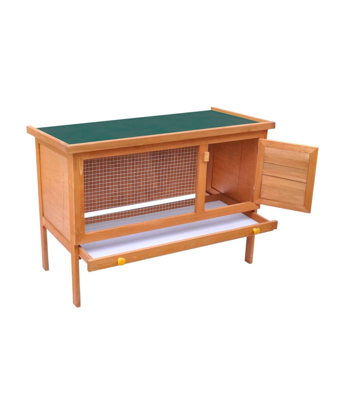 This quality hutch provides a large cozy place for keeping small animals, especially the cute rabbits. It features multiple uses: playing, exercising, training, or simply keeping your pets safely. This rabbit hutch provides your pets with plenty of exercise space while the tight iron wire mesh helps prevent mischievous behaviors and unexpected accidents. Meanwhile, the construction of iron wire grid ensures your monitoring of the pets and guarantees your pets a wide field of view and enough fresh air. The rabbit hutch is built with high-quality wood frame, making it a strong and safe enclosure that lasts for years. Its green asphalt roof keeps rain away while the cozy cubby makes the perfect sleeping quarter. And the top roof can be opened to catch or release your pets. A pull-out tray makes cleaning easy. And the door closes easily and locks with a slide-bolt latch. This wooden rabbit cage is perfect for small pets. Important note: We recommend you placing the rabbit cage under shelter. Accordingly, it will last a longer life.