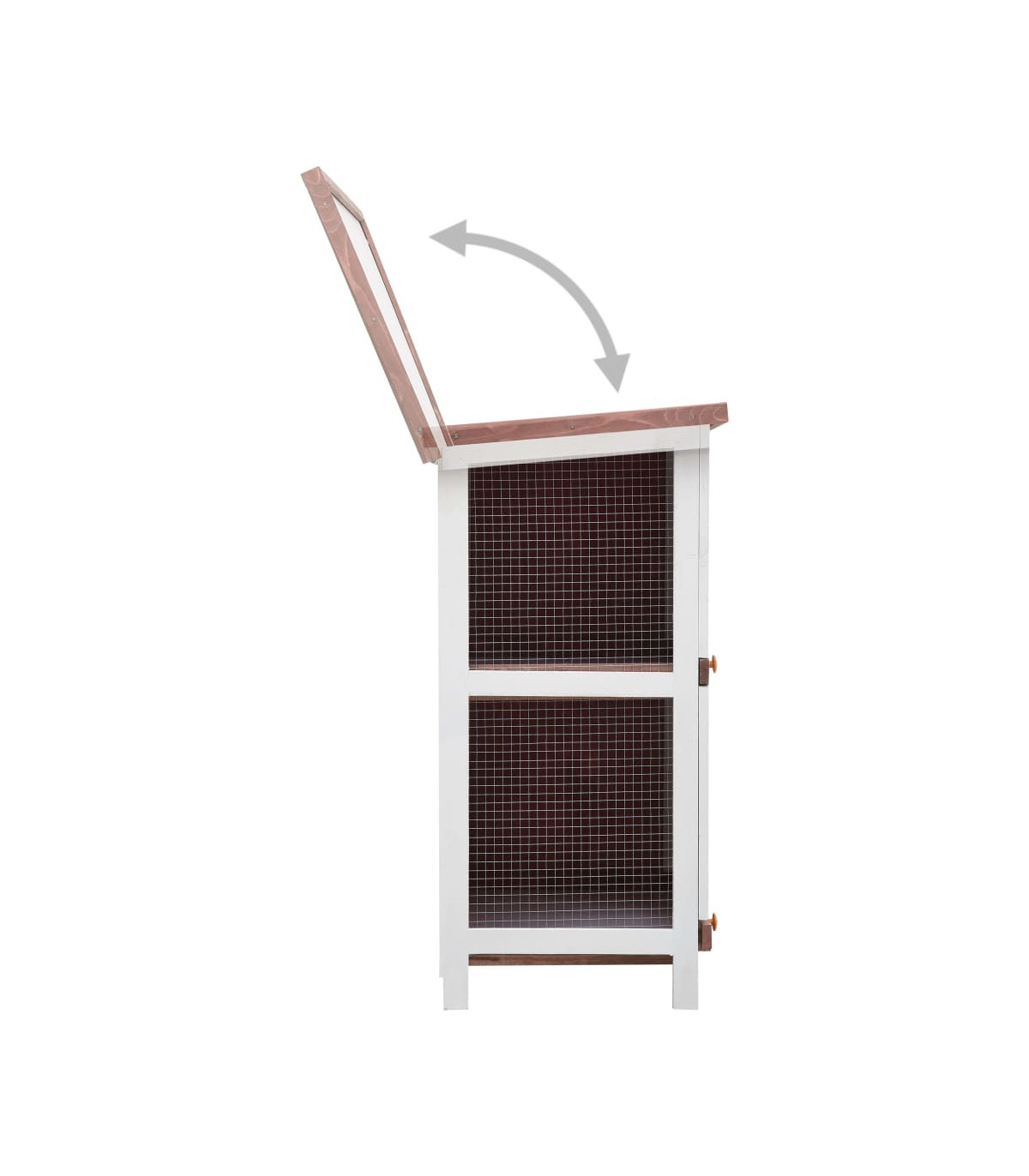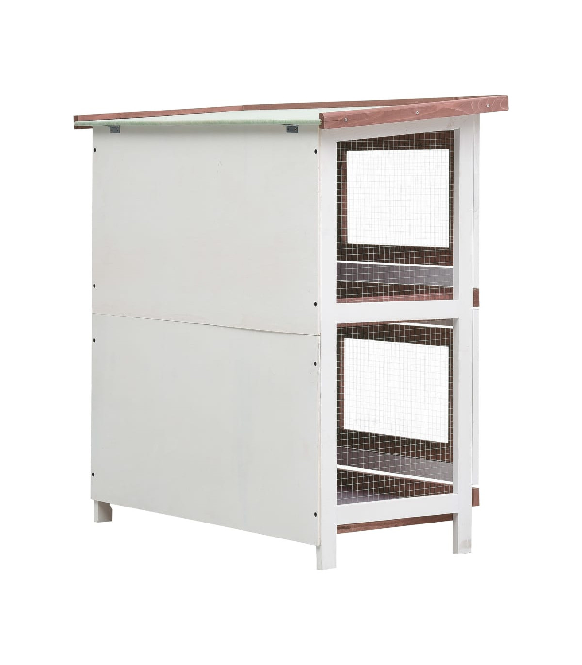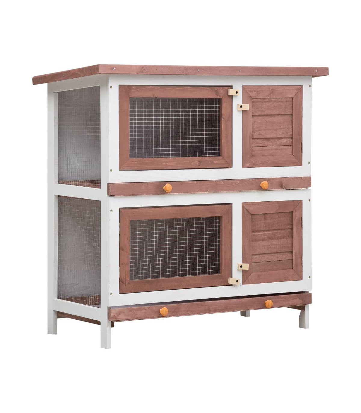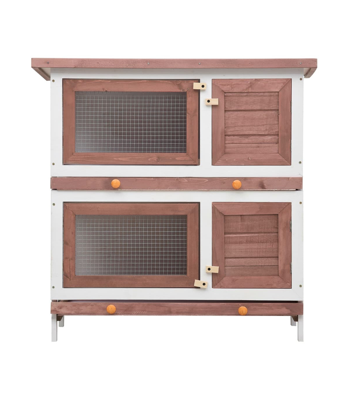 This quality hutch of 2 layers provides a large cozy place for keeping small animals, especially the cute rabbits. It features multiple uses: playing, exercising, training, or simply keeping your pets safely. This rabbit hutch provides your pets with plenty of exercise space while the tight iron wire mesh helps prevent mischievous behaviors and unexpected accidents. Meanwhile, the construction of iron wire grid ensures your monitoring of the pets and enables your pets to keep an eye on the surroundings and get enough fresh air. The rabbit hutch is built with high-quality wood frame, making it a strong and safe enclosure that lasts for years. Its green roof keeps rain away while the cozy cubby makes the perfect sleeping area. Two pull-out trays make cleaning easy. And the doors close easily and lock with slide-bolt latches. This wooden rabbit cage is perfect for small pets. Important note: We recommend you placing the rabbit cage under shelter. Accordingly, it will last a longer life.