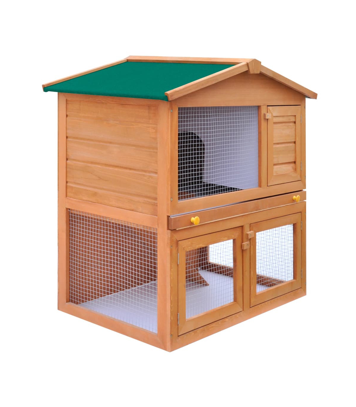 This quality hutch of 2 layers provides a large cozy place for keeping small animals, especially the cute rabbits. It features multiple uses: playing, exercising, training, or simply keeping your pets safely. This rabbit hutch provides your pets with plenty of exercise space while the tight iron wire mesh helps prevent mischievous behaviors and unexpected accidents. Meanwhile, the construction of iron wire grid ensures your monitoring of the pets and enables your pets to keep an eye on the surroundings and get enough fresh air. The rabbit hutch is built with high-quality wood frame, making it a strong and safe enclosure that lasts for years. Its green roof keeps rain away while the cozy cubby makes the perfect sleeping area. An easy-climb ramp leads from the lower ground level to the upper floor. A pull-out tray makes cleaning easy. And the doors close easily and lock with slide-bolt latches. This wooden rabbit cage is perfect for small pets. Important note: We recommend you placing the rabbit cage under shelter. Accordingly, it will last a longer life.