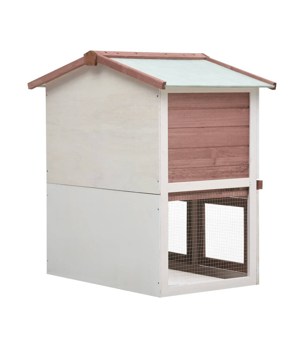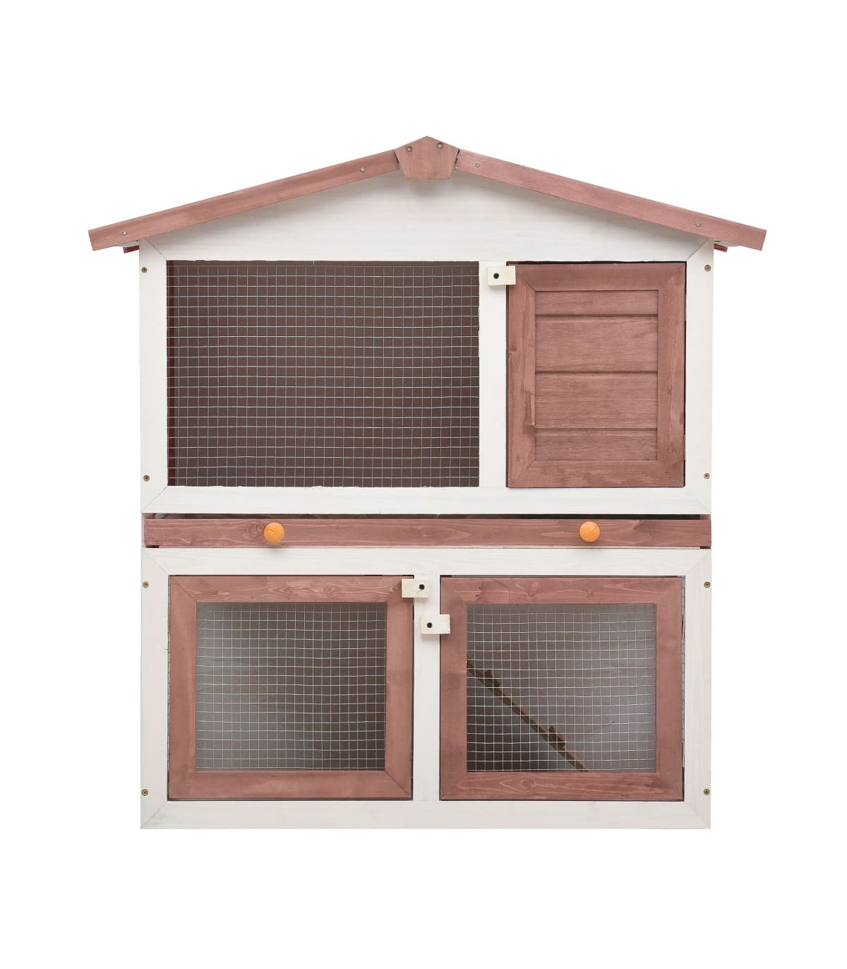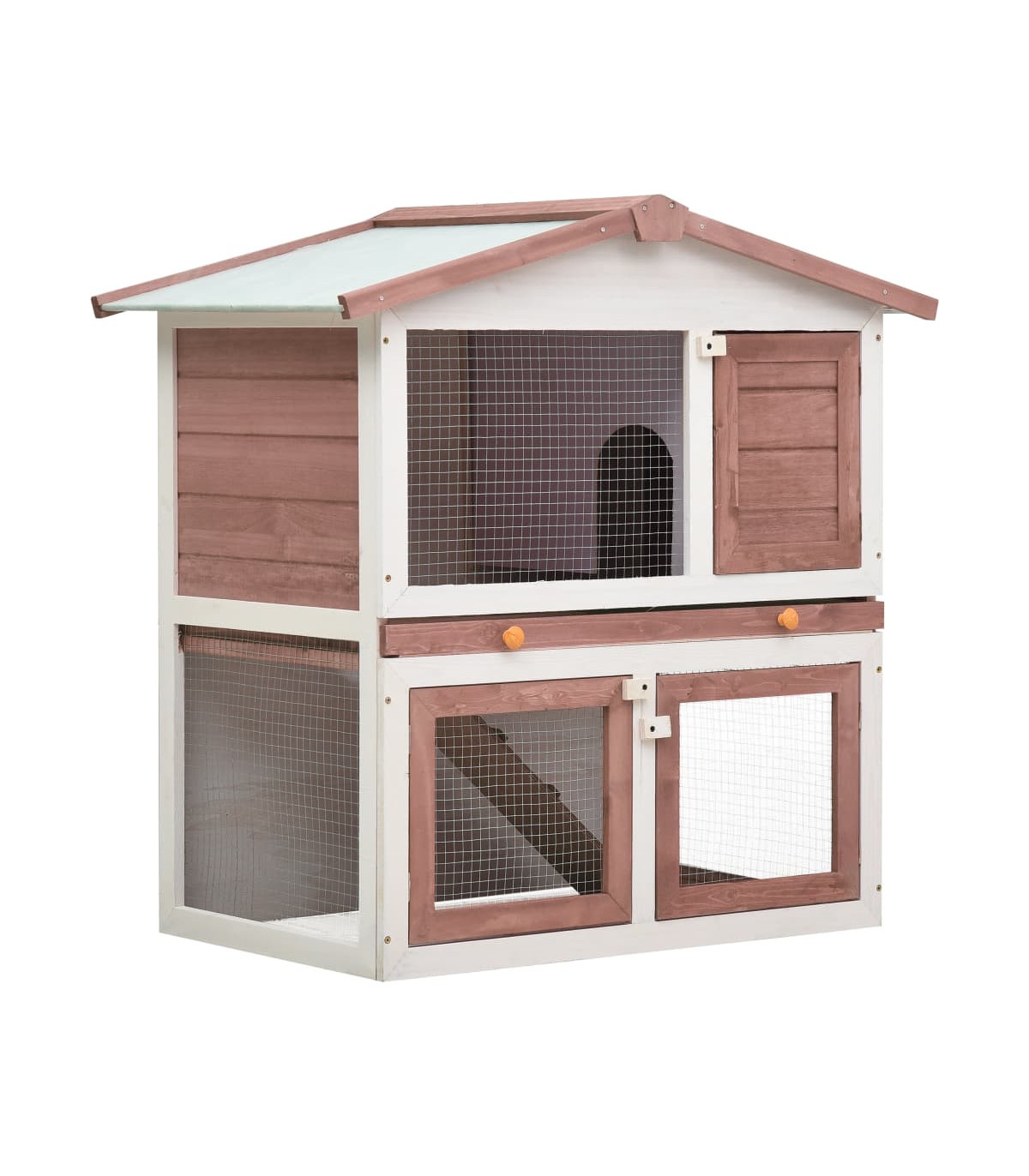 This quality hutch of 2 layers provides a large cozy place for keeping small animals, especially the cute rabbits. It features multiple uses: playing, exercising, training, or simply keeping your pets safely. This rabbit hutch provides your pets with plenty of exercise space while the tight iron wire mesh helps prevent mischievous behaviors and unexpected accidents. Meanwhile, the construction of iron wire grid ensures your monitoring of the pets and enables your pets to keep an eye on the surroundings and get enough fresh air. The rabbit hutch is built with high-quality wood frame, making it a strong and safe enclosure that lasts for years. Its green roof keeps rain away while the cozy cubby makes the perfect sleeping area. An easy-climb ramp leads from the lower ground level to the upper floor. A pull-out tray makes cleaning easy. And the doors close easily and lock with slide-bolt latches. This wooden rabbit cage is perfect for small pets. Important note: We recommend you placing the rabbit cage under shelter. Accordingly, it will last a longer life.