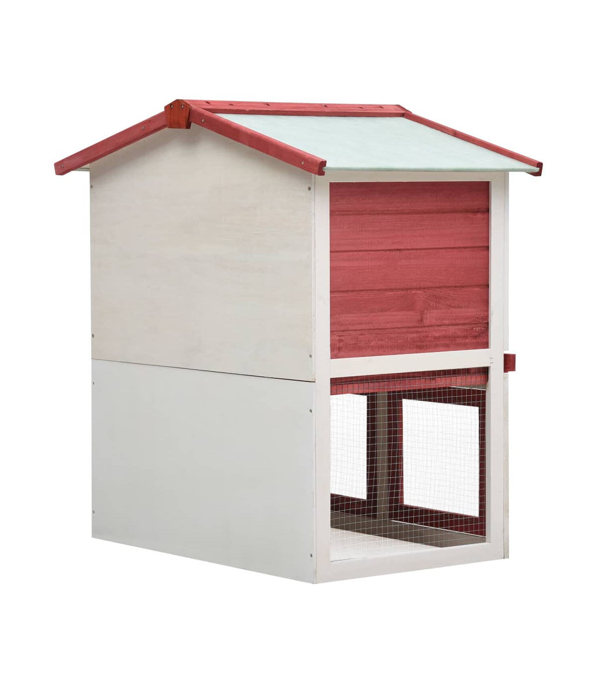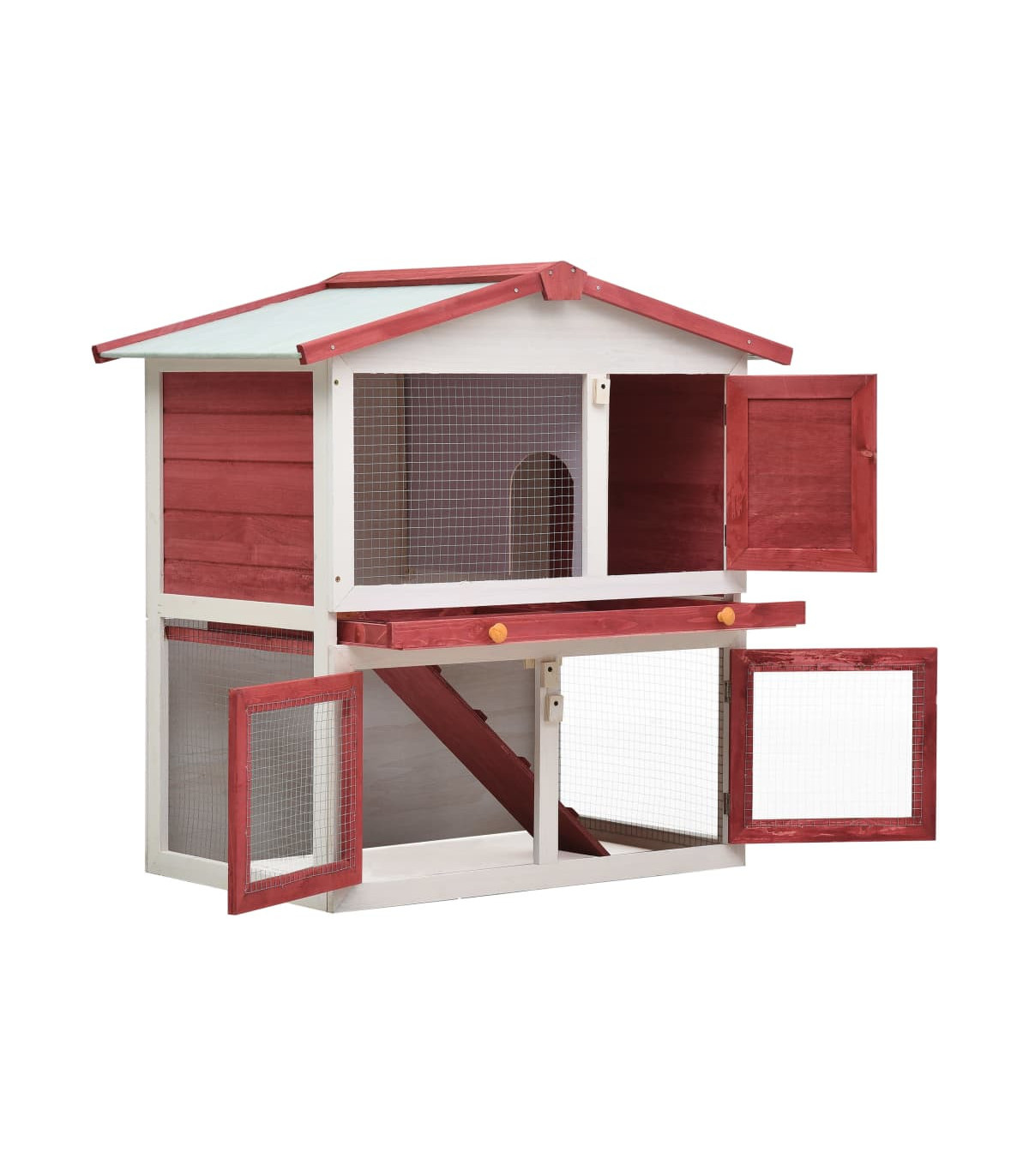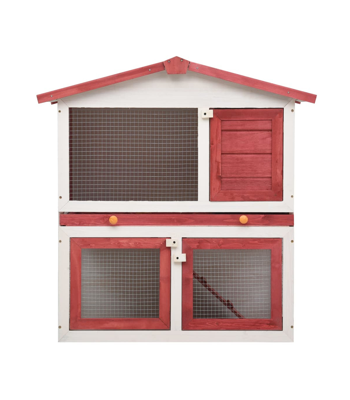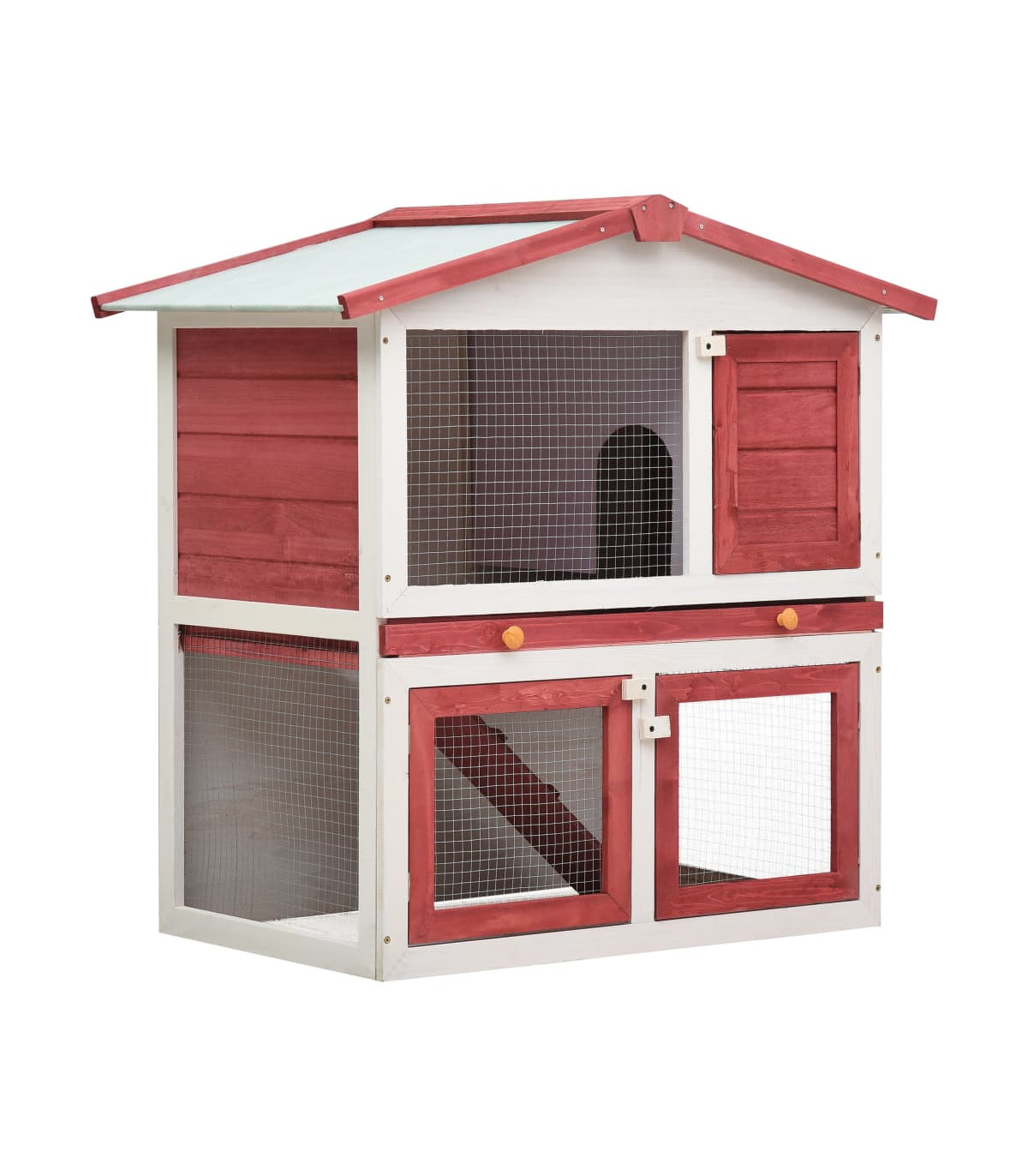 This quality hutch of 2 layers provides a large cozy place for keeping small animals, especially the cute rabbits. It features multiple uses: playing, exercising, training, or simply keeping your pets safely. This rabbit hutch provides your pets with plenty of exercise space while the tight iron wire mesh helps prevent mischievous behaviors and unexpected accidents. Meanwhile, the construction of iron wire grid ensures your monitoring of the pets and enables your pets to keep an eye on the surroundings and get enough fresh air. The rabbit hutch is built with high-quality wood frame, making it a strong and safe enclosure that lasts for years. Its green roof keeps rain away while the cozy cubby makes the perfect sleeping area. An easy-climb ramp leads from the lower ground level to the upper floor. A pull-out tray makes cleaning easy. And the doors close easily and lock with slide-bolt latches. This wooden rabbit cage is perfect for small pets. Important note: We recommend you placing the rabbit cage under shelter. Accordingly, it will last a longer life.