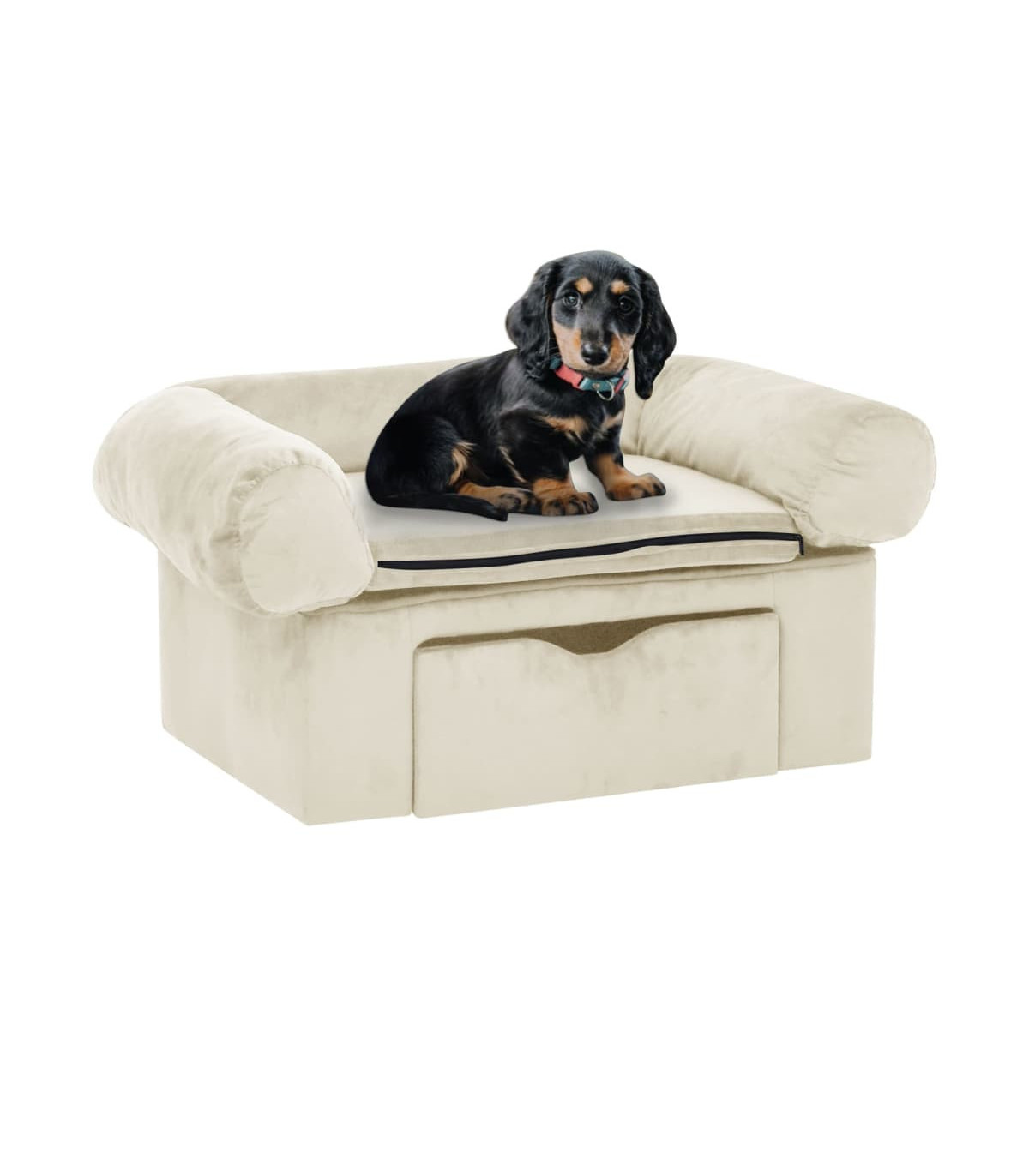 This dog sofa with a storage drawer allows your pet to have its own space in your living room or bedroom. It can also be used for cats and other small animals. This thickly padded pet sofa, featuring a wooden frame covered with soft plush, provides a comfortable place for your beloved little friends. Thanks to the underneath drawer, you can keep your dog's belongings well organised and within reach. Additionally, the outer body is exceedingly sturdy, offering a safe place for your pet to relax. The cushion cover is washable to maintain freshness. Important note: Please confirm the size is suitable for your pets before purchase.