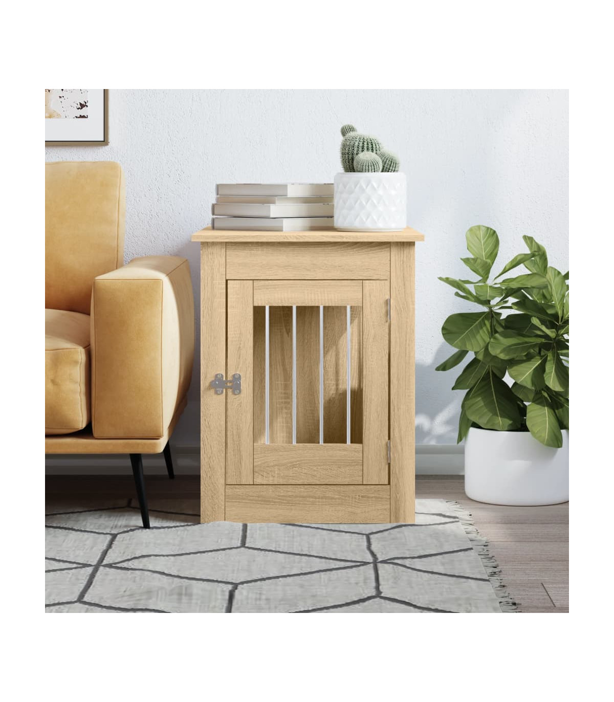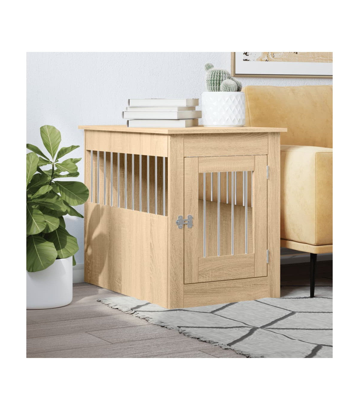 This dog crate furniture, serving as both a dog cage and an end table, makes a practical and eye-catching addition to your living room. Sturdy construction: The doghouse is made of steel wires and engineered wood, ensuring both safety and durability. The engineered wood is of exceptional quality with smooth surface and also features strength, stability and resistance to moisture.2-in-1 function: This dog kennel perfectly combines style and functions. It not only provides your furry friend with a cosy spot to nap but also doubles as an end table for you to place your favorite decorations.Ventilation design: The steel wire windows allow air to flow properly in the dog cage and prevent bad odours, creating a comfy sleeping environment for your dogs.Lockable door: This dog crate has a latched door for extra safety. Additionally, you can install the door either on the left side or right side based on your own needs.