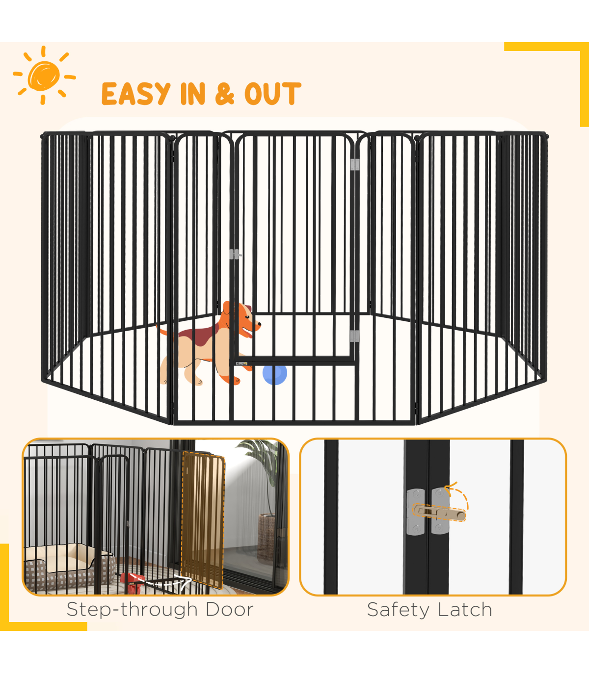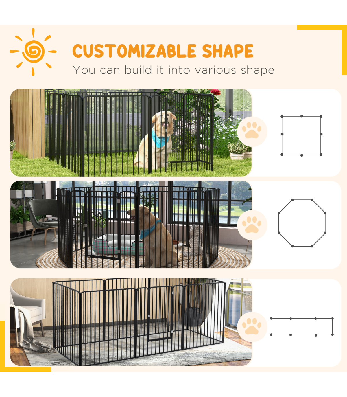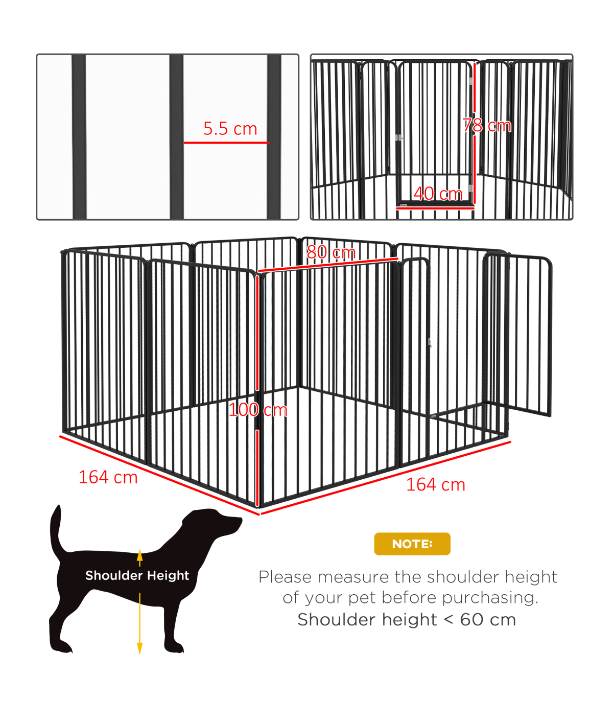 ● Overall dimensions: Square: 100H x 164L x 164Wcm. Single panel: 100H x 80Wcm. Door: 78H x 40Wcm. Bar spacing: 5.5cm