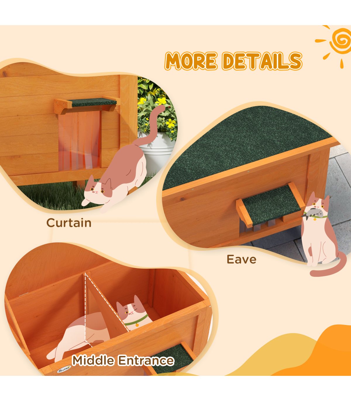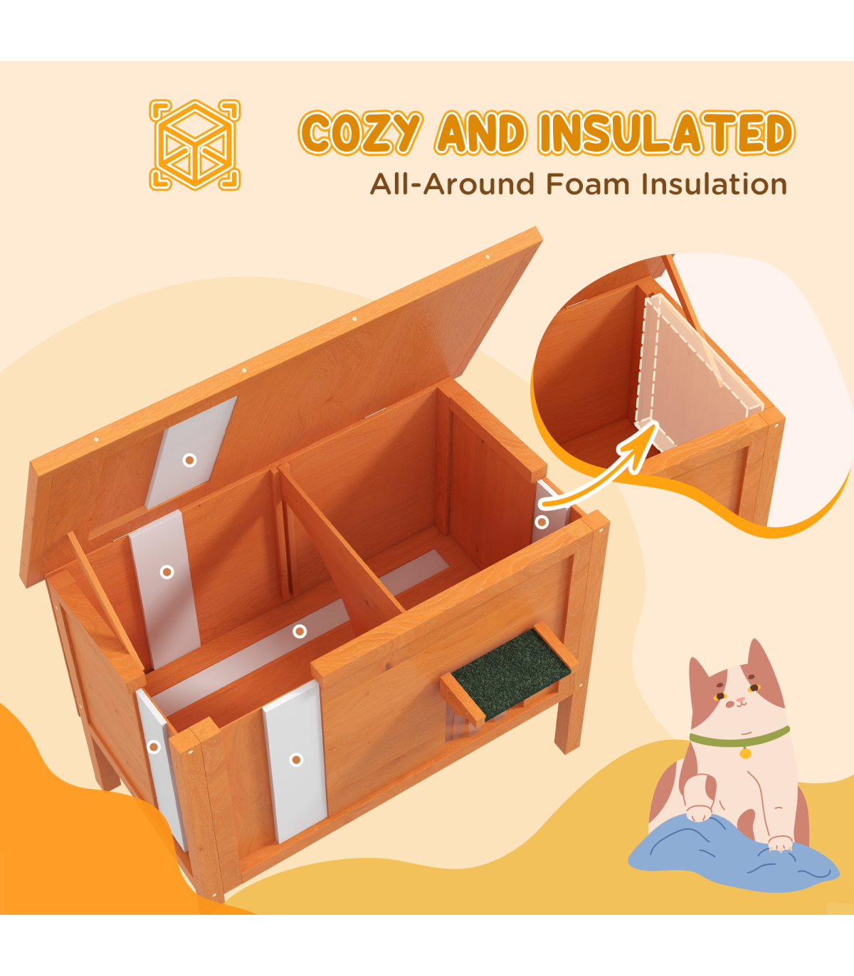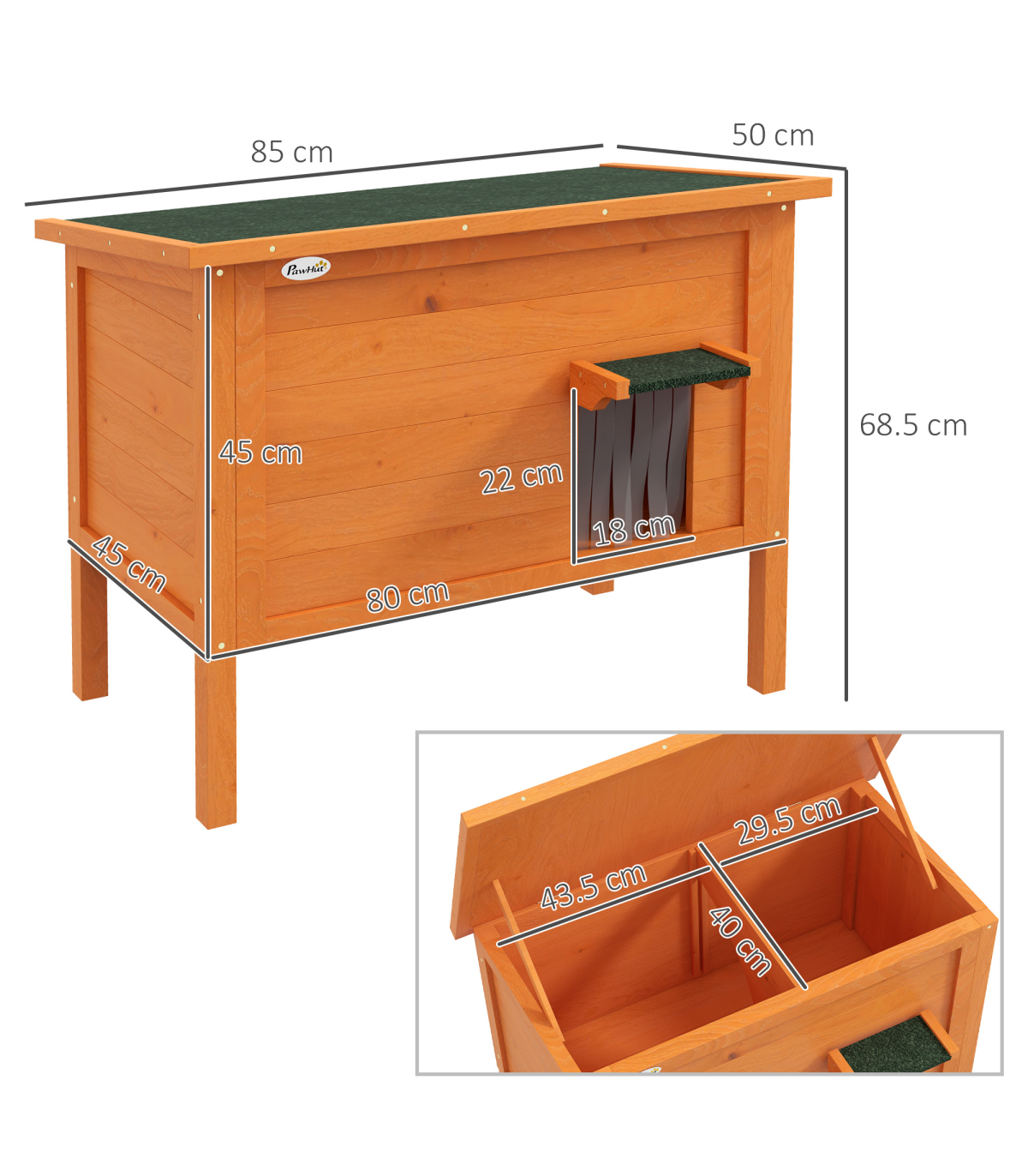 ● Six sides of foam insulation, maintaining a comfortable temperature inside the cat house ● With an openable roof and removable bottom floor, it's easy to access and clean ● The slanted asphalt roof offers weather protection ● A curtained door and middle entrance, providing privacy and easy access ● A fir wood structure for durability ● Suitable for 1-2 cats, each up to 5kg ● Assembly required ● Colour: Orange and black ● Material: Fir wood and foam ● Dimensions: With eave: 68.5H x 85L x 50Wcm ● Rear eave height: 62cm ● Main house: 45H x 80L x 45Wcm ● Inside dimension: 41.5H x 73L x 40Wcm ● Middle entrance: 20H x 18.5Wcm ● Door opening: 22H x 18Wcm ● Door eave: 6H x 22.5W x 9.5Dcm ● Off the ground: 21cm ● Item label: D30-787V00OG