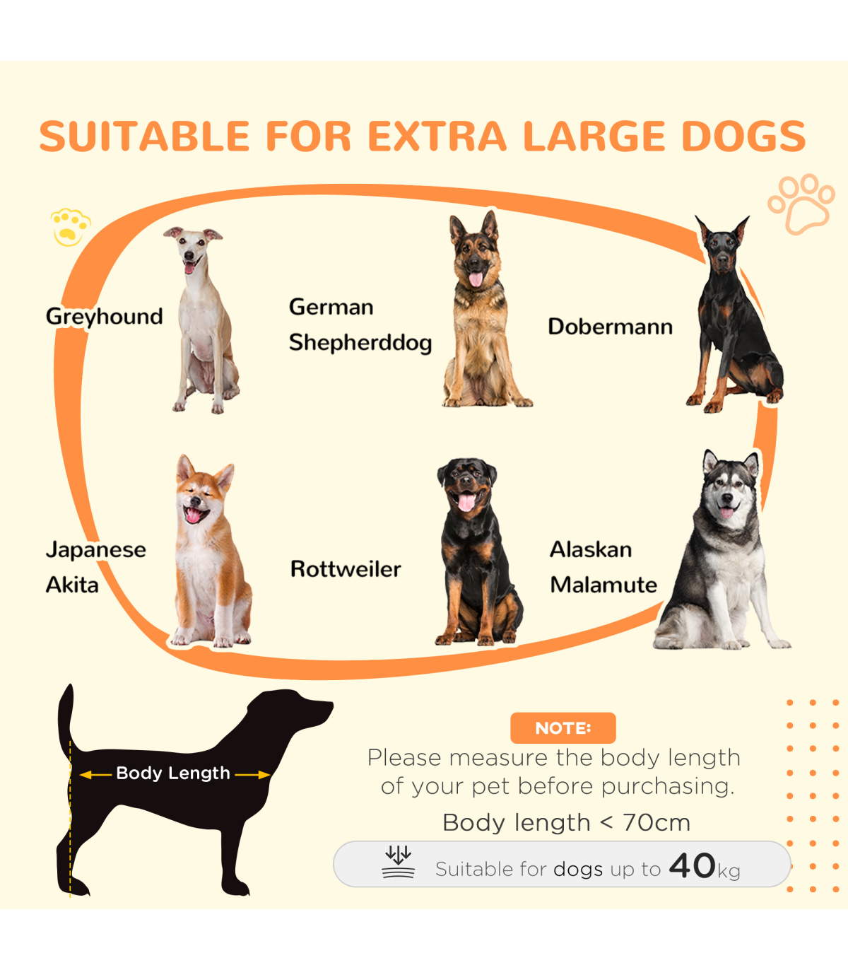 ● Suitable for extra large-sized dogs up to 40kg and body length up to 70cm