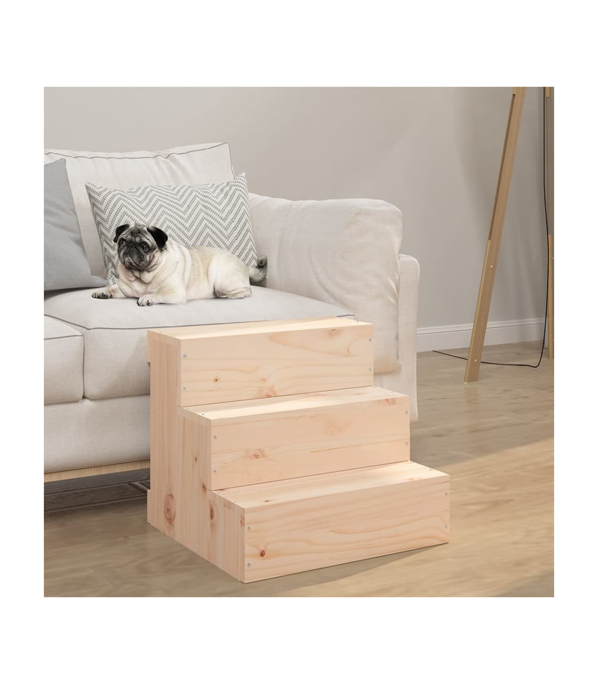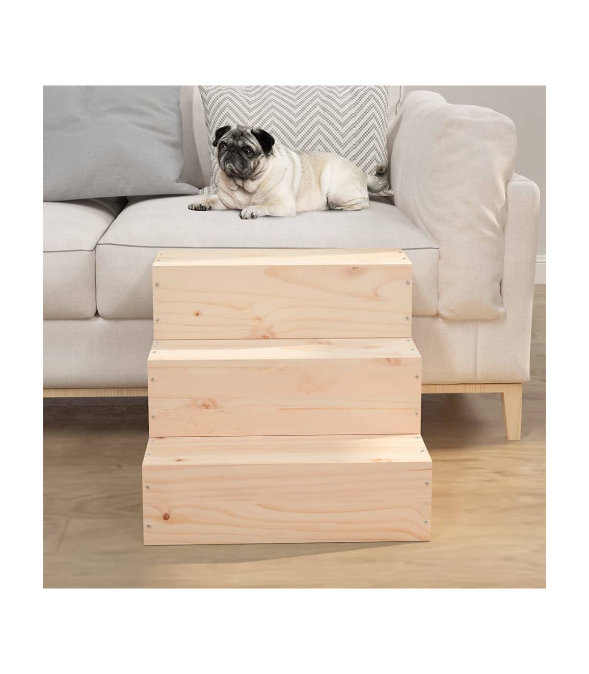 This wooden pet stair makes it easier for your pet to get up and down higher places. Solid pine wood: Solid pine wood is a beautiful natural material. Pine wood has a straight grain, and the knots give the material its signature, rustic look.Sturdy frame: The wooden frame ensures sturdiness and stability.Pet-friendly design: You can place the cat stair near the sofa or bed to help small, elderly or sick dogs and even cats get up and down easily. Note:Each product comes with an assembly manual in the box for easy assembly.