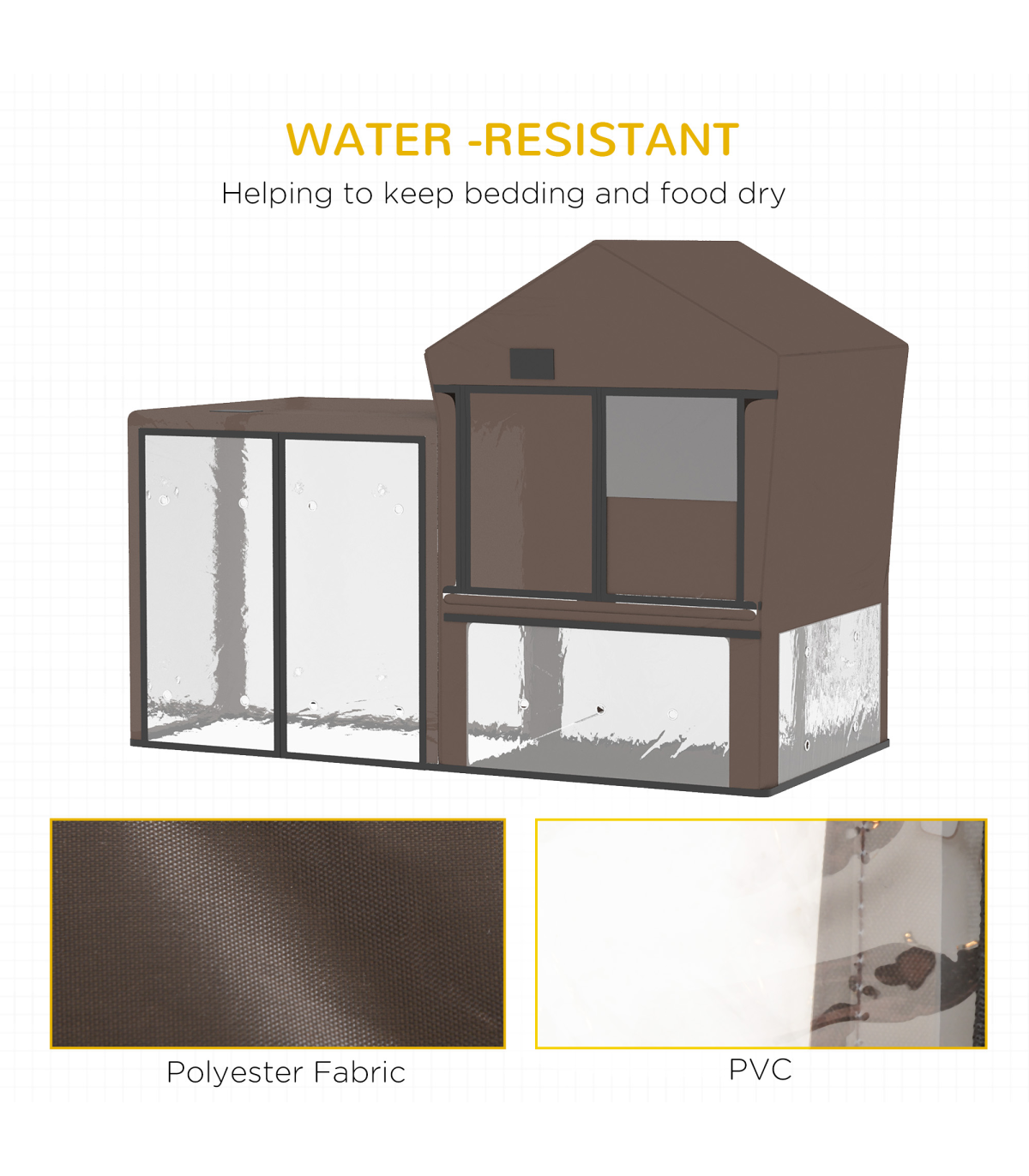 - "Rabbit Hutch Cover, Bunny Guinea Pig Cage Protector Water-Resistant Cover" - Description: - PROTECTIVE COVER: Keeps your hutch in good condition, especially in adverse weather. Includes a zipped door for quick access. - GOOD VENTILATION: Small holes prevent condensation and dampness. - WATER AND UV-RESISTANT: Made from high-density polyester fabric with coating, withstands wet weather and easy to clean. - SECURE FIT: Firm and holds in place perfectly, ideal for windy days. - Suitable for these SKUs: D51-175, D51-088GY. - DIMENSIONS: 90H x 124L x 65Wcm.