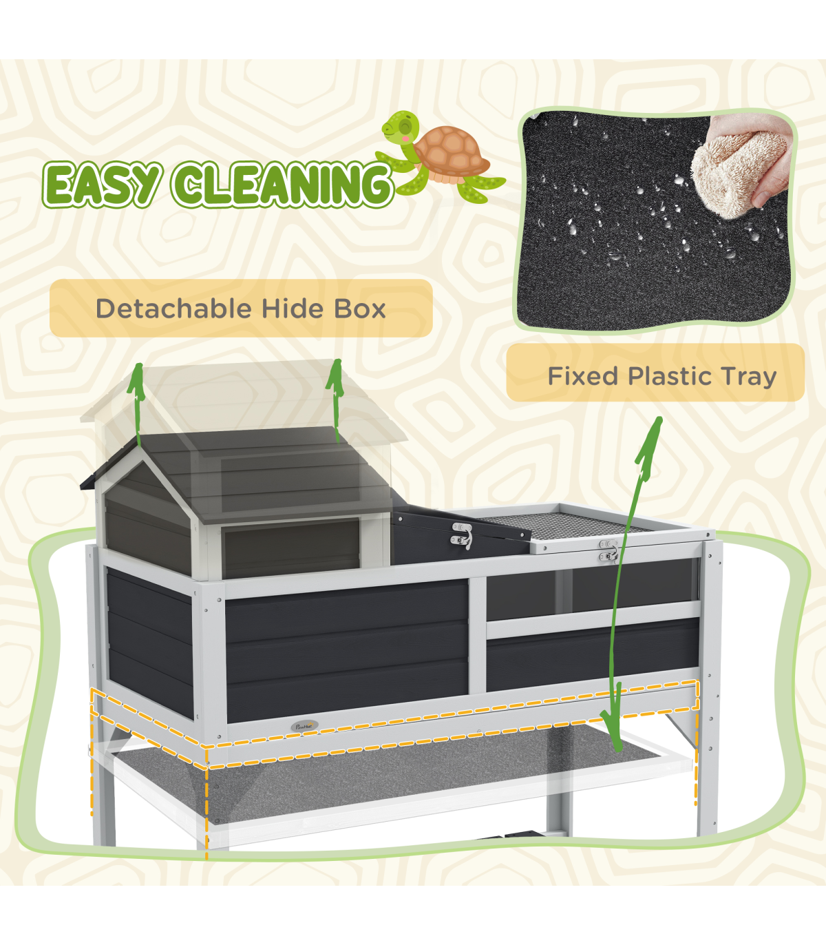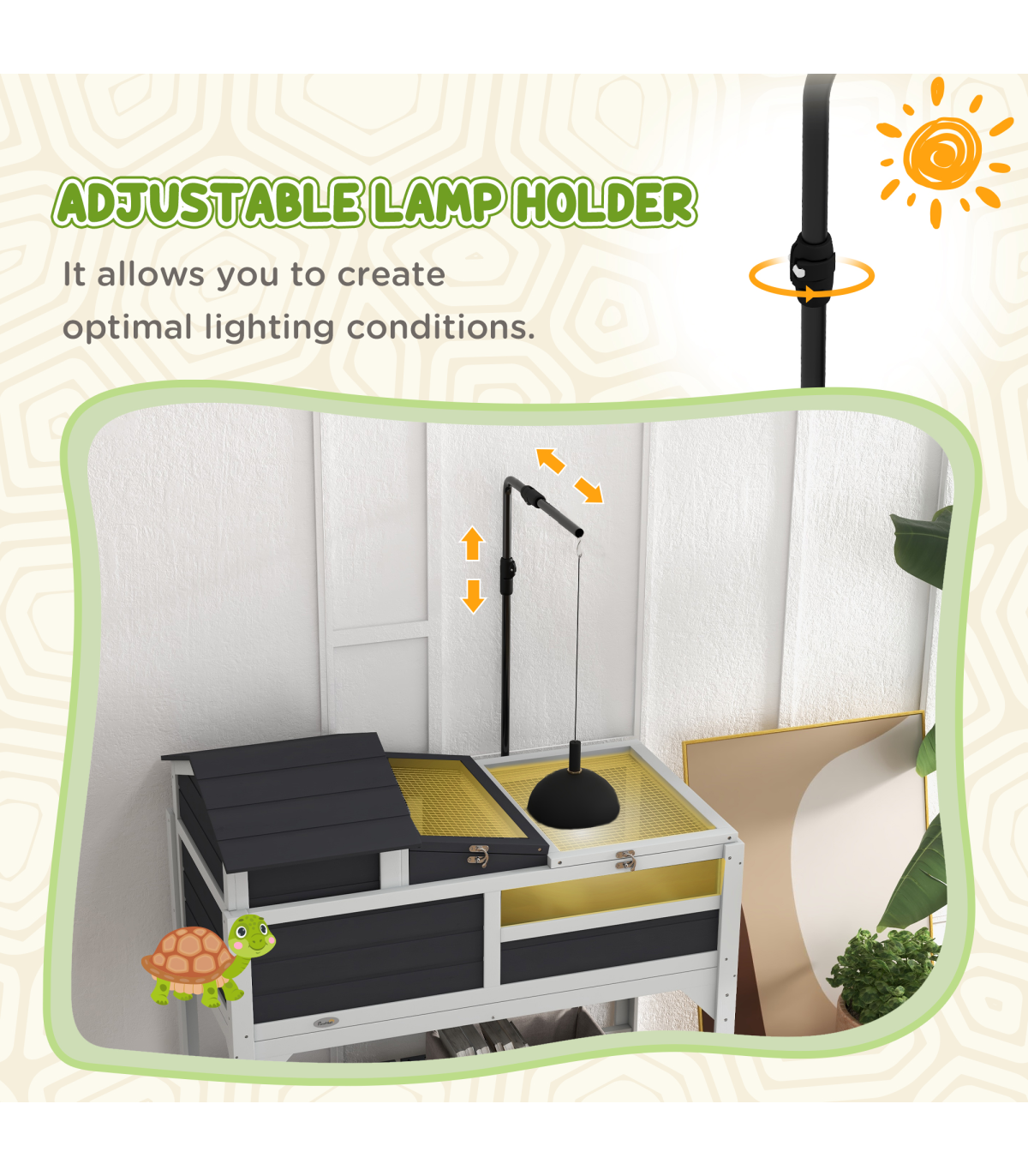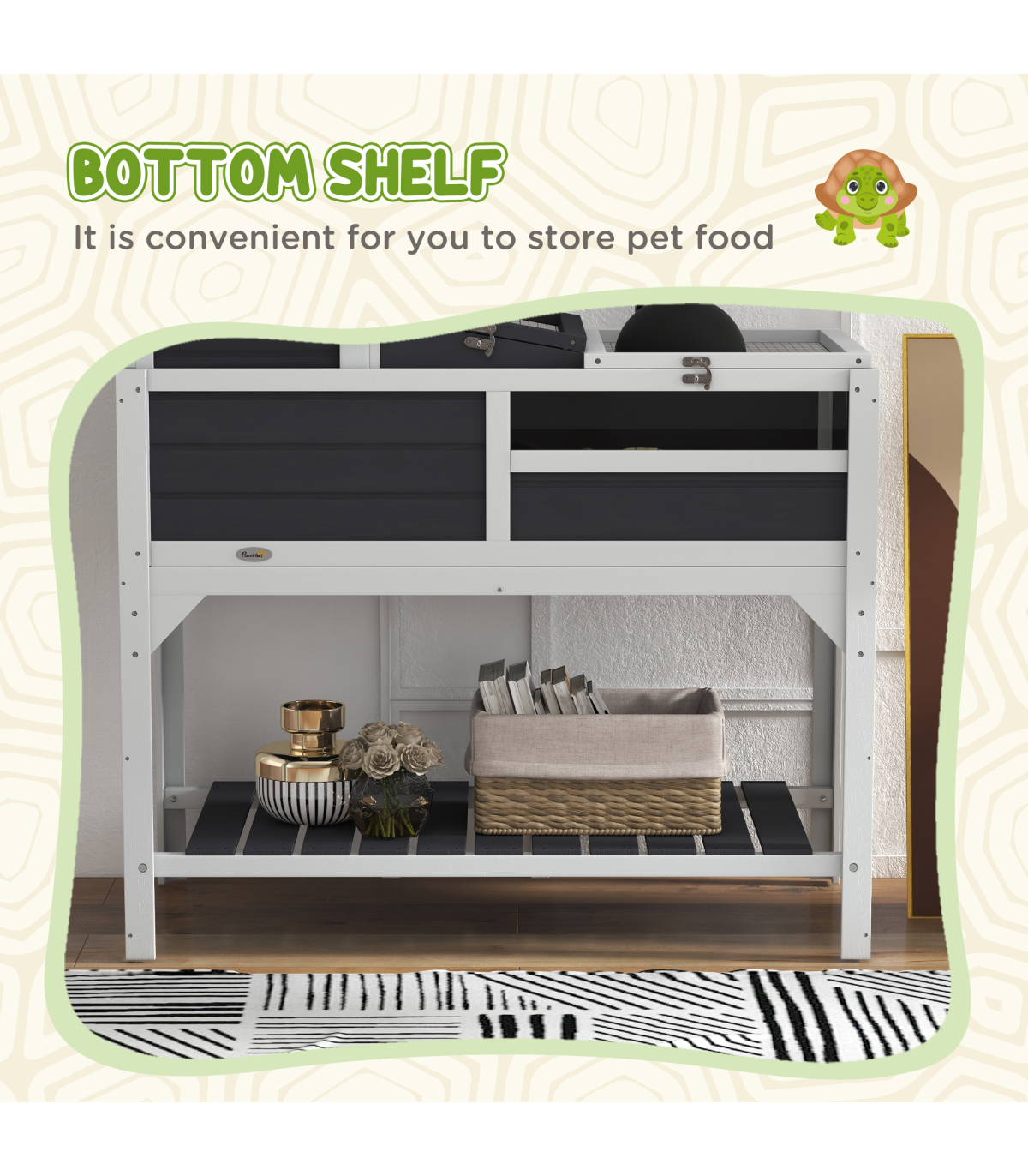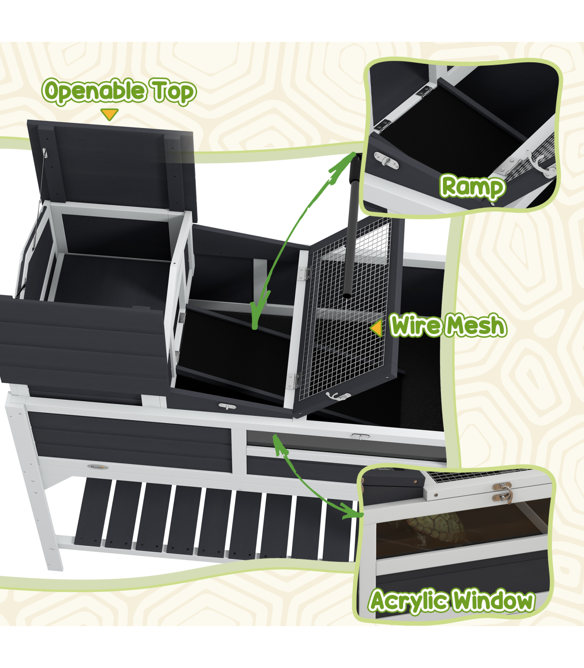 ● Overall dimensions: Without lamp holder: 104H x 102L x 56Wcm. Inside main house: 26L x 44Wcm. Area: 0.11m². Inside basking area: 95L x 48.5Wcm. Area: 0.46m². Inside door: 14H x 16Wcm. Plastic tray: 99W x 52.5Dcm. Window: 9H x 44Wcm. Ramp: 17.5H x 57Wcm. Lamp holder: 80-100H x 36-56Wcm. Bottom storage shelf: 35H x 86W x 52.5Dcm