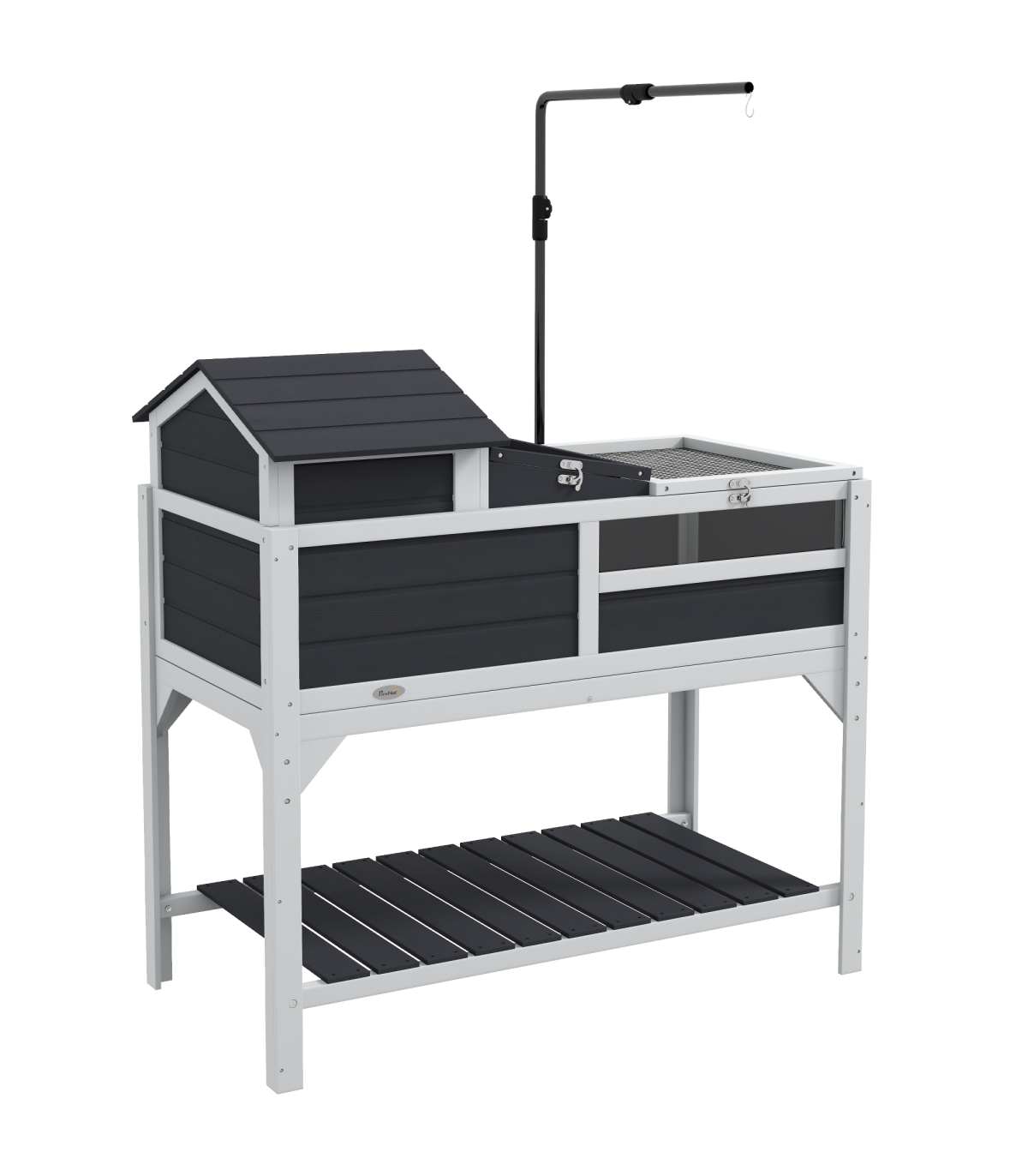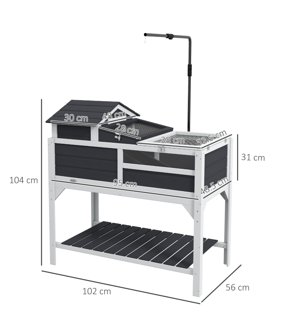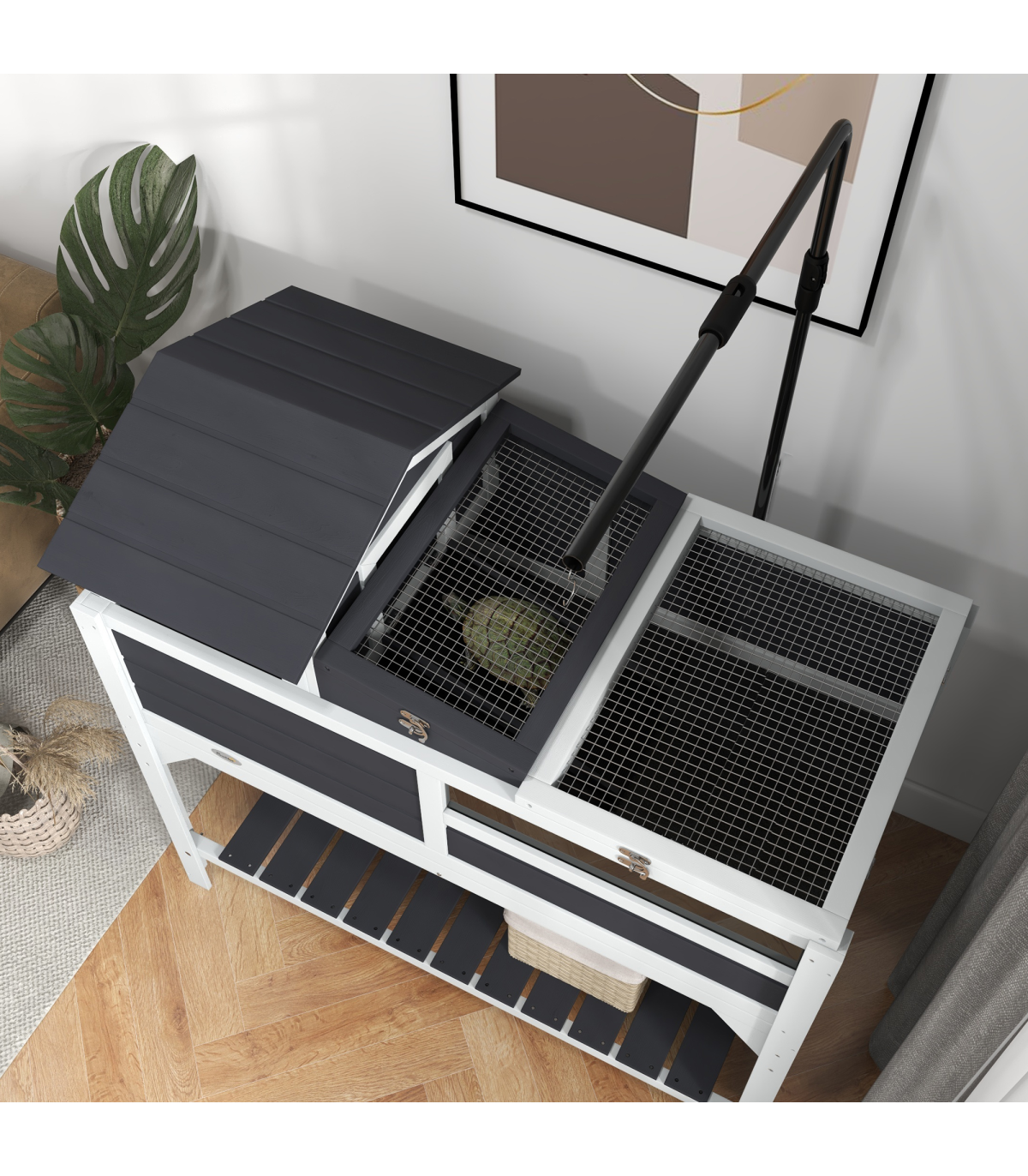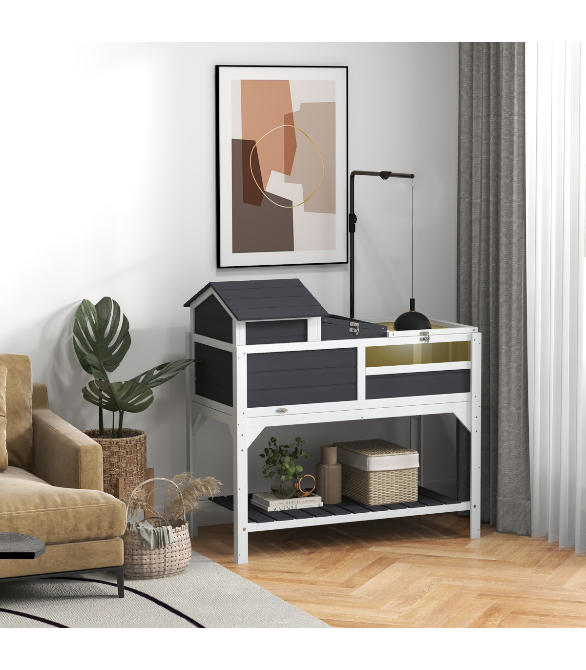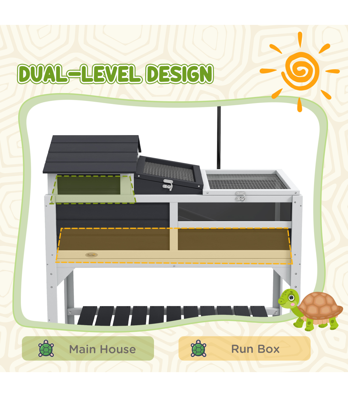 ● Overall dimensions: Without lamp holder: 104H x 102L x 56Wcm. Inside main house: 26L x 44Wcm. Area: 0.11m². Inside basking area: 95L x 48.5Wcm. Area: 0.46m². Inside door: 14H x 16Wcm. Plastic tray: 99W x 52.5Dcm. Window: 9H x 44Wcm. Ramp: 17.5H x 57Wcm. Lamp holder: 80-100H x 36-56Wcm. Bottom storage shelf: 35H x 86W x 52.5Dcm