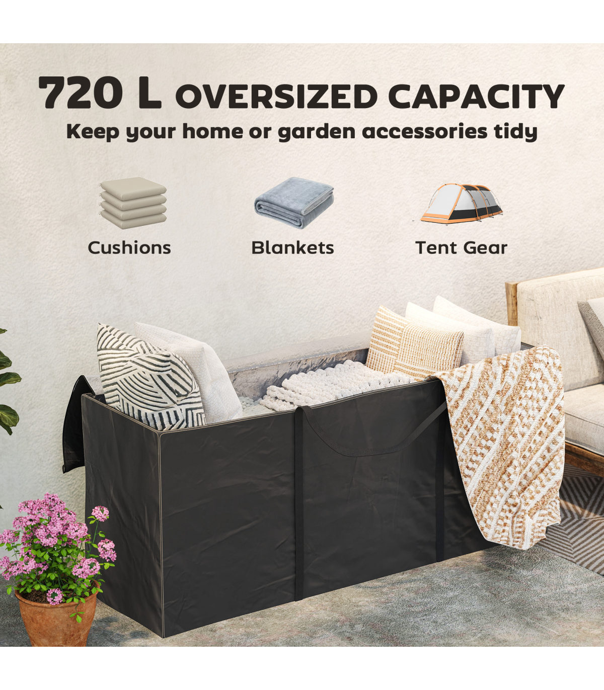 ● 720 L extra large capacity for beddings, cushions, blankets, tents or Christmas trees