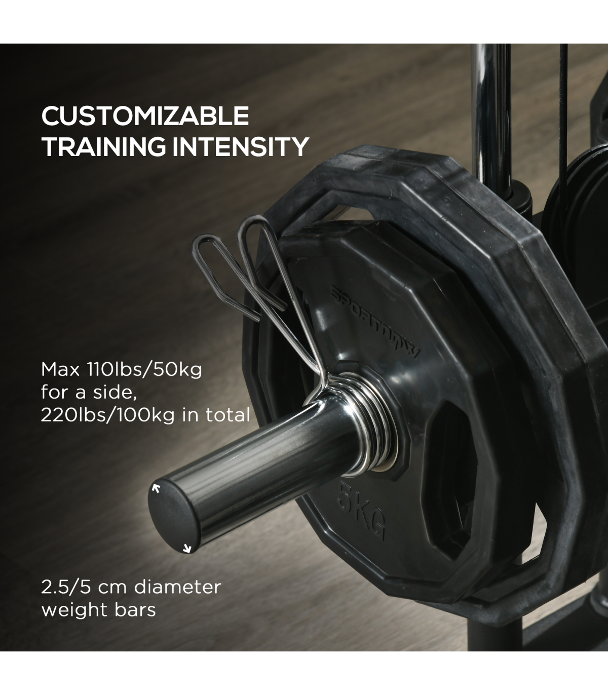● Compatible with 2.5 and 5 cm weight plates via adaptors