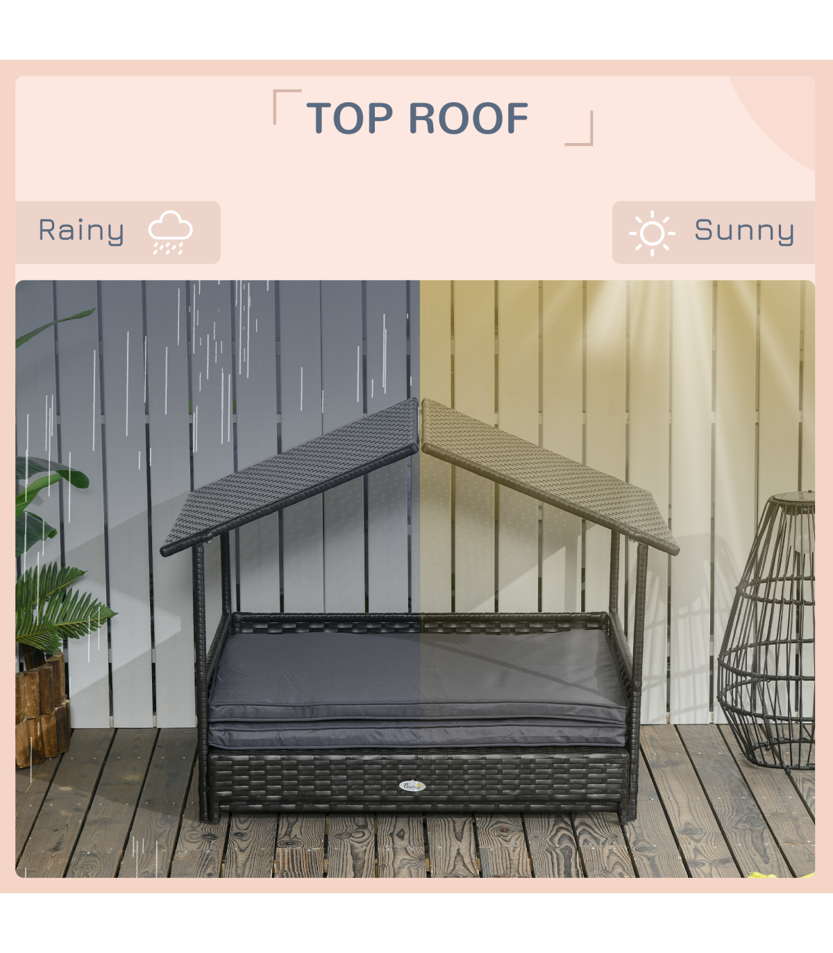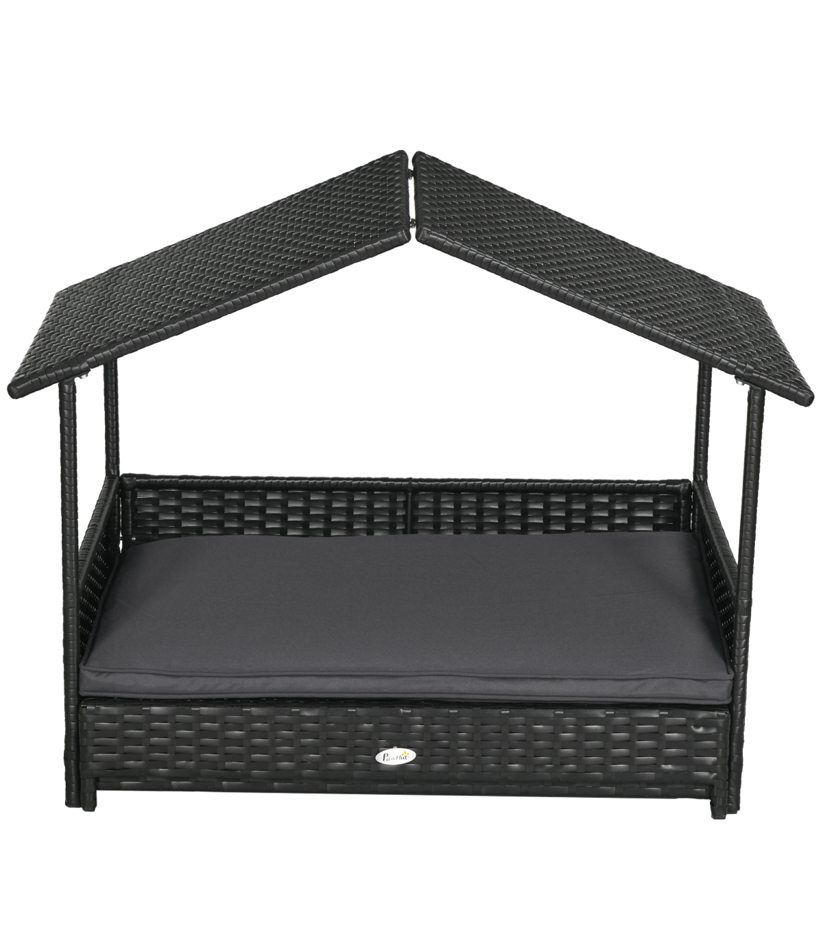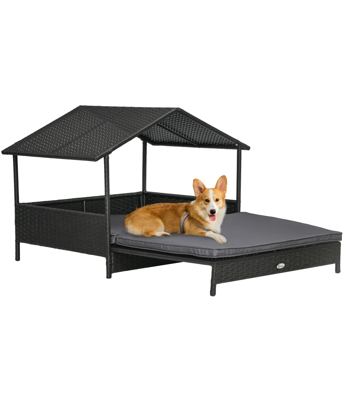 Outdoors, made extra comfortable for pets. This PawHut rattan dog bed offers a spacious resting area, where pets can lay and stretch their body with complete content. Featuring safety railings to keep pets safely on the bed, it also has a protective roof to shade them from the sweltering sun. Plus, its pull-out design at the bottom increases their space - even more room to enjoy. Complete with a cushion and easy-to-clean cover, creating a super snug space for pets to adore.
