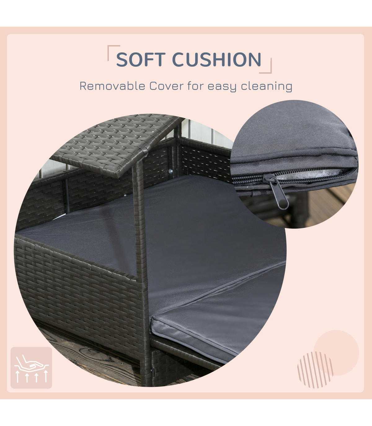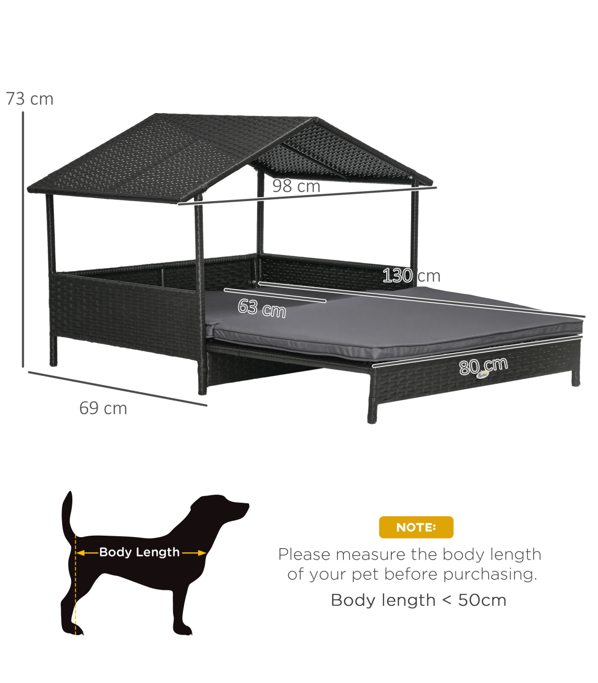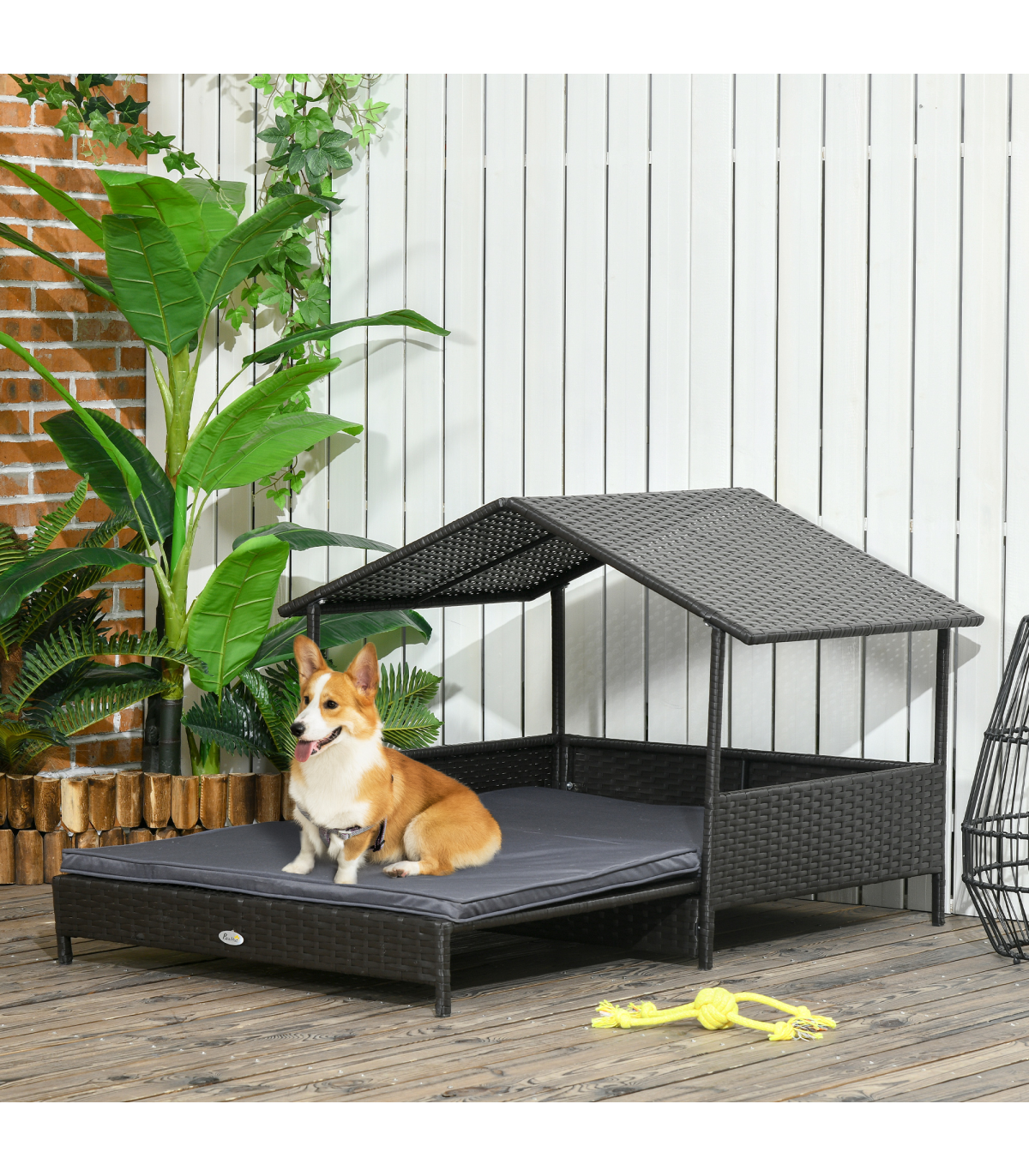 Outdoors, made extra comfortable for pets. This PawHut rattan dog bed offers a spacious resting area, where pets can lay and stretch their body with complete content. Featuring safety railings to keep pets safely on the bed, it also has a protective roof to shade them from the sweltering sun. Plus, its pull-out design at the bottom increases their space - even more room to enjoy. Complete with a cushion and easy-to-clean cover, creating a super snug space for pets to adore.