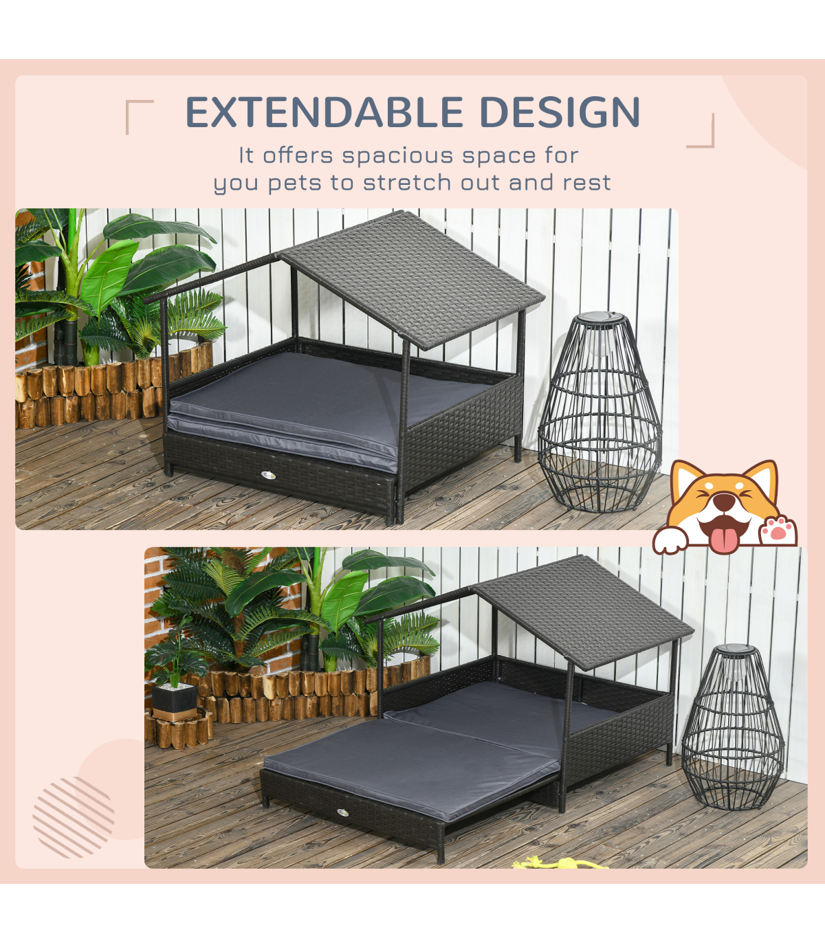 PawHut Extendable Rattan Dog House with Water-Resistant Roof, Cushion - Grey