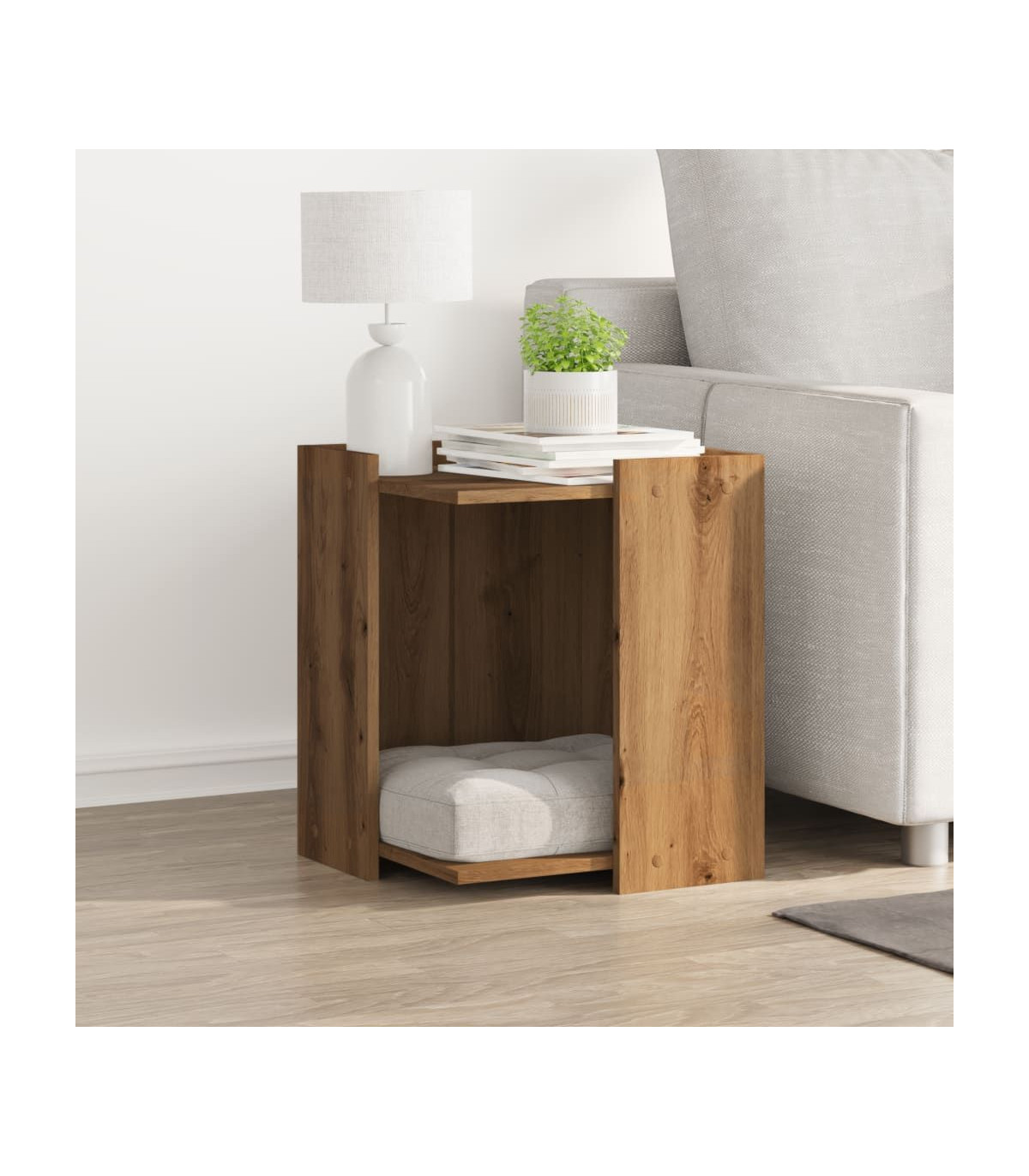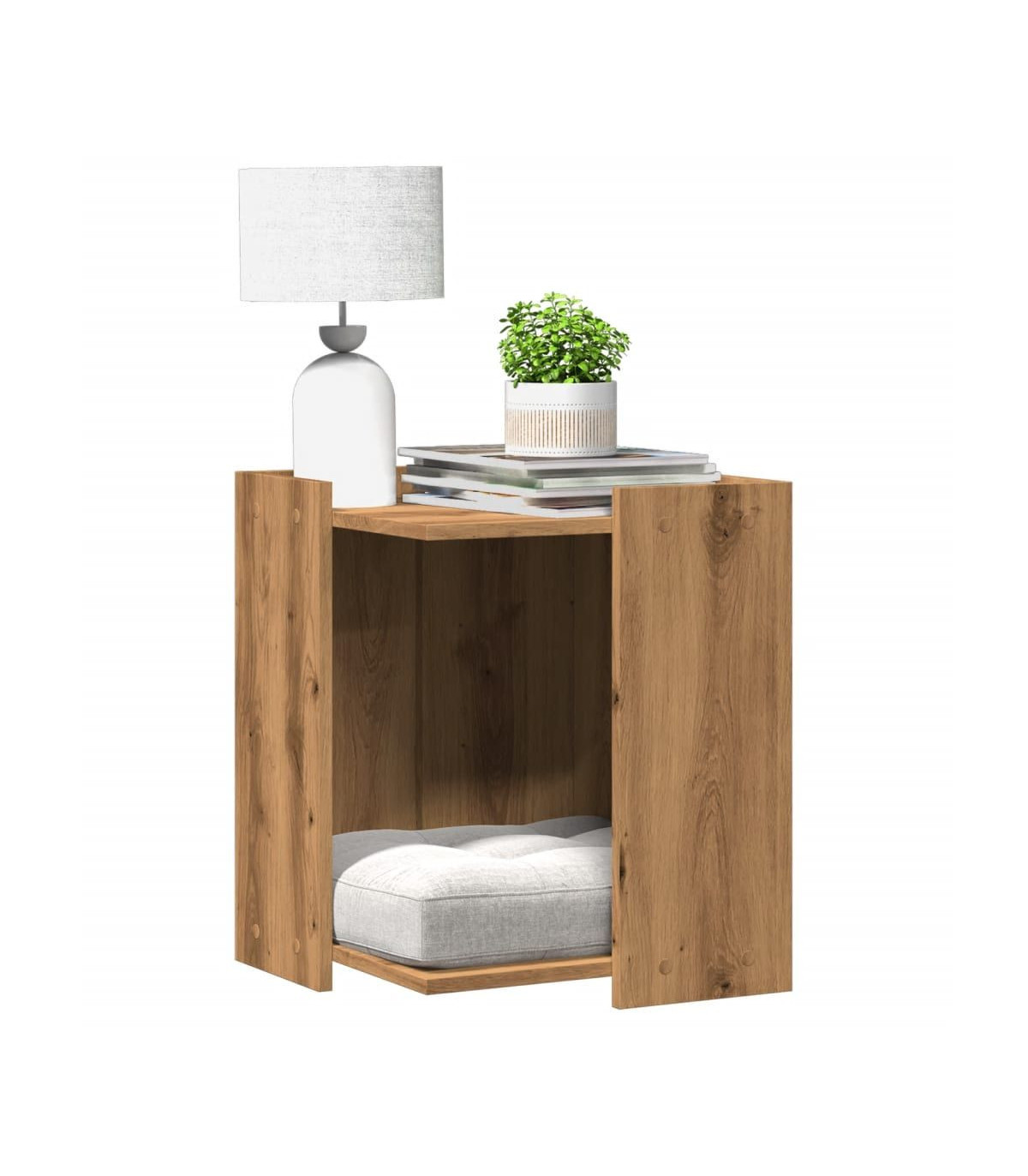 Give your cat a cosy private space with the cat litter box enclosure while keeping the style of your home consistent! Stable and durable material: Engineered wood is a durable and stable material with a smooth surface that is resistant to moisture, warping, and splitting, making it a reliable choice for various projects. Hidden design: This cat litter box enclosure allows you to hide a litter box or cat bed inside, keeping your home tidy and seamlessly blending with your space. Versatile applications: The litter box furniture not only serves as a cosy cat house but also functions as a side table, while the top platform provides an ideal space for displaying photo frames, plants, and other small decorative items. Space-saving design: The compact size and innovative construction make it perfect for small living spaces, as it combines a cat bed with a side table without taking up additional floor area. Easy maintenance: Thanks to its smooth surface, the cat house is easy to clean with a damp cloth and requires less maintenance. Warning:To prevent it from tipping over, this product must be used with the provided wall attachment device. Good to know: The cushion displayed in the image is for illustrative purposes only and is not included in the delivery.Screws and plugs for mounting inside the wall are not included. We advise you to find and use screws and plugs suitable specifically for your walls. If you're not sure, you can consult with a professional. Please read and follow each step of the instructions.