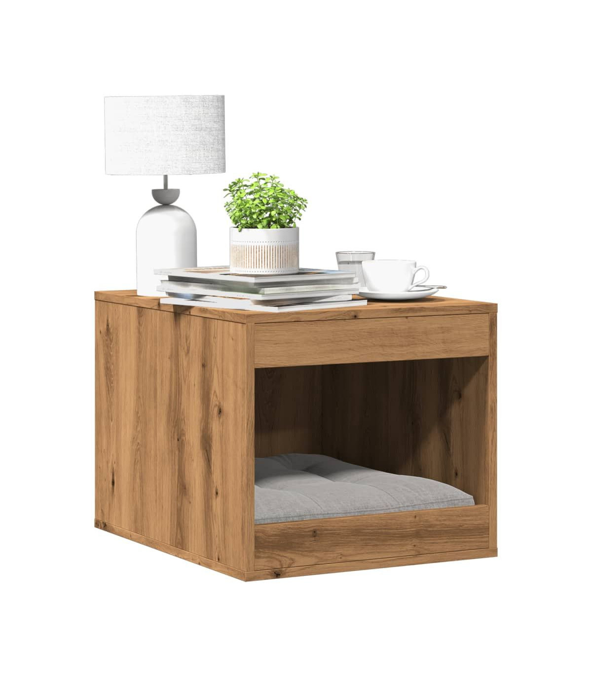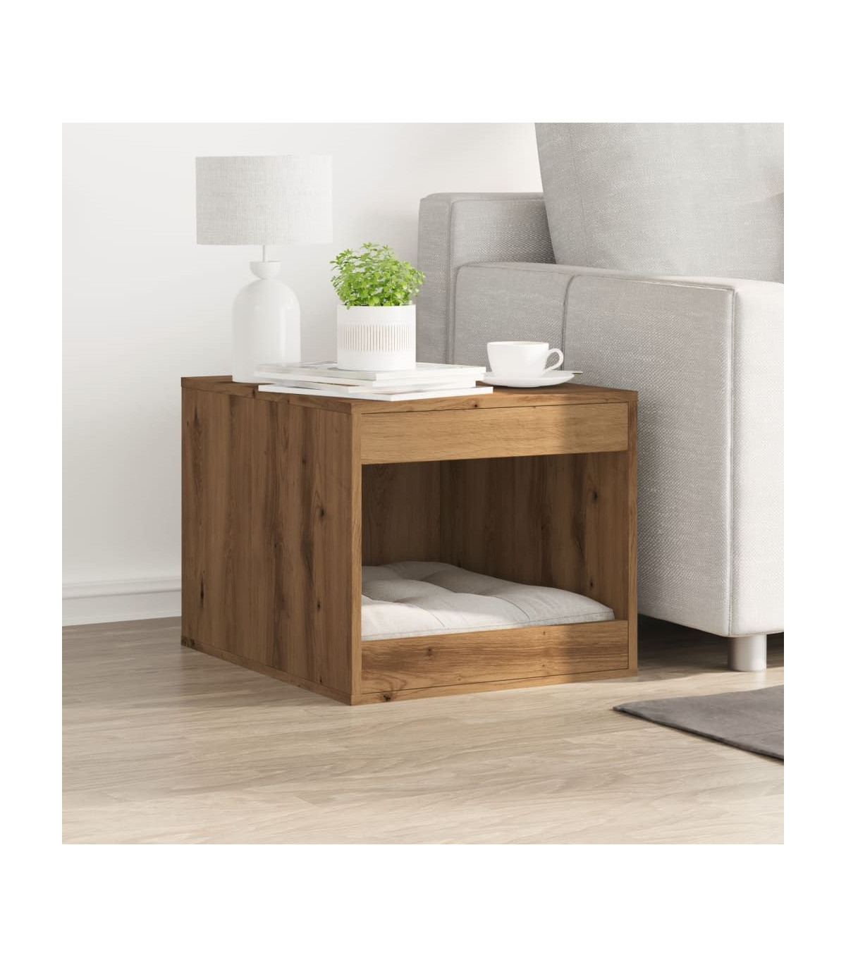 Give your cat a cosy private space with the cat litter box enclosure while keeping the style of your home consistent! Stable and durable material: Engineered wood is a durable and stable material with a smooth surface that is resistant to moisture, warping, and splitting, making it a reliable choice for various projects. Hidden design: This cat litter box enclosure allows you to hide a litter box or cat bed inside, keeping your home tidy and seamlessly blending with your space. Versatile applications: The litter box furniture not only serves as a cosy cat house but also functions as a side table or a practical storage cabinet, while the top platform provides an ideal space for displaying photo frames, plants, and other small decorative items.Easy maintenance: Thanks to its smooth surface, the cat house is easy to clean with a damp cloth and requires less maintenance. Good to know:The cushion displayed in the image is for illustrative purposes only and is not included in the delivery.