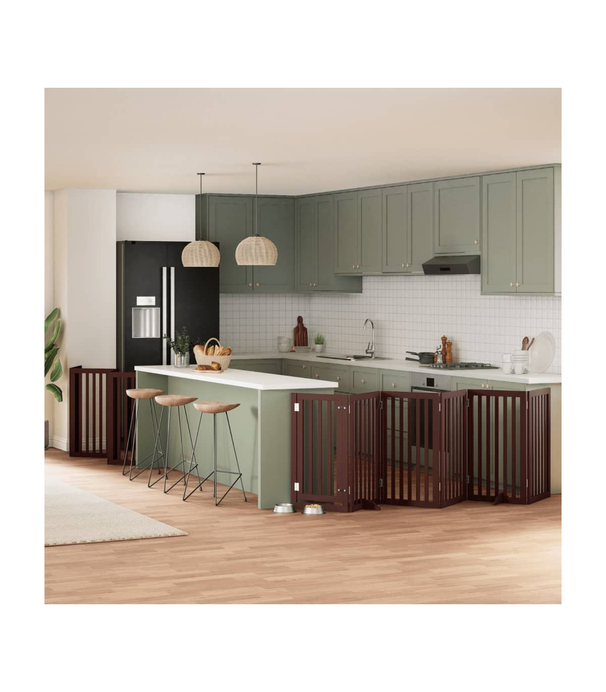 The dog gate puts your pet in a fixed activity area, which can keep your pet safe and prevent you from being disturbed. Durable material: The dog gate is made of poplar wood with water-base paint, making it durable, long-lasting, and easy to clean.Easy to use: The dog gate does not require installation or drilling that doesn't damage your home. This dog gate can be totally foldable when without feet, making it easy to carry and store in the closet or somewhere else.Practical design: The dog gate features two sturdy feet, providing stability and allowing for easy adjustments. Additionally, it includes a door panel and is equipped with locks, providing enhanced security and convenience for both you and your pets.Multiple applications: This dog gate can effectively prevent your pets from jumping over and getting through. Therefore, it is perfect for keeping your pets safe in the living room, kitchen, stairs, and doorway.