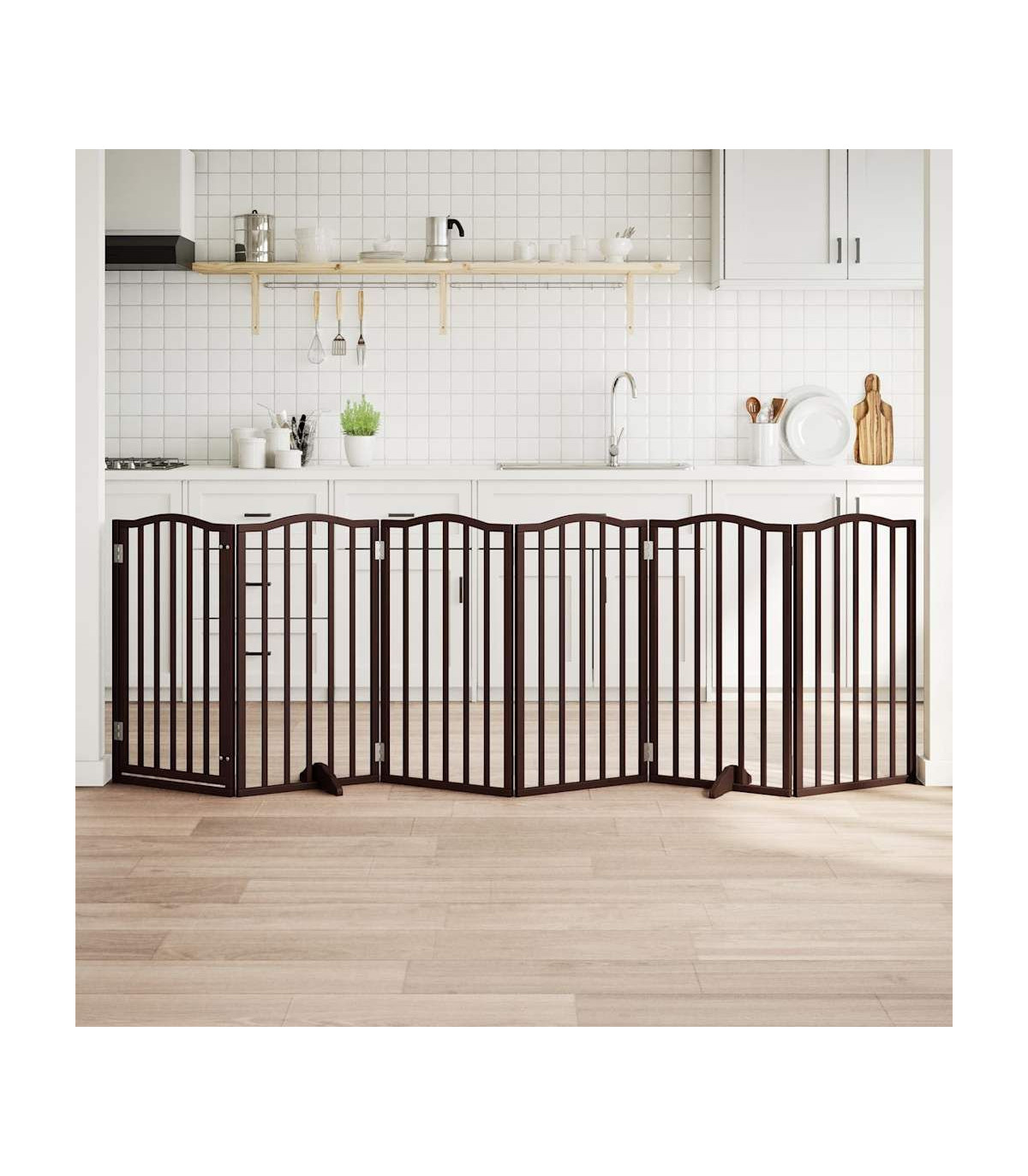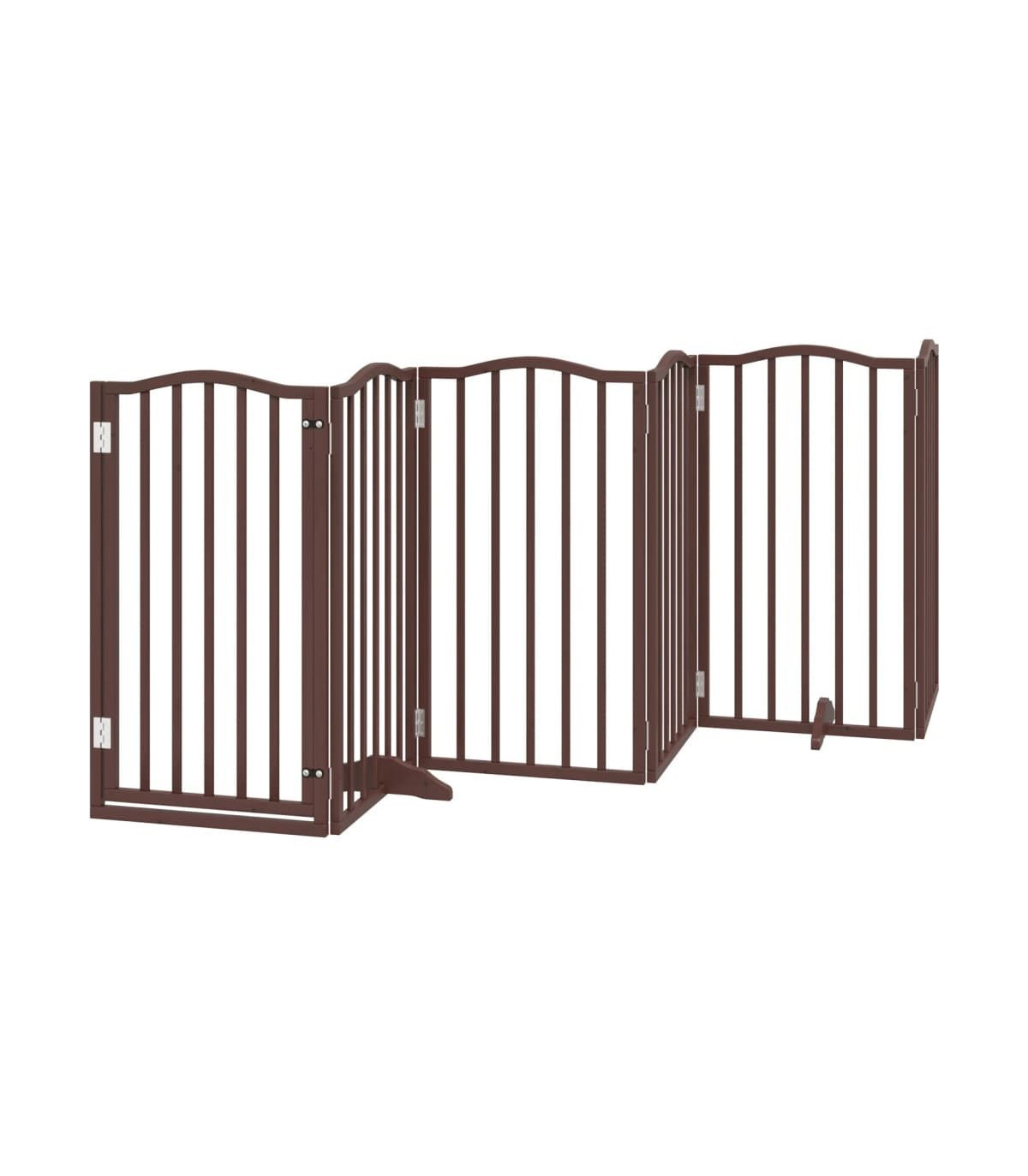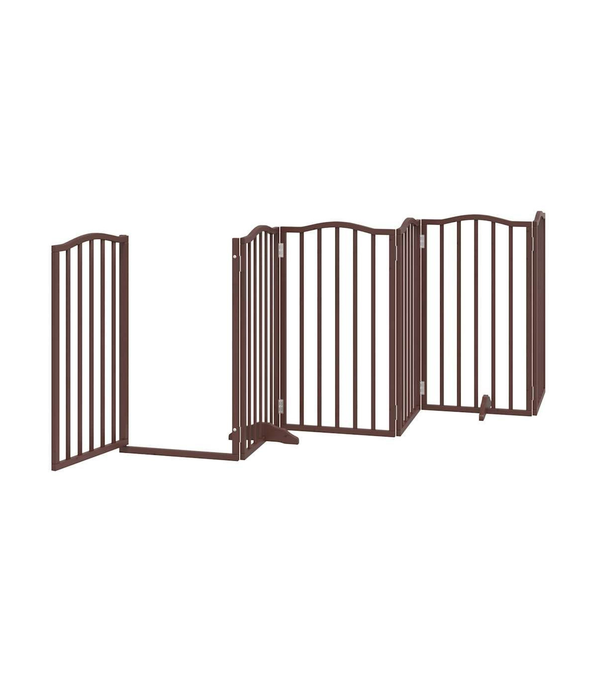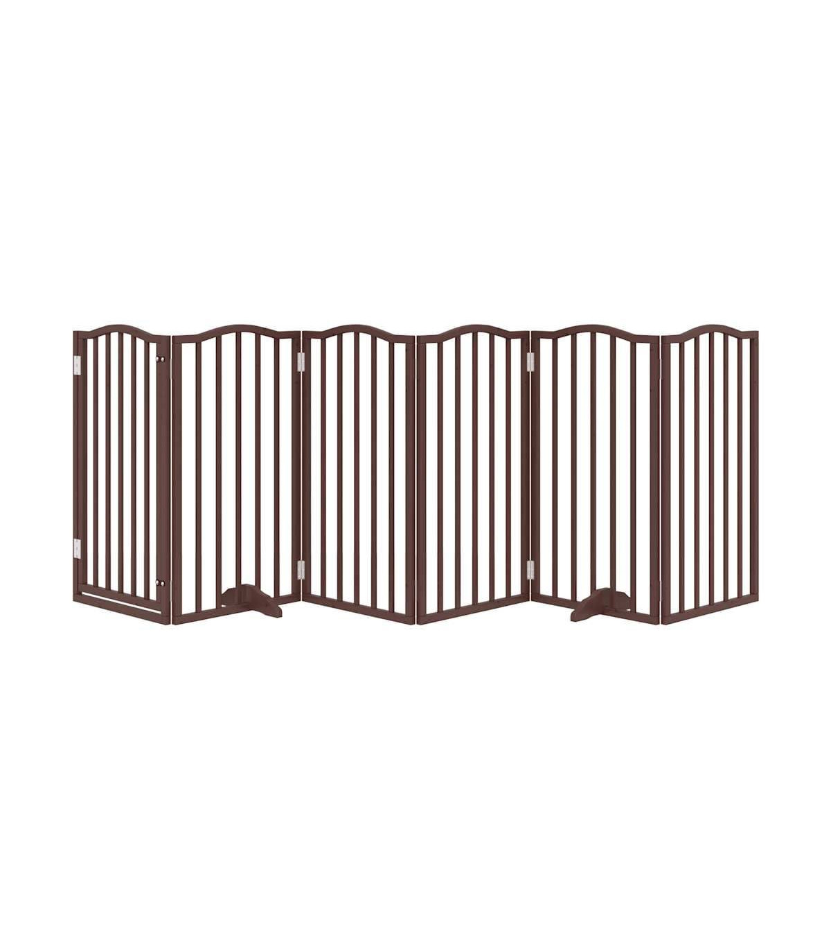 The dog gate puts your pet in a fixed activity area, which can keep your pet safe and prevent you from being disturbed.Durable material: The dog gate is made of poplar wood with water-base paint, making it durable, long-lasting, and easy to clean.Easy to use: The dog gate does not require installation or drilling that doesn't damage your home. This dog gate can be totally foldable when without feet, making it easy to carry and store in the closet or somewhere else.Practical design: The dog gate features two sturdy feet, providing stability and allowing for easy adjustments. Additionally, it includes a door panel and is equipped with locks, providing enhanced security and convenience for both you and your pets.Multiple applications: This dog gate can effectively prevent your pets from jumping over and getting through. Therefore, it is perfect for keeping your pets safe in the living room, kitchen, stairs, and doorway.