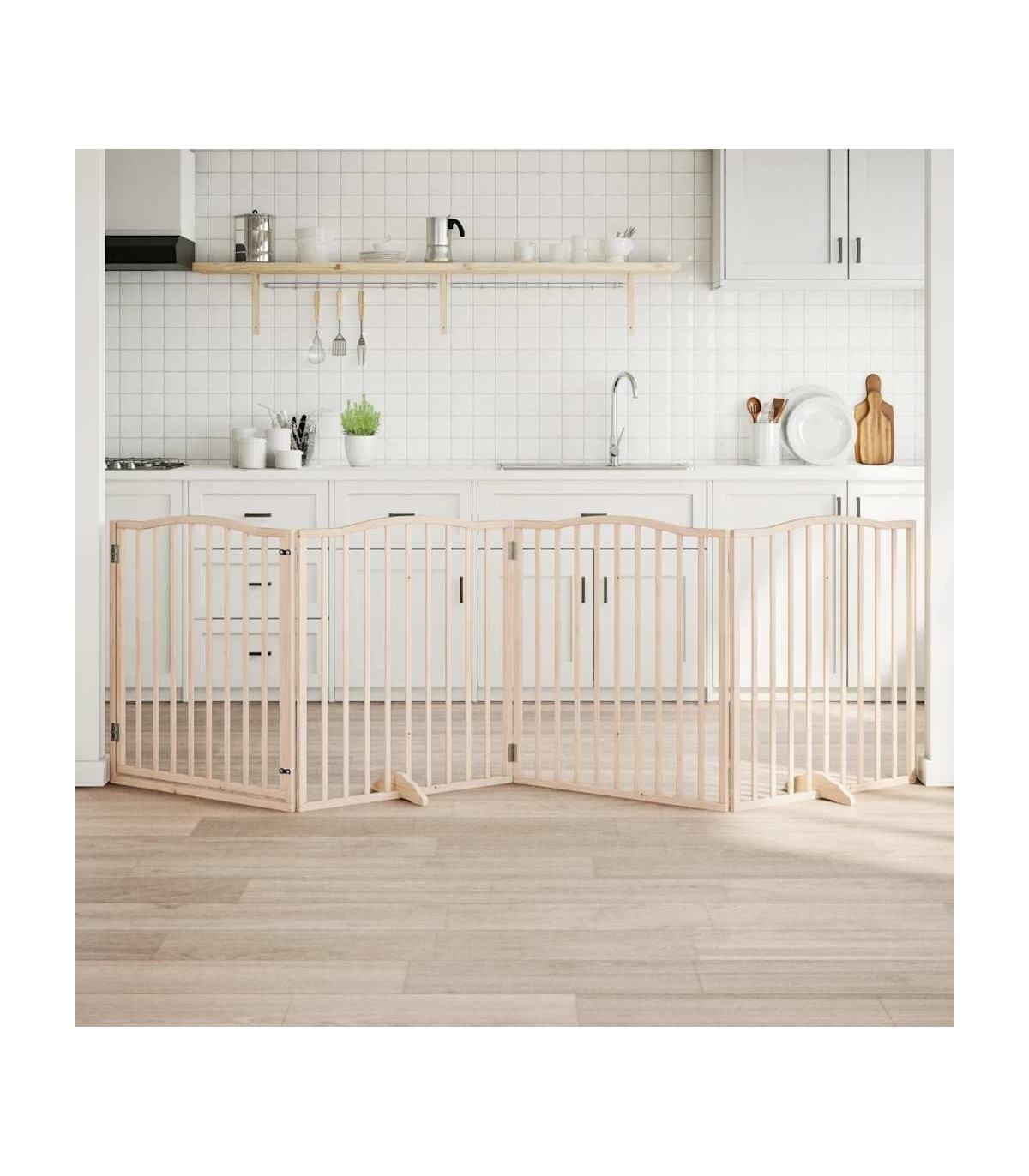 The dog gate puts your pet in a fixed activity area, which can keep your pet safe and prevent you from being disturbed.Durable material: The dog gate is made of poplar wood with water-base paint, making it durable, long-lasting, and easy to clean.Easy to use: The dog gate does not require installation or drilling that doesn't damage your home. This dog gate can be totally foldable when without feet, making it easy to carry and store in the closet or somewhere else.Practical design: The dog gate features two sturdy feet, providing stability and allowing for easy adjustment. Additionally, it includes a door panel and is equipped with locks, providing enhanced security and convenience for both you and your pets.Multiple applications: This dog gate can effectively prevent your pets from jumping over and getting through. Therefore, it is perfect for keeping your pets safe in the living room, kitchen, stairs, and doorway.