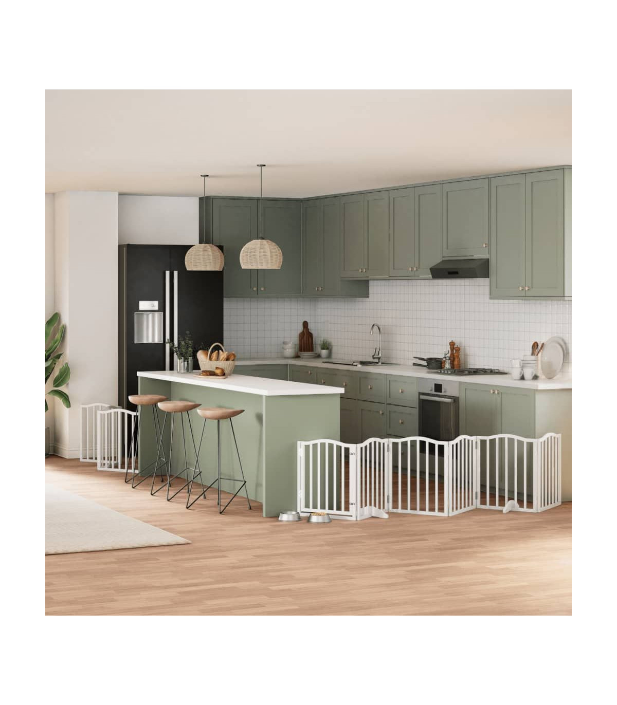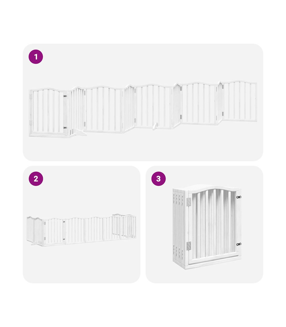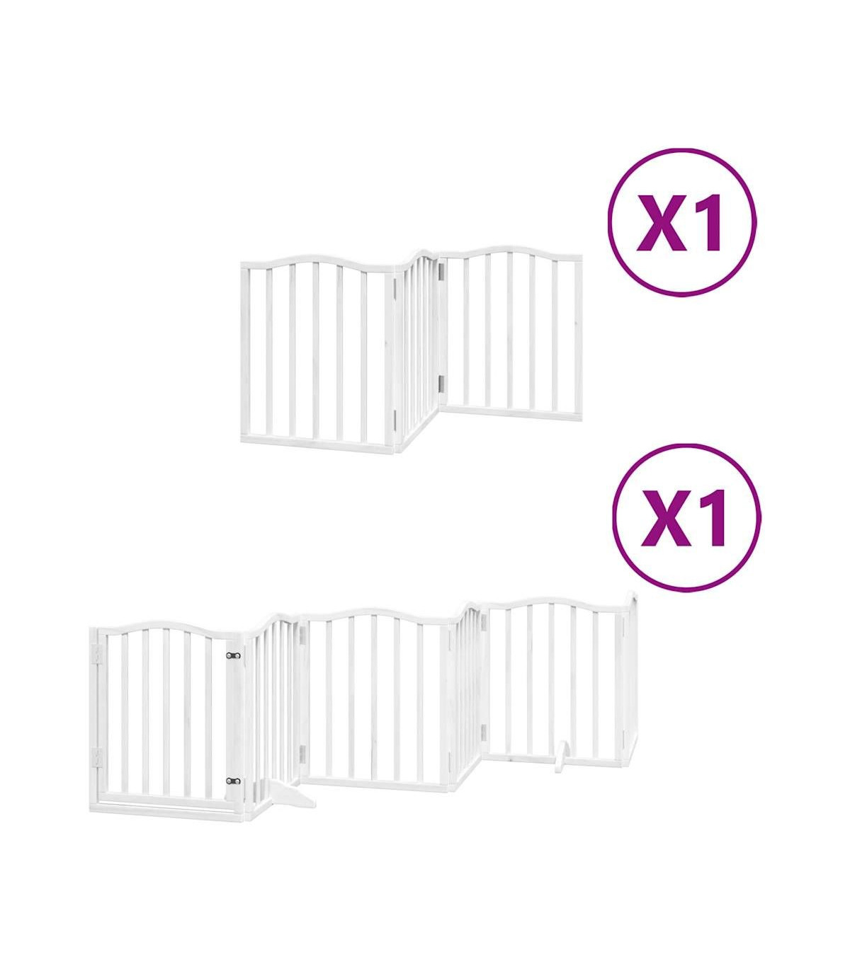 The dog gate puts your pet in a fixed activity area, which can keep your pet safe and prevent you from being disturbed. Durable material: The dog gate is made of poplar wood with water-base paint, making it durable, long-lasting, and easy to clean. Easy to use: The dog gate does not require installation or drilling that doesn't damage your home. This dog gate can be totally foldable when without feet, making it easy to carry and store in the closet or somewhere else. Practical design: The dog gate features two sturdy feet, providing stability and allowing for easy adjustments. Additionally, it includes a door panel and is equipped with locks, providing enhanced security and convenience for both you and your pets. Multiple applications: This dog gate can effectively prevent your pets from jumping over and getting through. Therefore, it is perfect for keeping your pets safe in the living room, kitchen, stairs, and doorway.