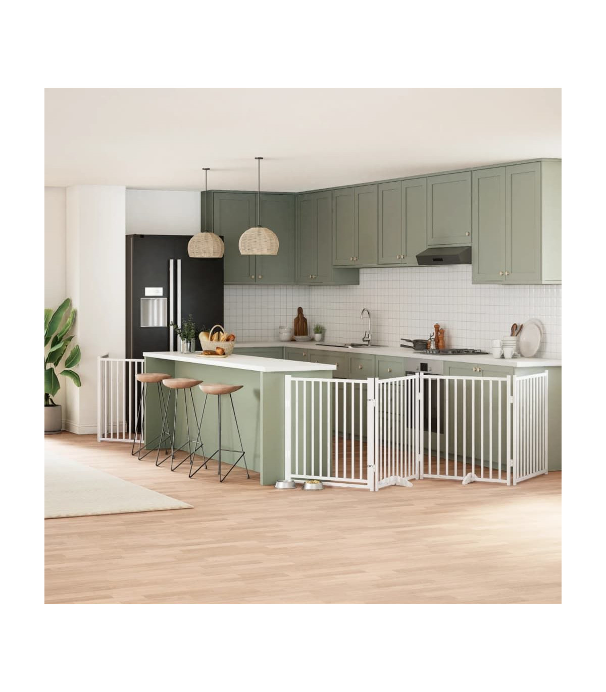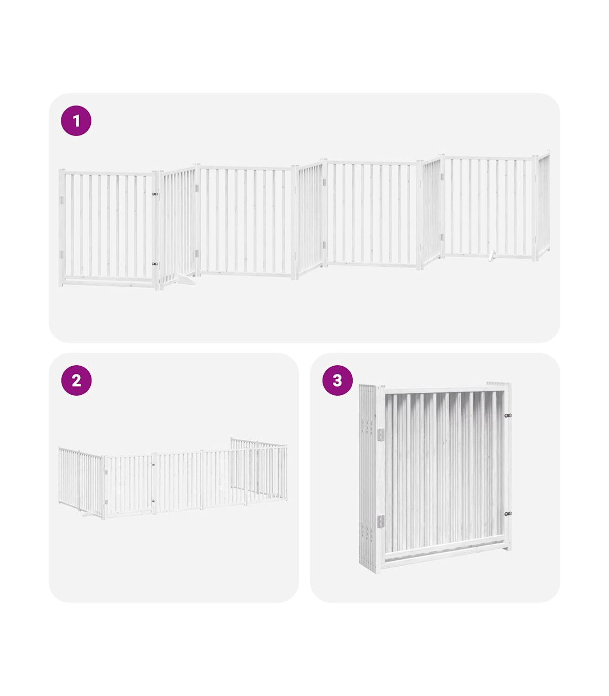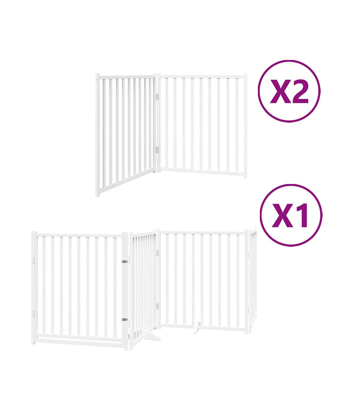 The dog gate puts your pet in a fixed activity area, which can keep your pet safe and prevent you from being disturbed. Durable material: The dog gate is made of poplar wood with water-base paint, making it durable, long-lasting, and easy to clean. Easy to use: The dog gate does not require installation or drilling that doesn't damage your home. This dog gate can be totally foldable when without feet, making it easy to carry and store in the closet or somewhere else. Practical design: The dog gate features two sturdy feet, providing stability and allowing for easy adjustments. Additionally, it includes a door panel and is equipped with locks, providing enhanced security and convenience for both you and your pets. Multiple applications: This dog gate can effectively prevent your pets from jumping over and getting through. Therefore, it is perfect for keeping your pets safe in the living room, kitchen, stairs, and doorway.