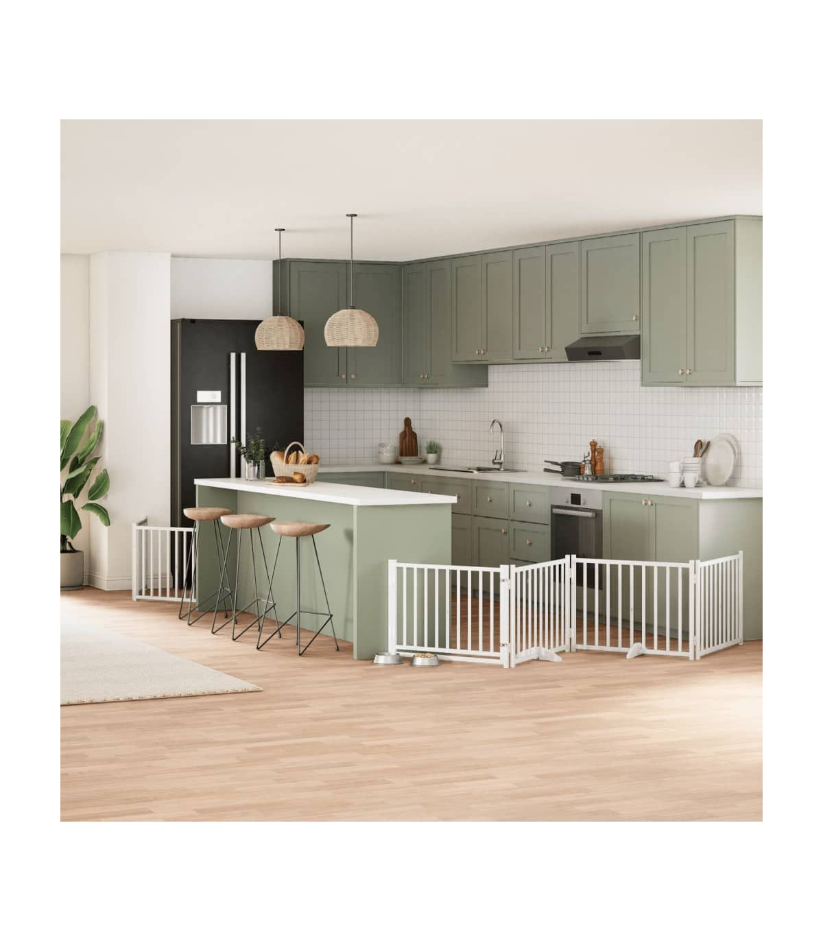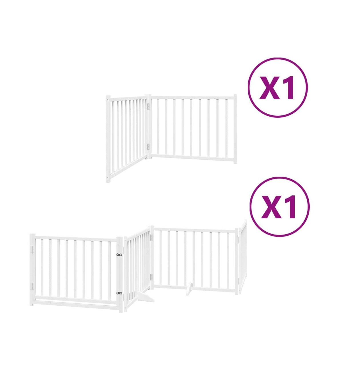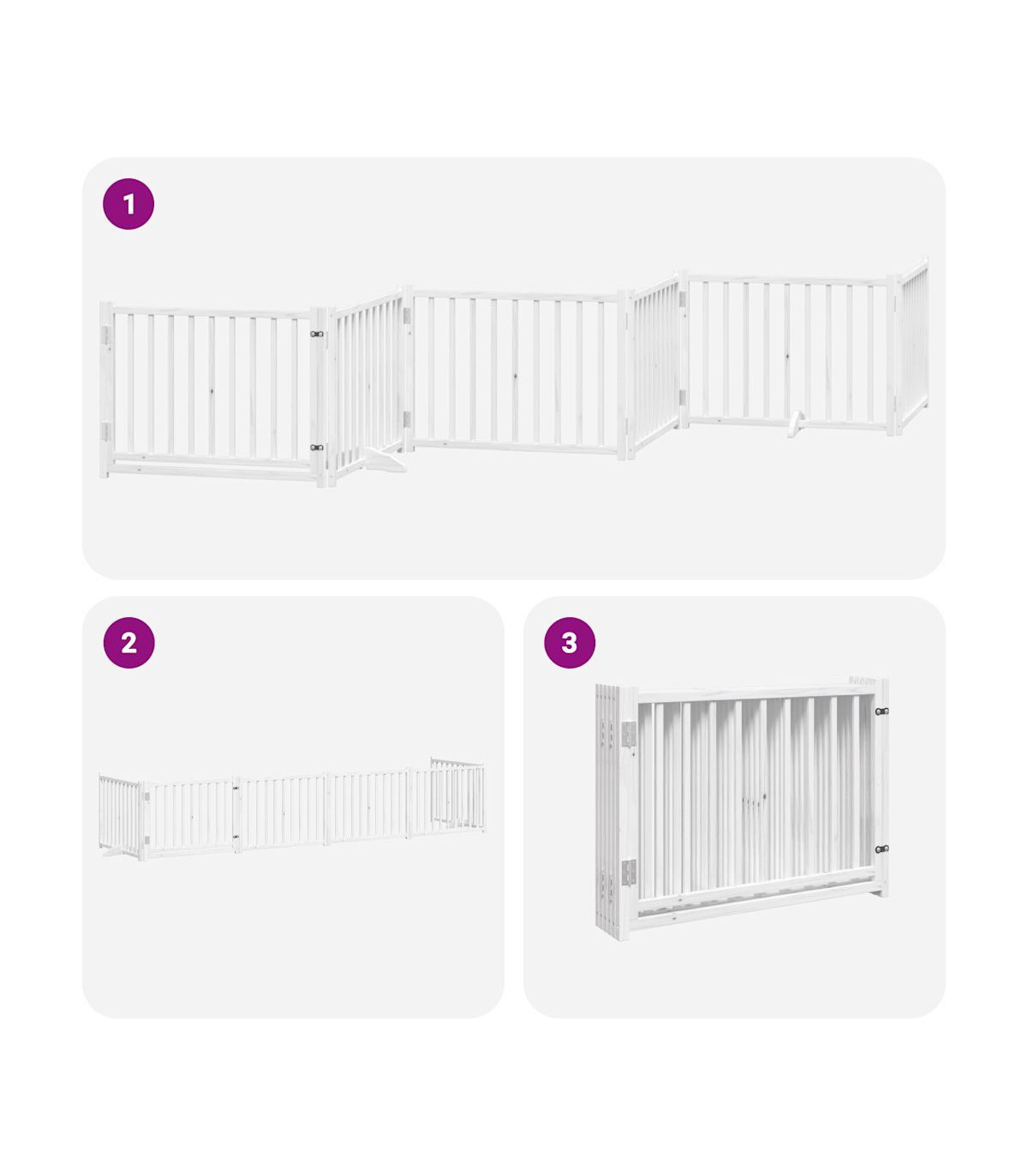 The dog gate puts your pet in a fixed activity area, which can keep your pet safe and prevent you from being disturbed. Durable material: The dog gate is made of poplar wood with water-base paint, making it durable, long-lasting, and easy to clean. Easy to use: The dog gate does not require installation or drilling that doesn't damage your home. This dog gate can be totally foldable when without feet, making it easy to carry and store in the closet or somewhere else. Practical design: The dog gate features two sturdy feet, providing stability and allowing for easy adjustments. Additionally, it includes a door panel and is equipped with locks, providing enhanced security and convenience for both you and your pets. Multiple applications: This dog gate can effectively prevent your pets from jumping over and getting through. Therefore, it is perfect for keeping your pets safe in the living room, kitchen, stairs, and doorway.